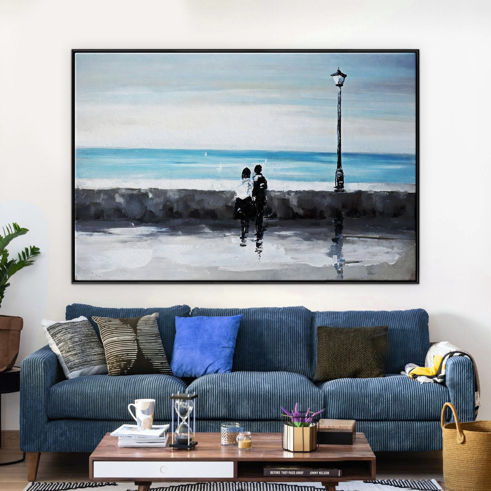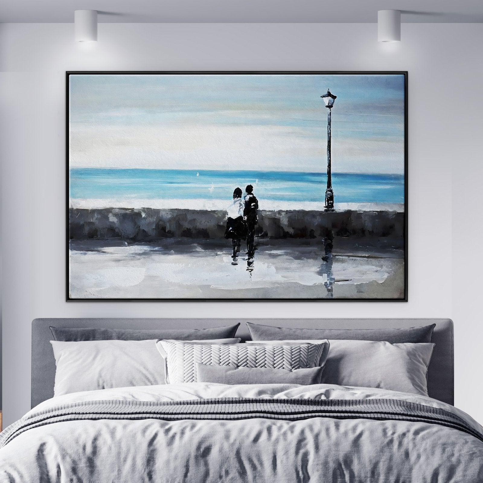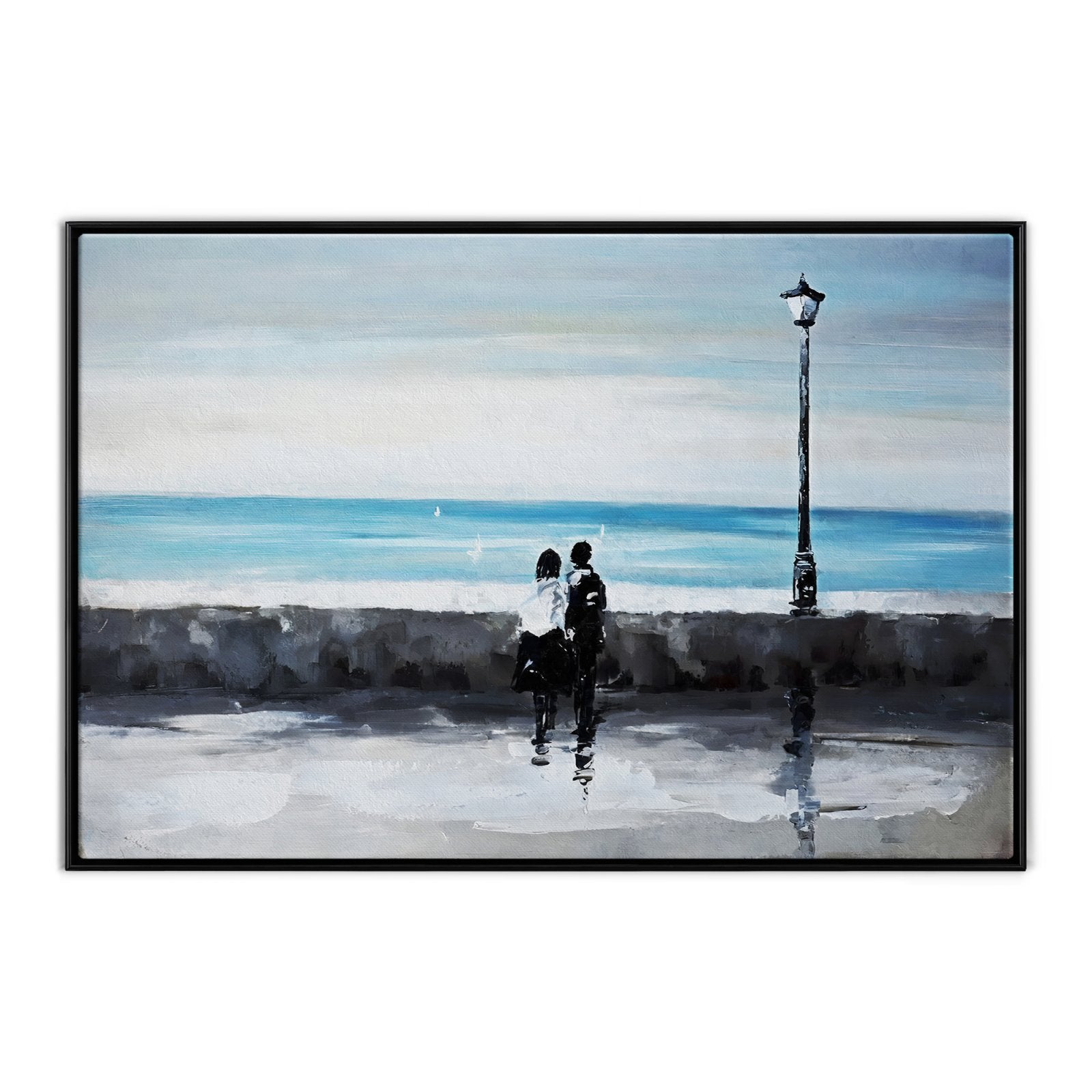Mit dem Meer als Hintergrund und ihren Herzen als Kompass stehen zwei liebende Menschen beisammen und blicken in die Ferne. Dieses melancholische Kunstwerk bringt die Schönheit der Küste in einem romantischen Stil zu dir nach Hause.