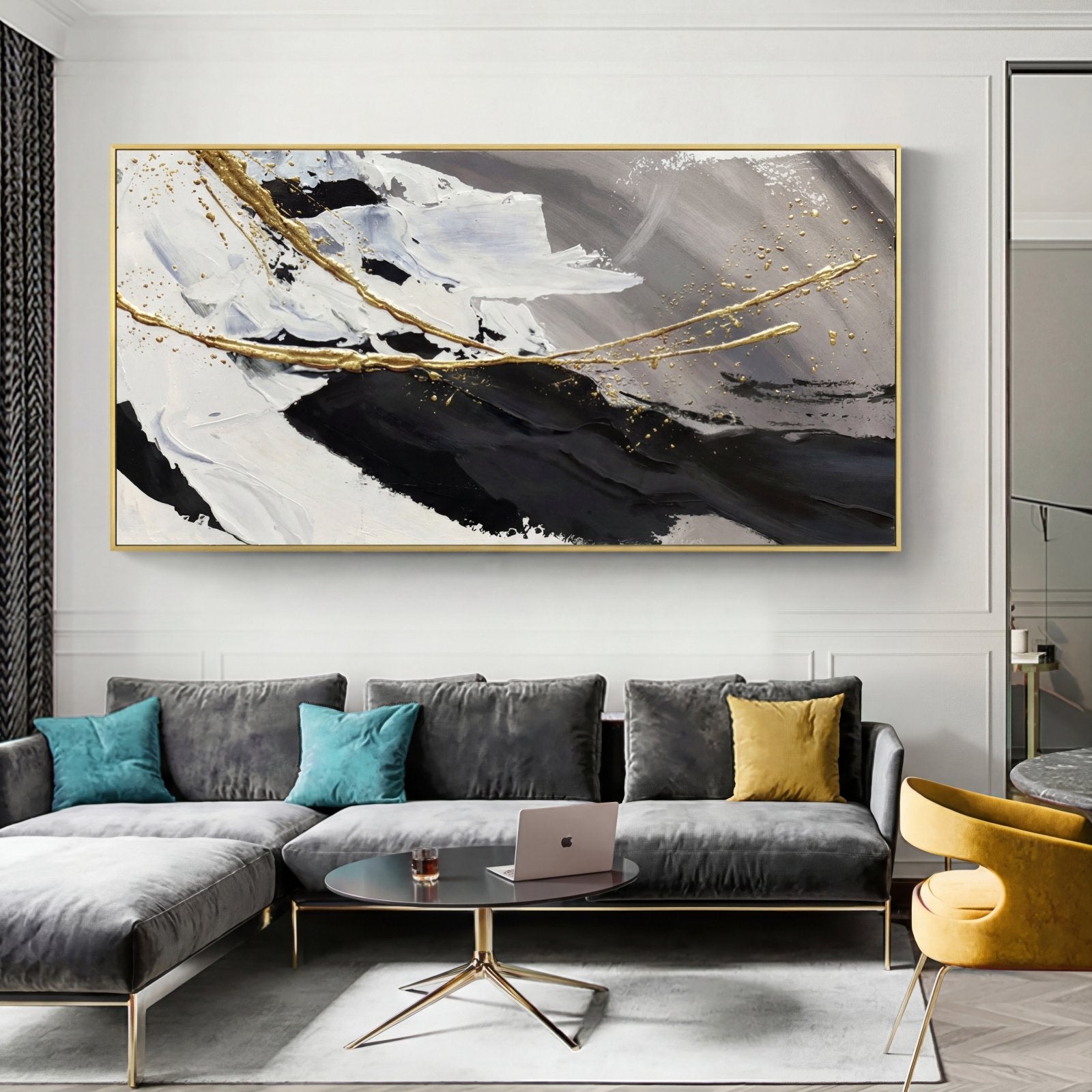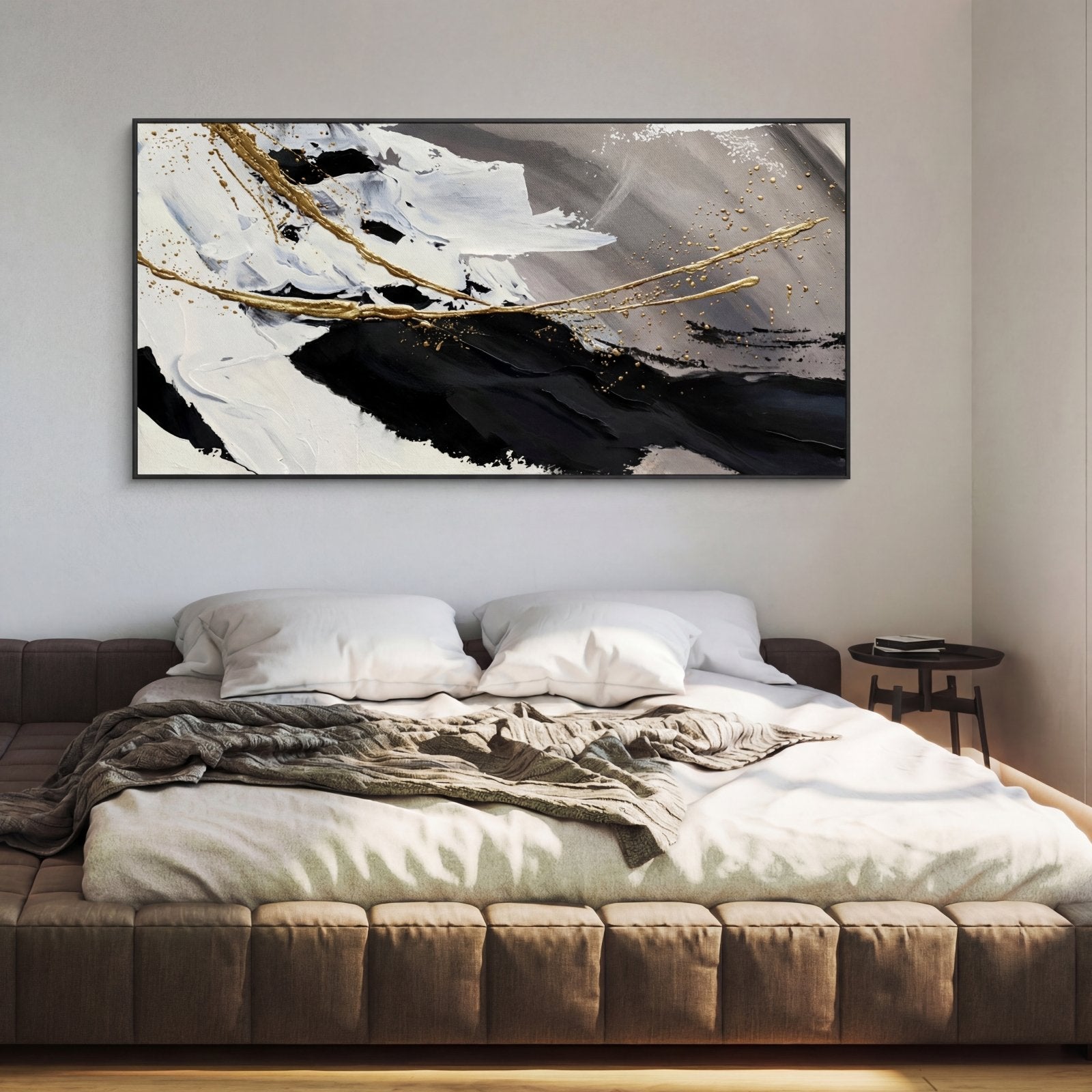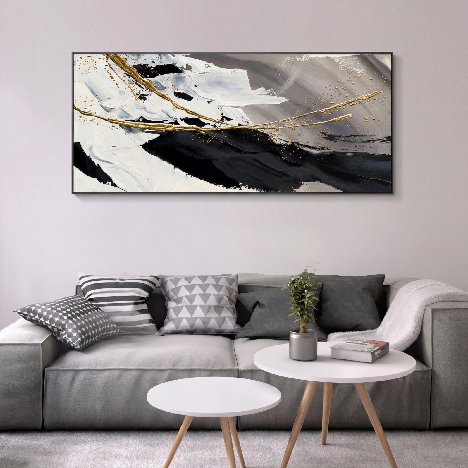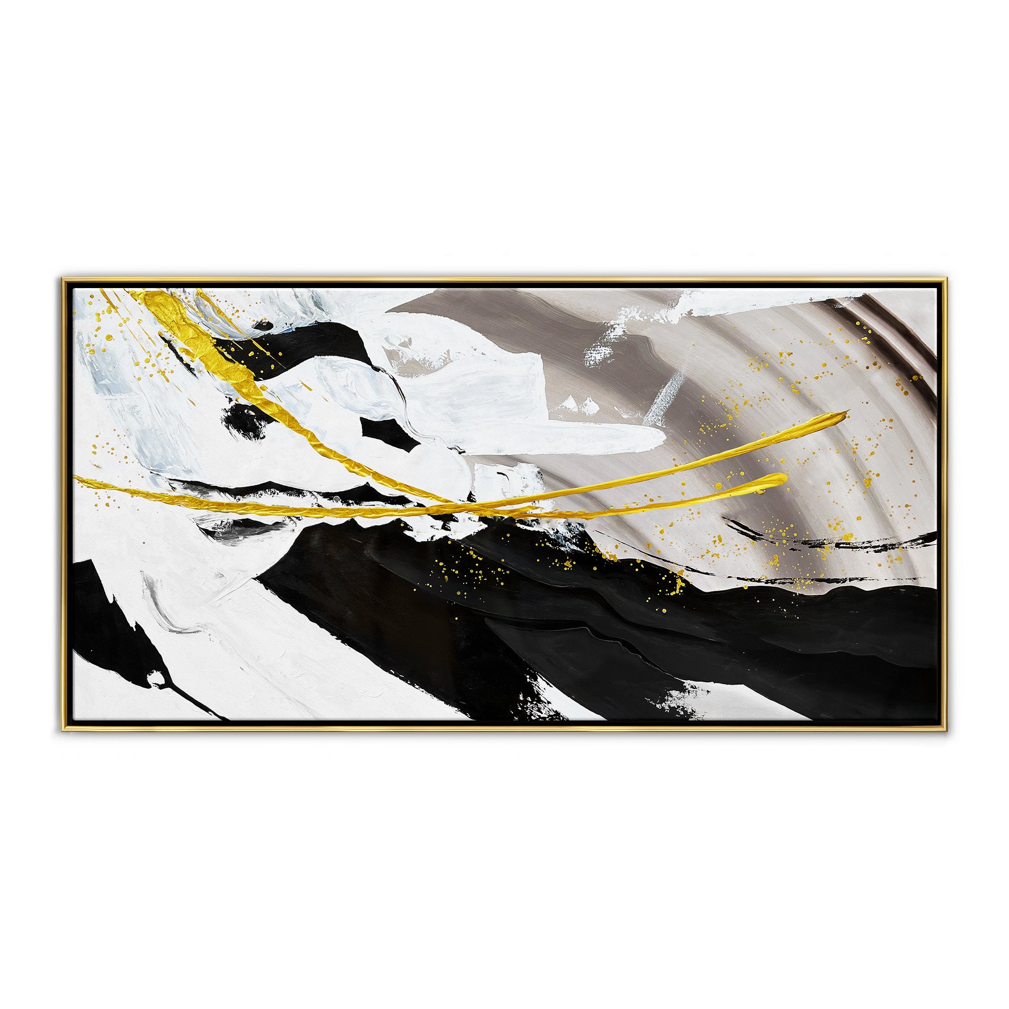 Diese erstaunliche schwarz-weiße Welle zeigt die Kraft und Unerbittlichkeit des Ozeans durch die Verwendung von zwei goldenen, waagerechten Strichen. Dieses Gemälde ist lebendig und wirkt wie eine sich bewegende, mächtige, majestätische Welle.