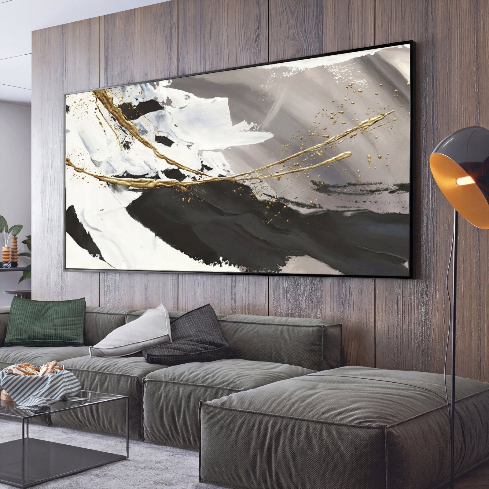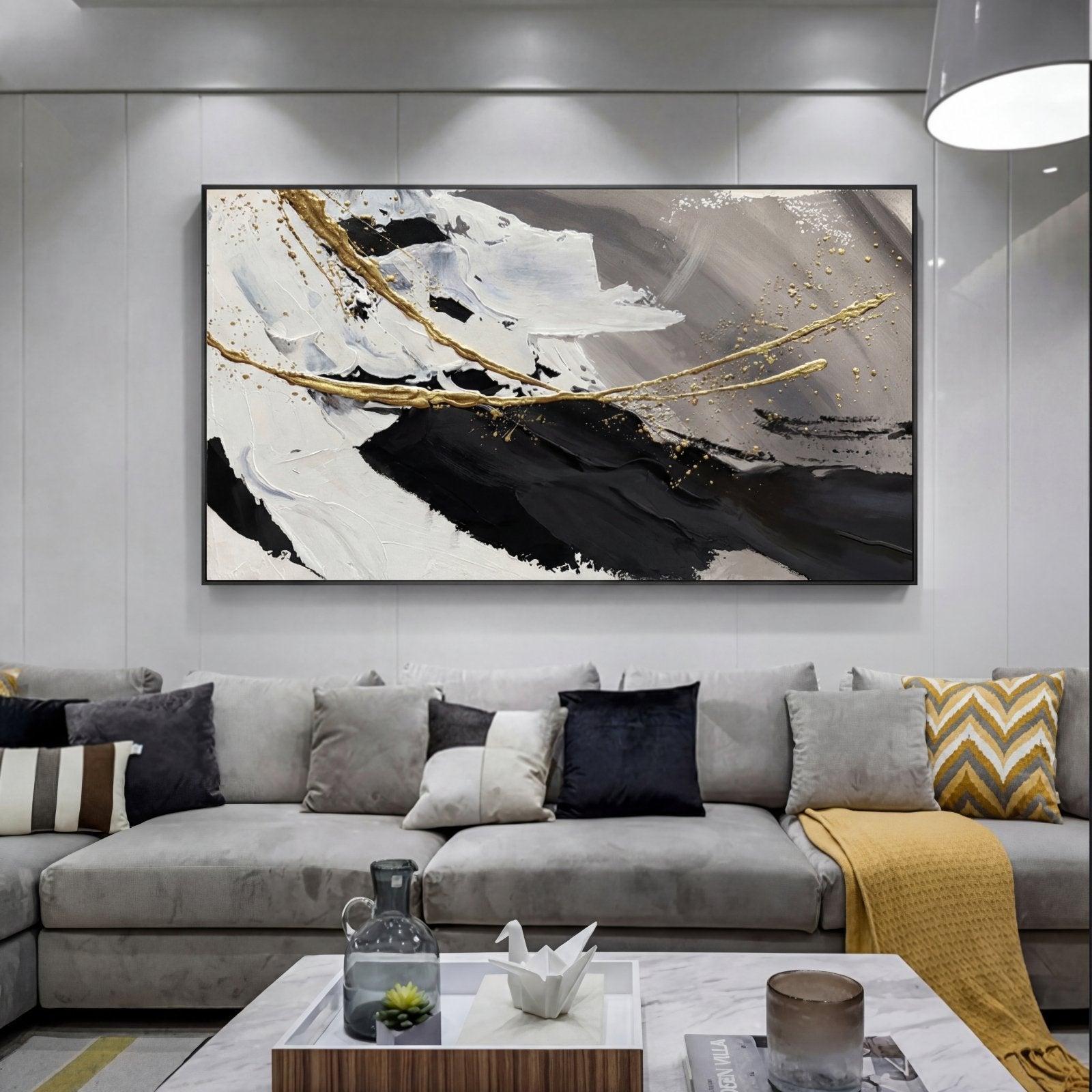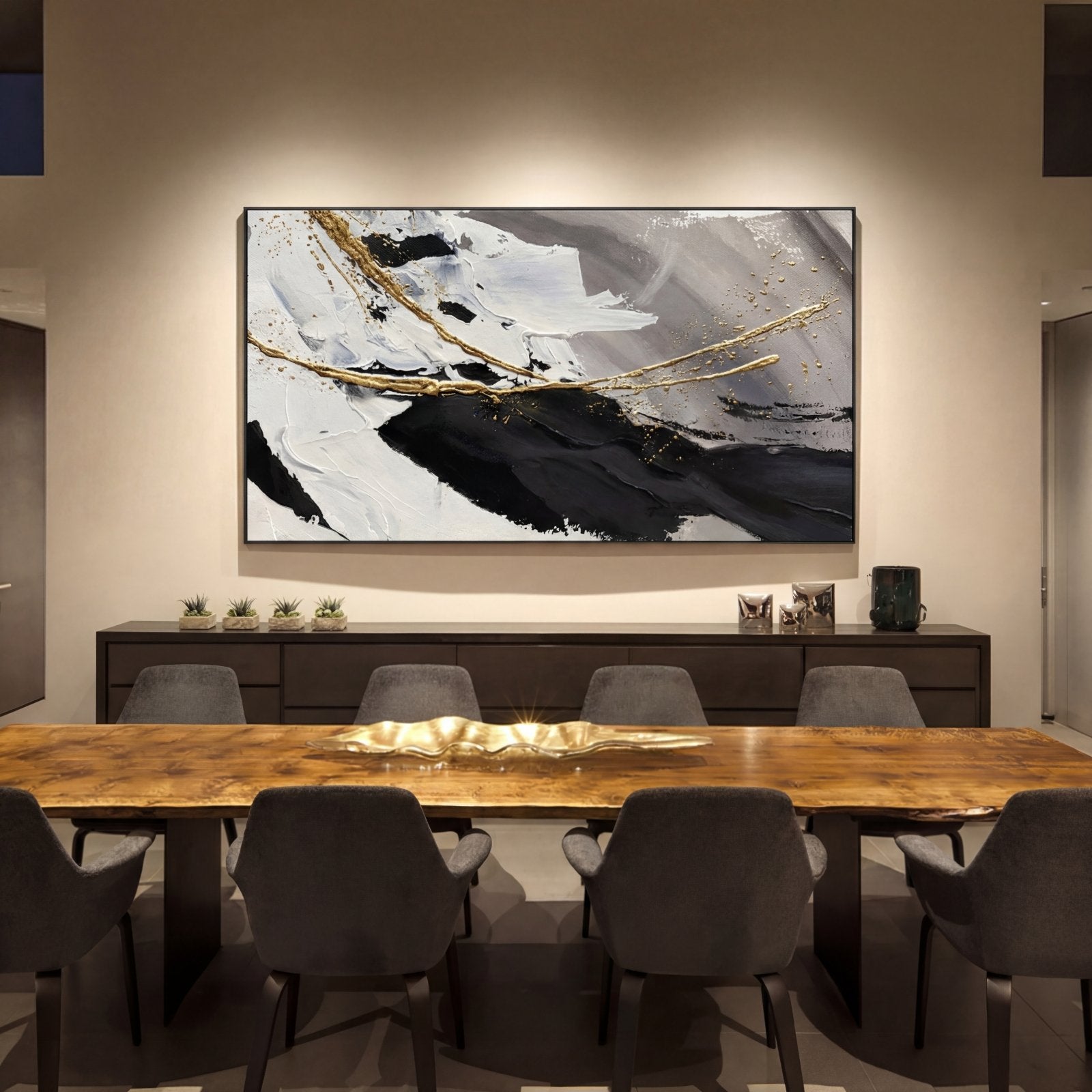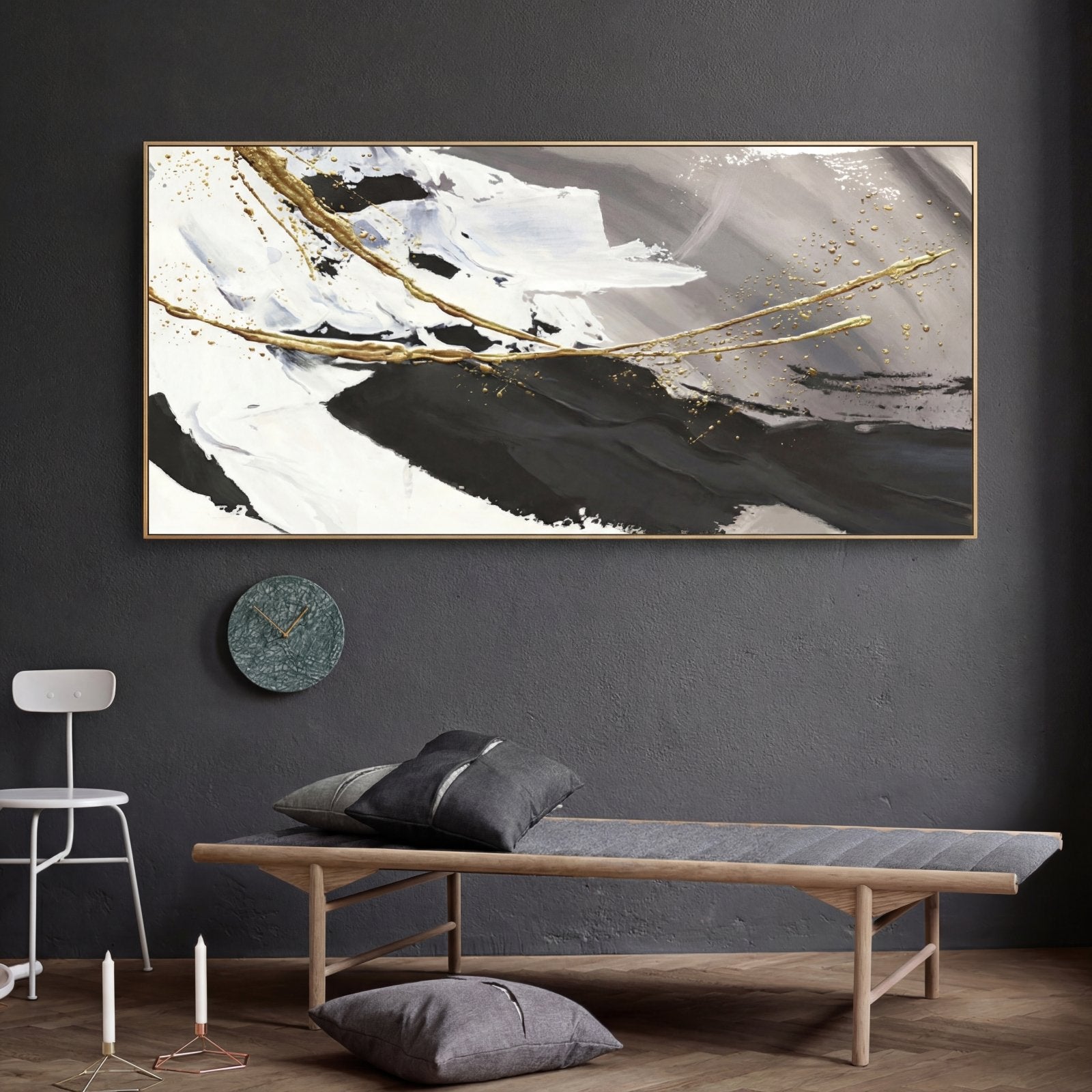 Diese erstaunliche schwarz-weiße Welle zeigt die Kraft und Unerbittlichkeit des Ozeans durch die Verwendung von zwei goldenen, waagerechten Strichen. Dieses Gemälde ist lebendig und wirkt wie eine sich bewegende, mächtige, majestätische Welle.