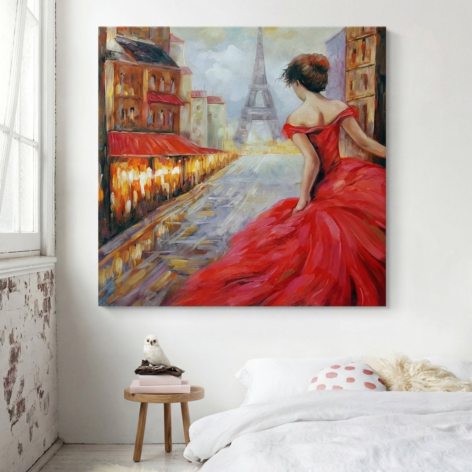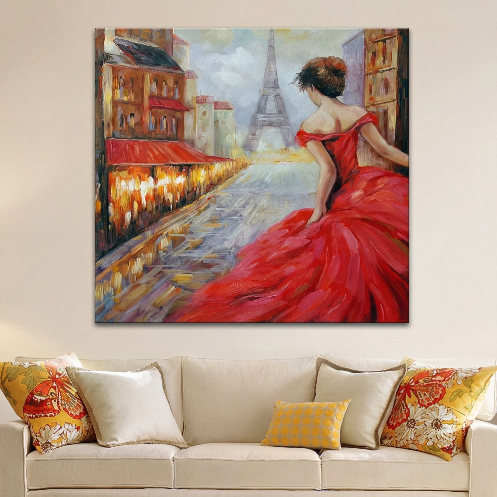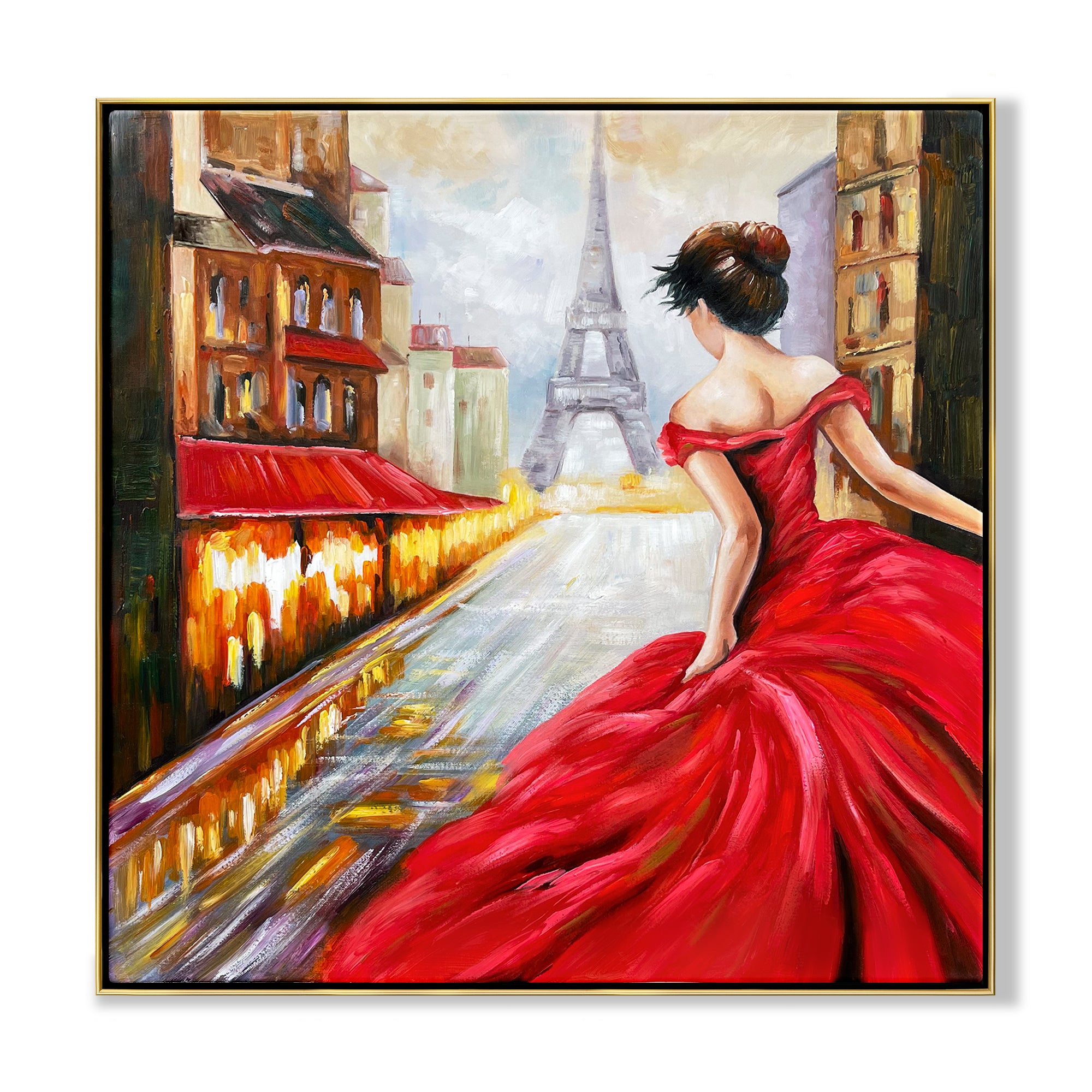 Inspirada en la calle más famosa de París, ¡esta obra de arte de estilo realista está aquí para robarte el corazón! Con exuberantes colores rojos y una impresionante composición con la Torre Eiffel en el centro, ¡esta pieza te acerca mucho al París real!