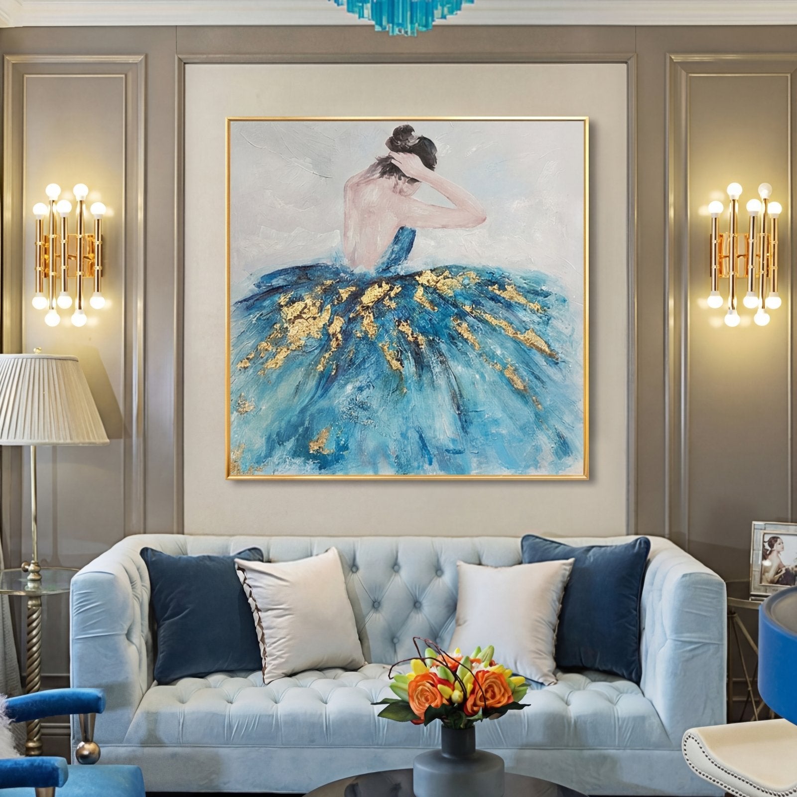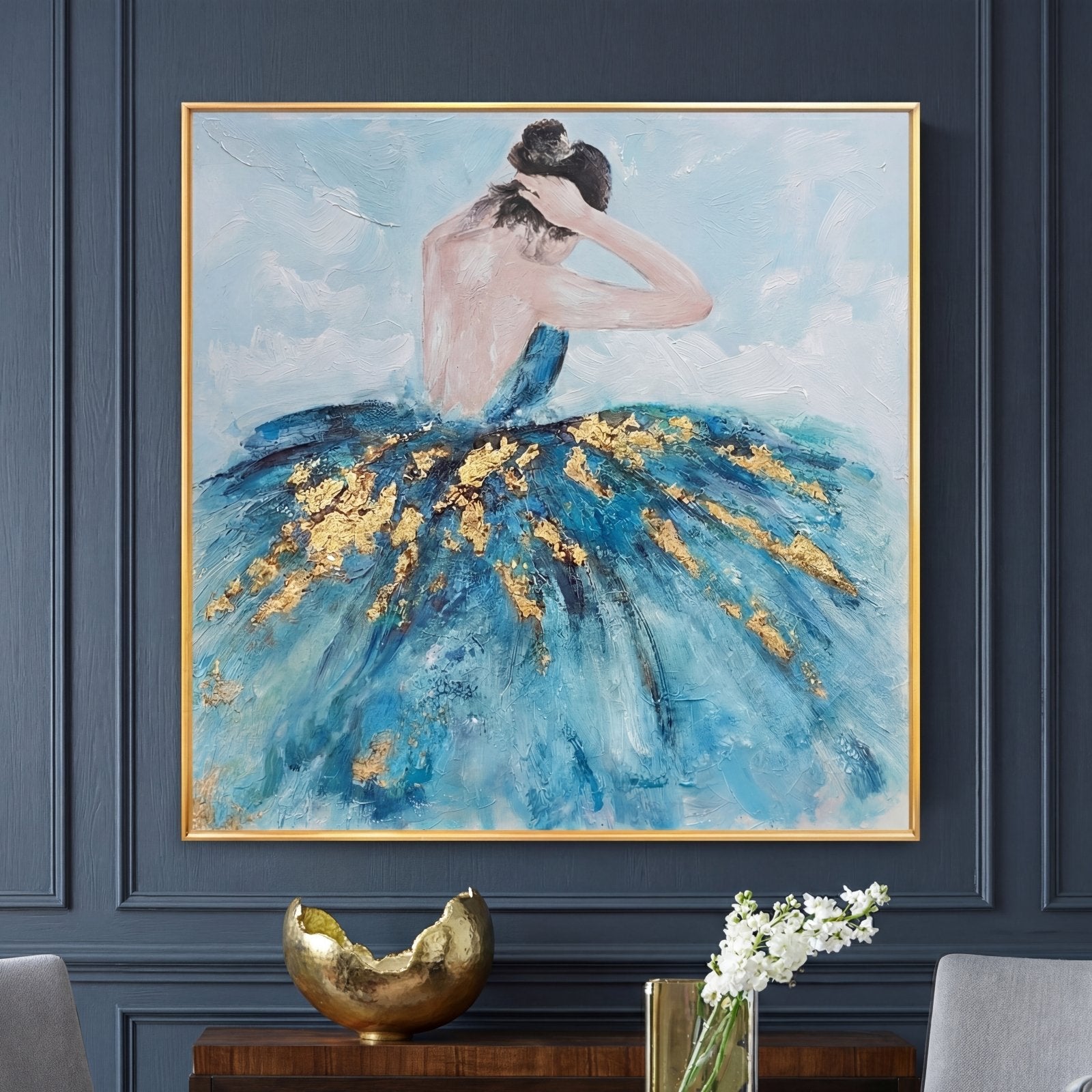 No poder ver el rostro de la bella bailarina envuelve este cuadro de misterio y curiosidad... ¿Quién es ella? ¿Cuál es su historia? Su impresionante vestido azul se mezcla elegantemente con manchas doradas de pintura, ¡lo que le da a esta increíble obra de arte aún más sofisticación y delicadeza!
