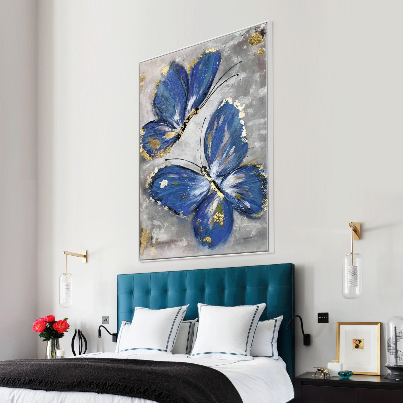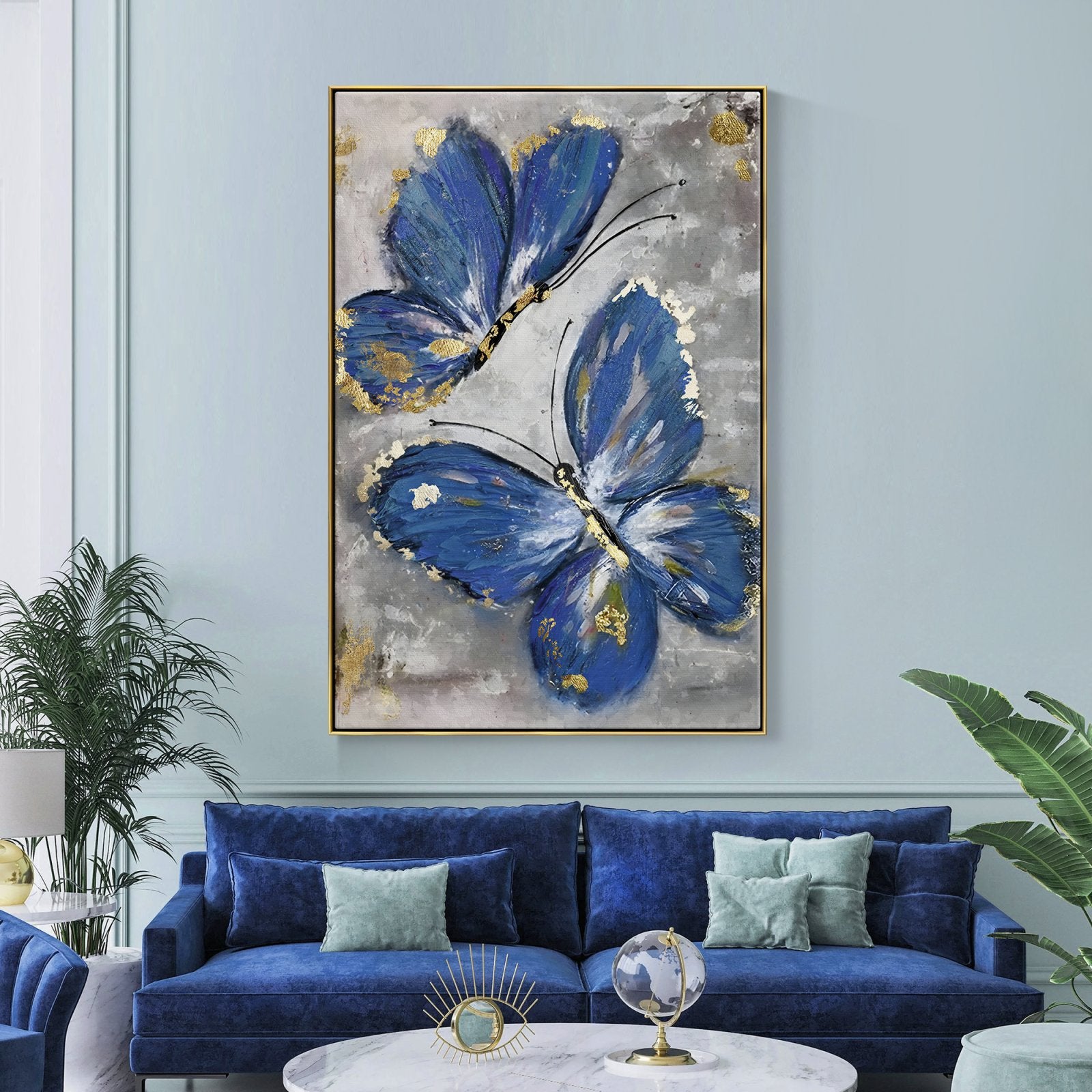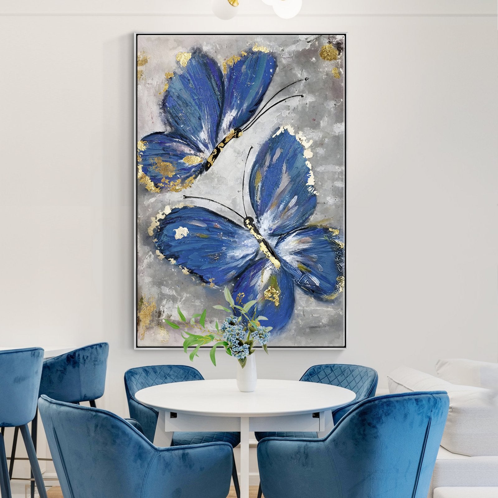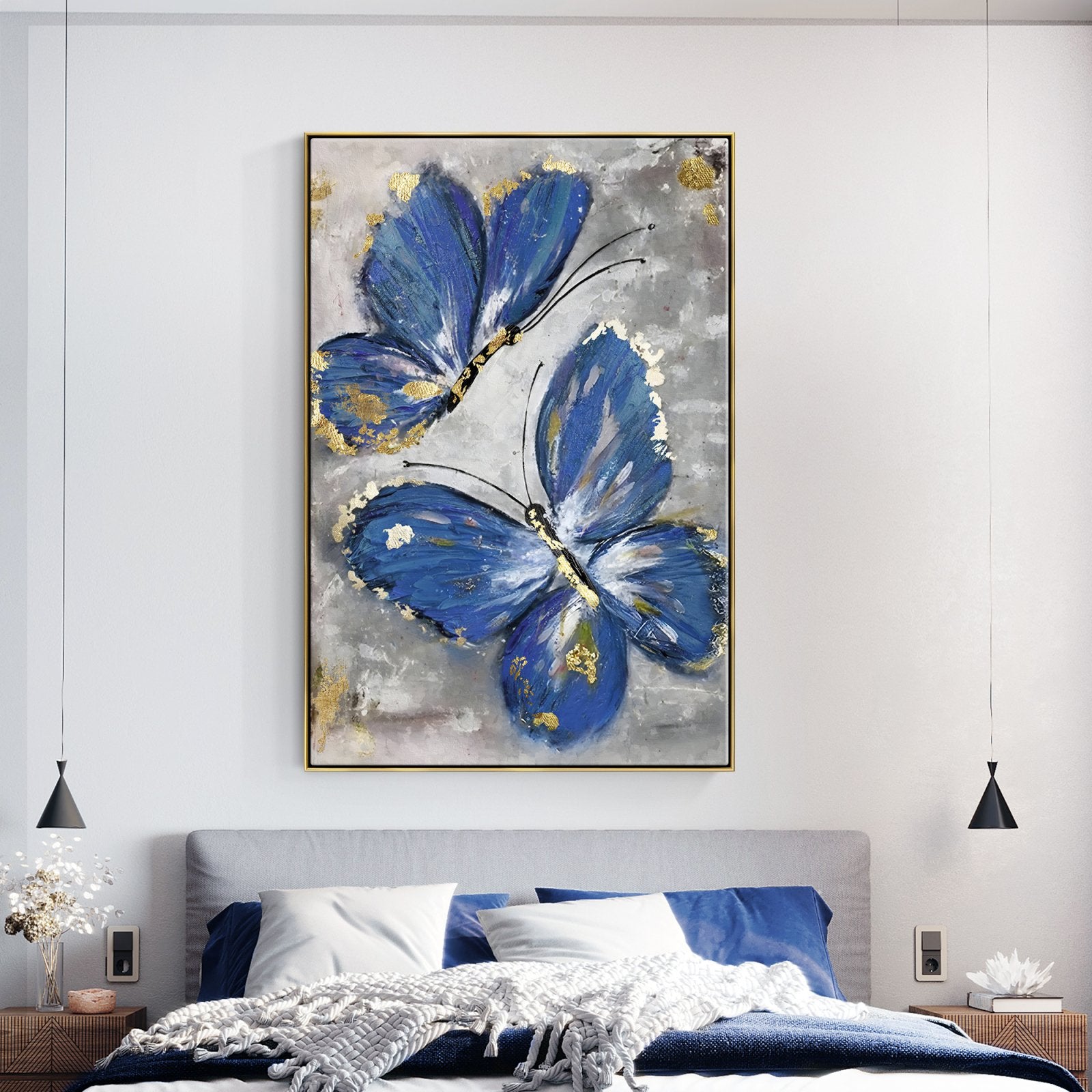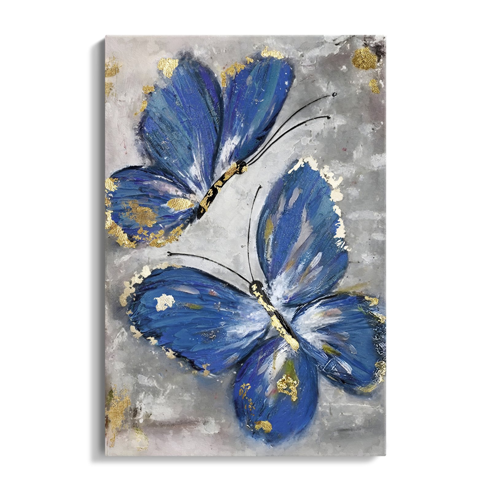 Esta pintura, "Mariposas Azules", es un ejemplo perfecto de ello. Dos mariposas azules revolotean al viento, con sus alas doradas y blancas, creando una hermosa composición.
