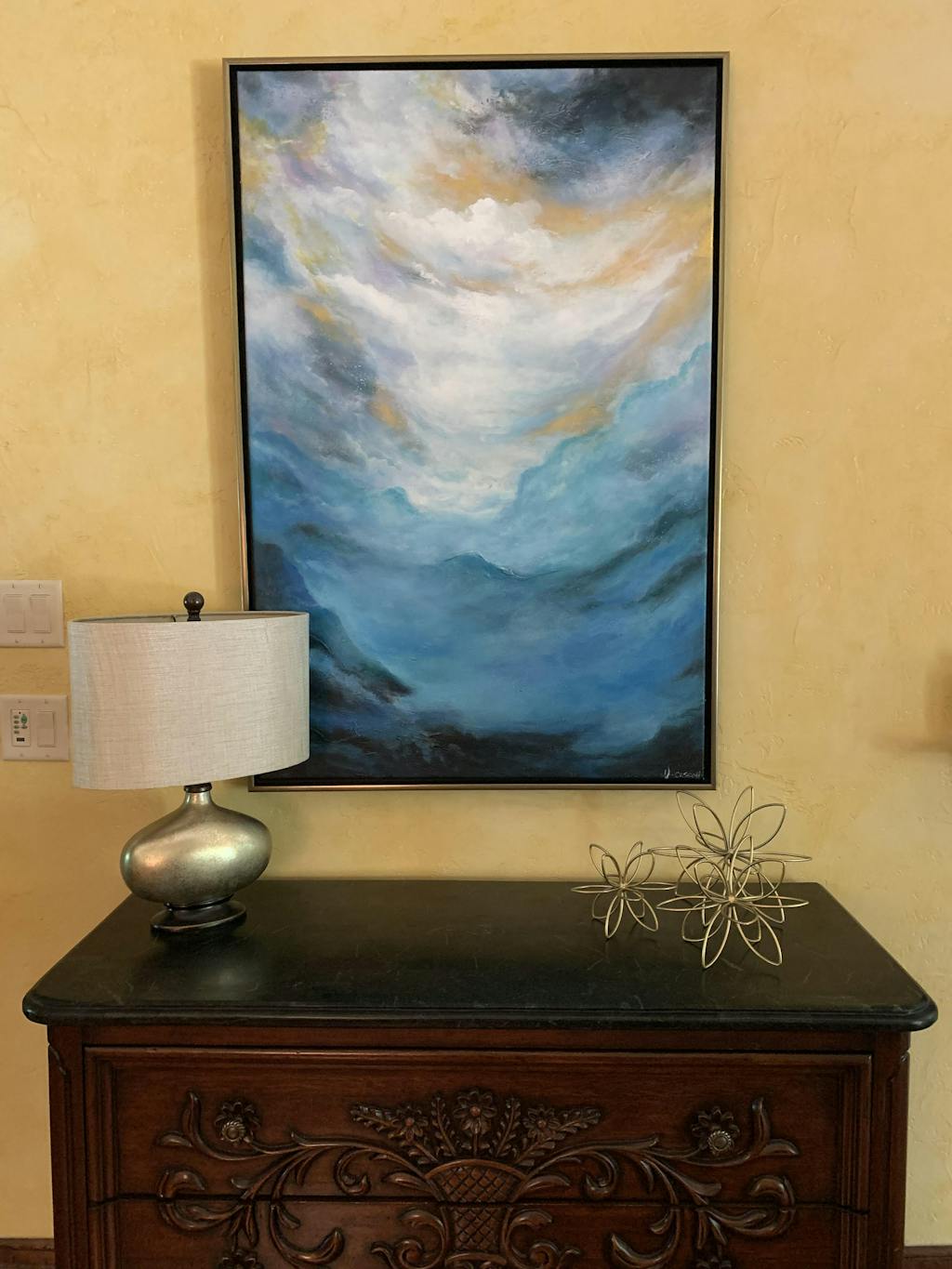 Los vibrantes azules irradian energía y se funden con la belleza de los colores oscuros, de aspecto más misterioso, como una brisa poderosa en un mar tempestuoso. Olas rompiendo violentamente bajo un cielo oscuro: un espectáculo digno de contemplar. Esta pintura cobra vida.