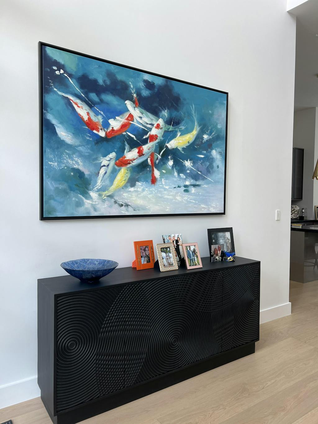 ¡Los hermosos y místicos peces Koi se originaron en Japón y son muy populares allí! Esto se debe a que la palabra japonesa 'Koi' también significa 'Amor' o 'Afecto'. Esta obra de arte cuenta la historia de los Koi bailando entre sí para encontrar a su pareja.