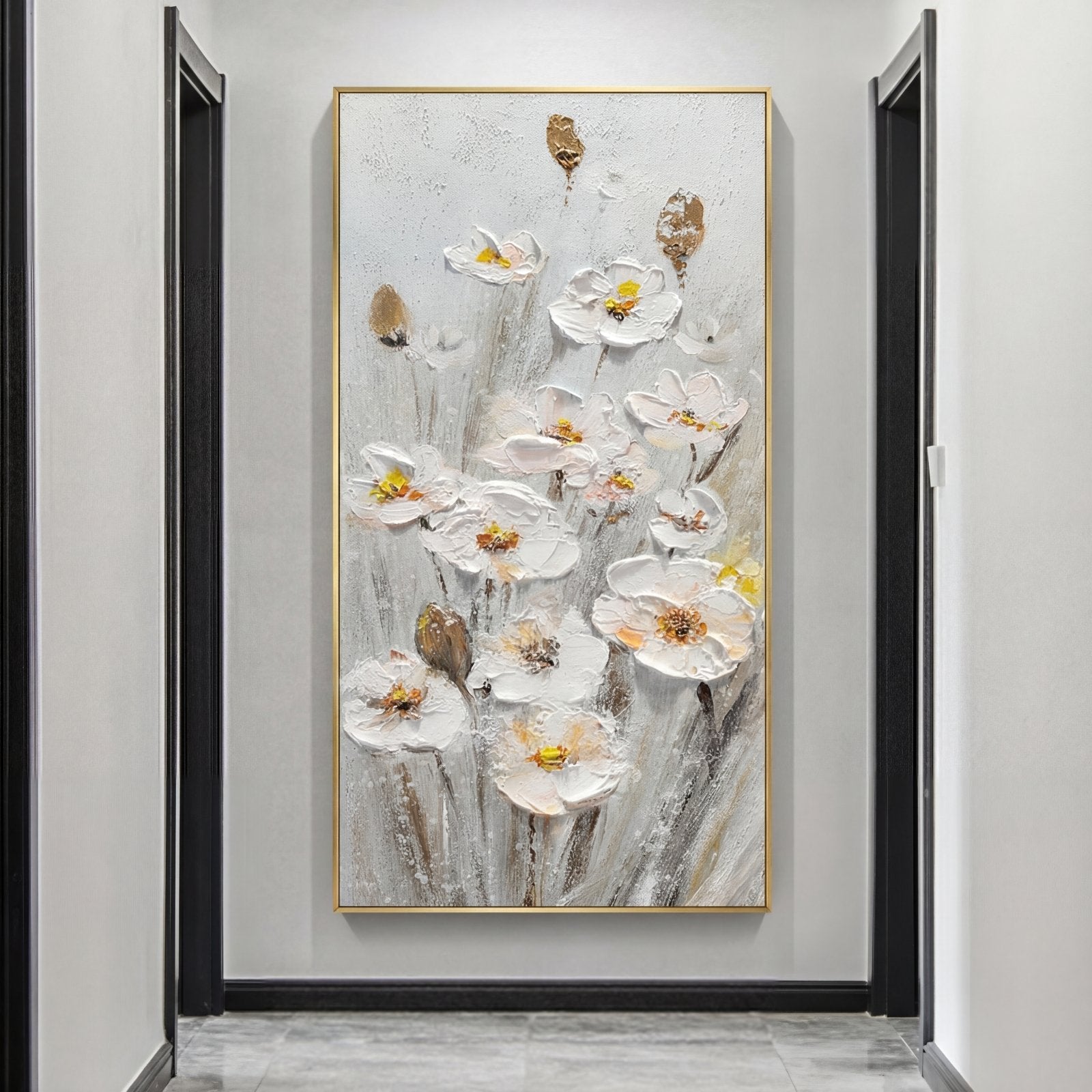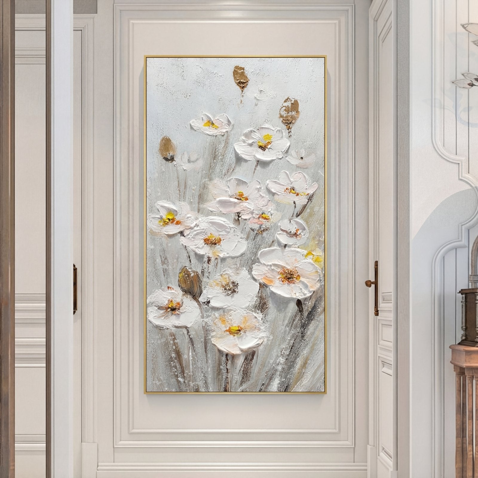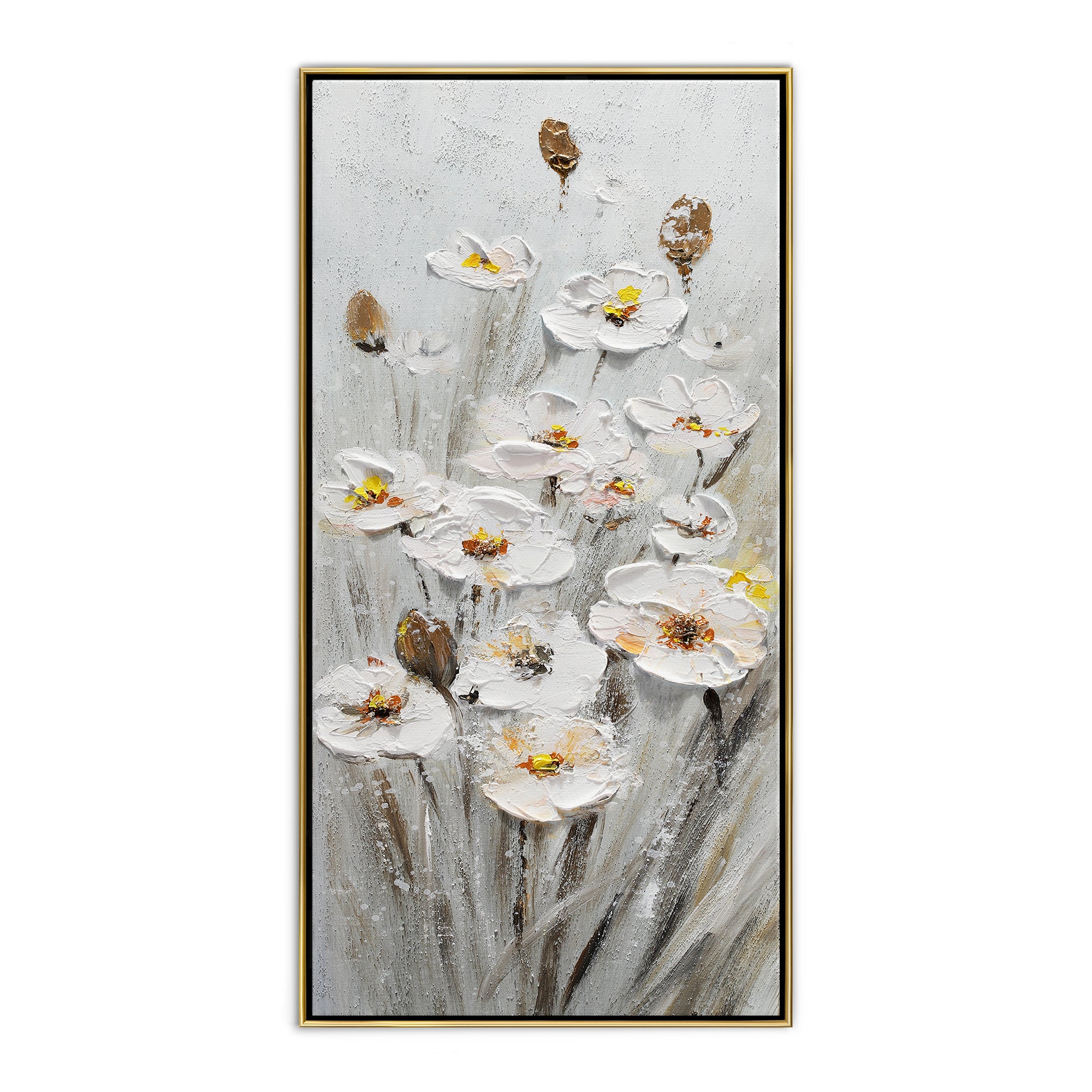 Preciosos narcisos blancos cuelgan maravillosamente en el suave flujo del viento para crear una vista alegre. Mediante el uso de diversas técnicas de pintura, casi parece como si las flores bailaran fuera de su lienzo, creando una atmósfera floral dinámica dondequiera que se representen.