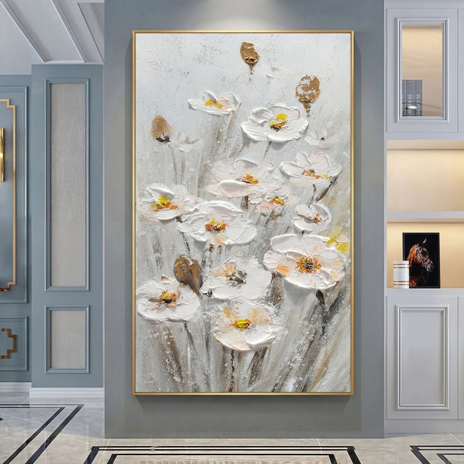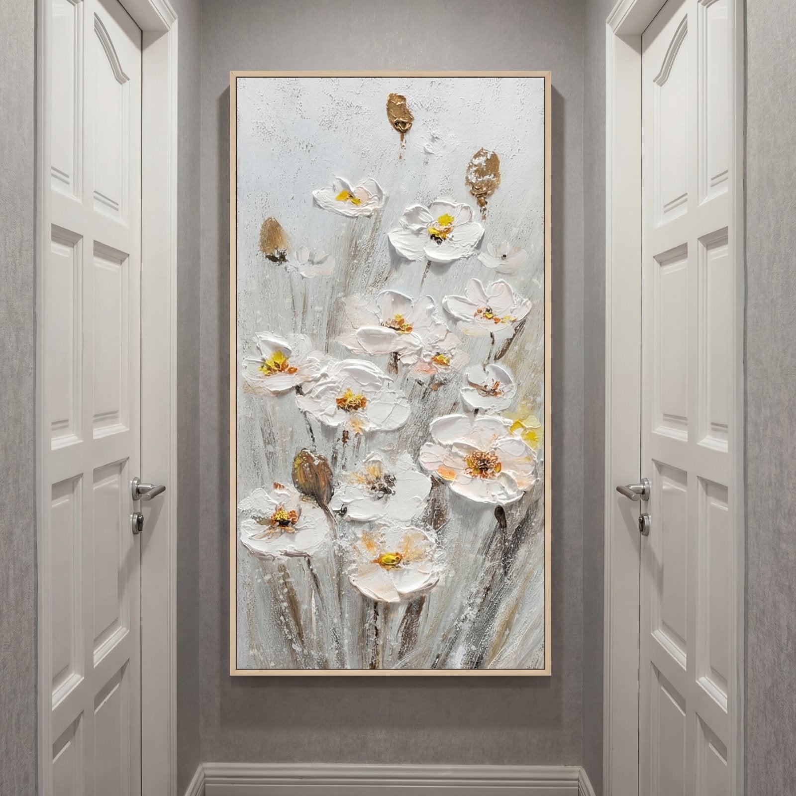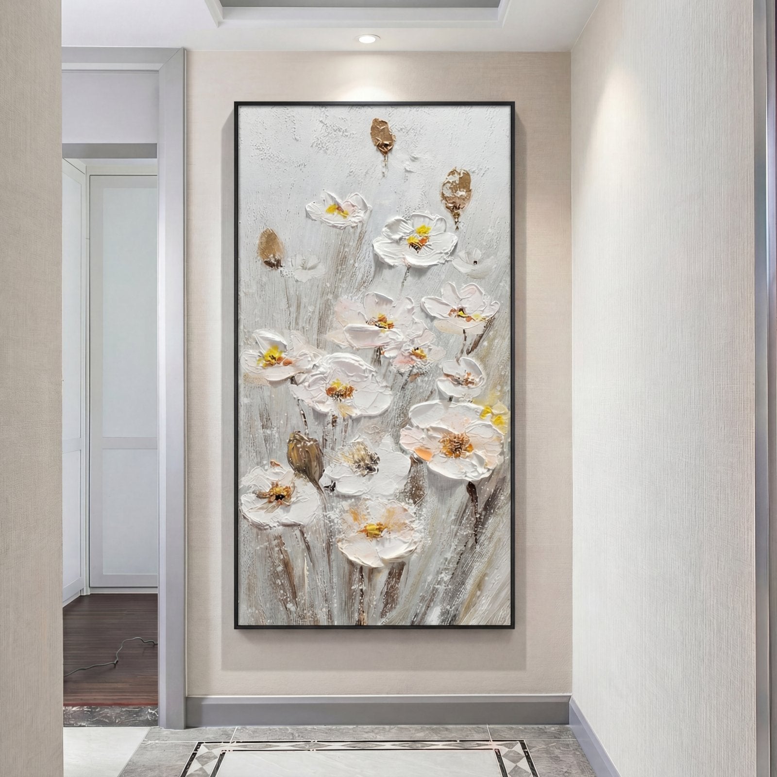 Preciosos narcisos blancos cuelgan maravillosamente en el suave flujo del viento para crear una vista alegre. Mediante el uso de diversas técnicas de pintura, casi parece como si las flores bailaran fuera de su lienzo, creando una atmósfera floral dinámica dondequiera que se representen.