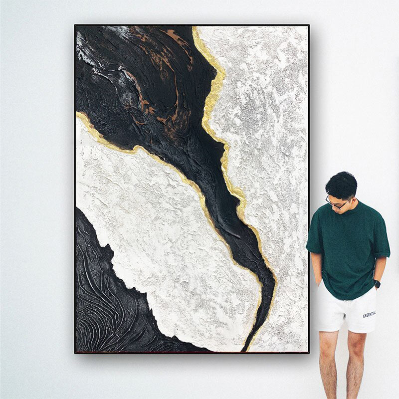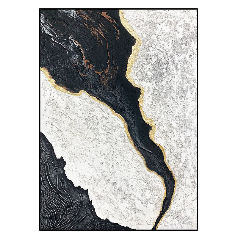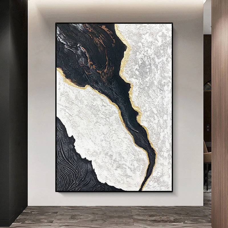 Flujo oscuro captura el impactante contraste entre la luz y la oscuridad, con una veta dorada que fluye como energía líquida. Esta audaz pieza llamativa se siente viva y llama la atención en cualquier espacio. Deja que el poderoso movimiento de esta obra ilumine tu interior con su elegancia y misterio.