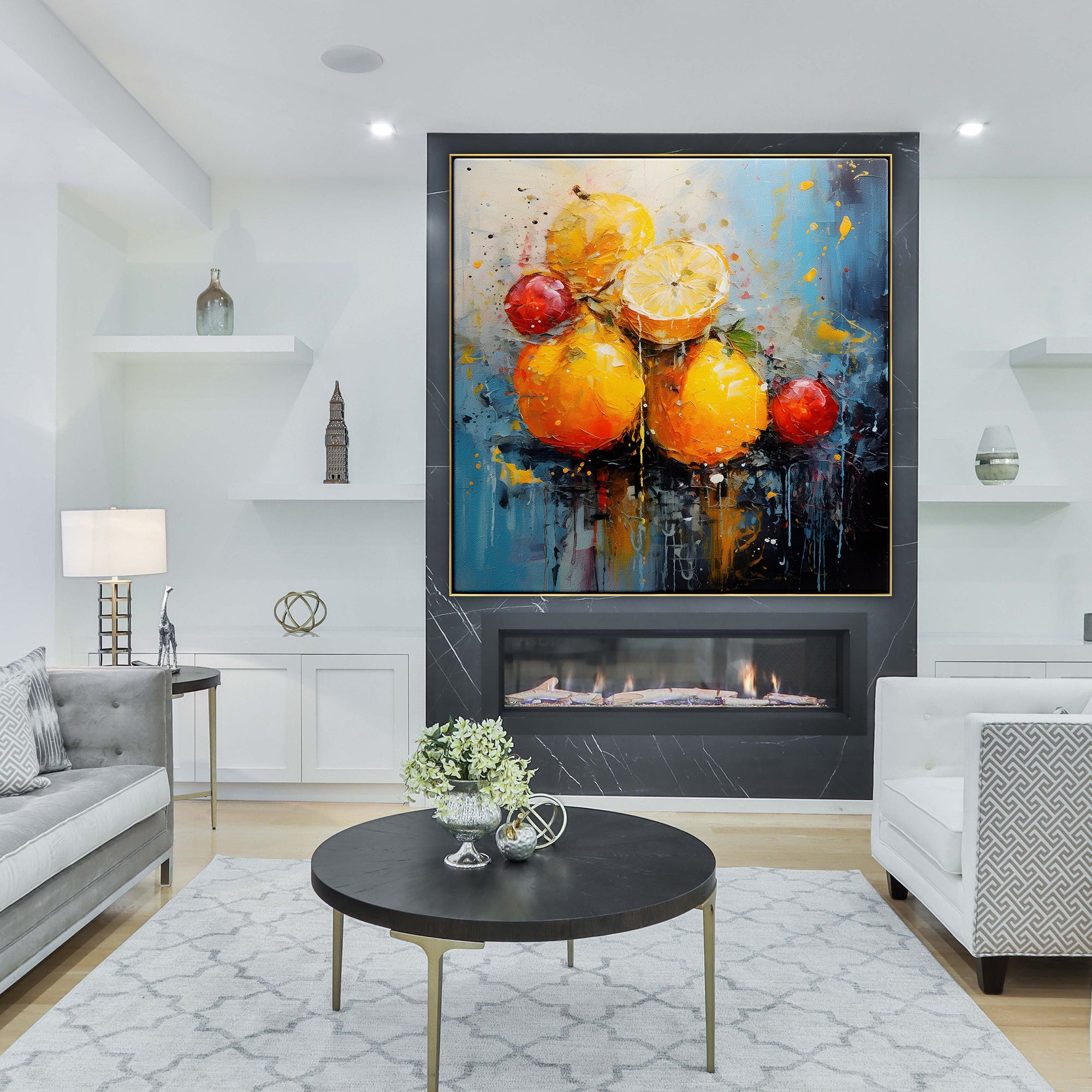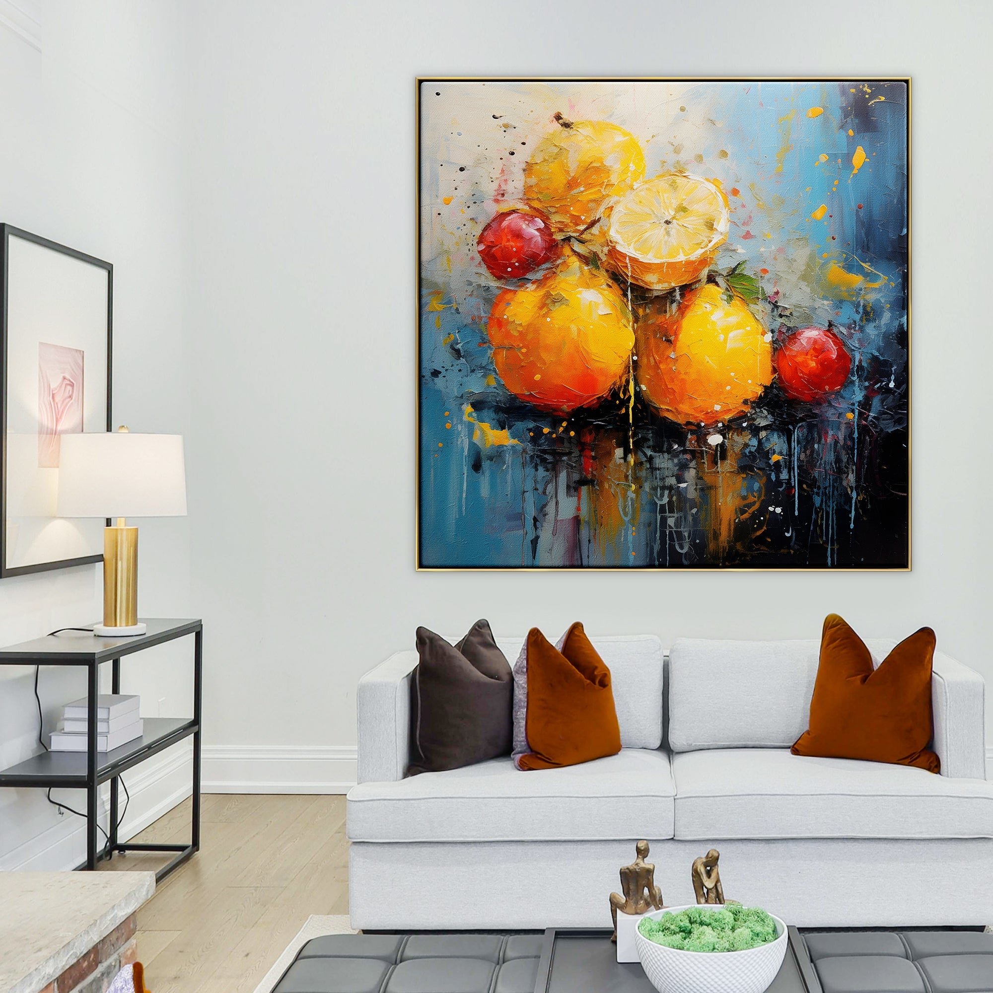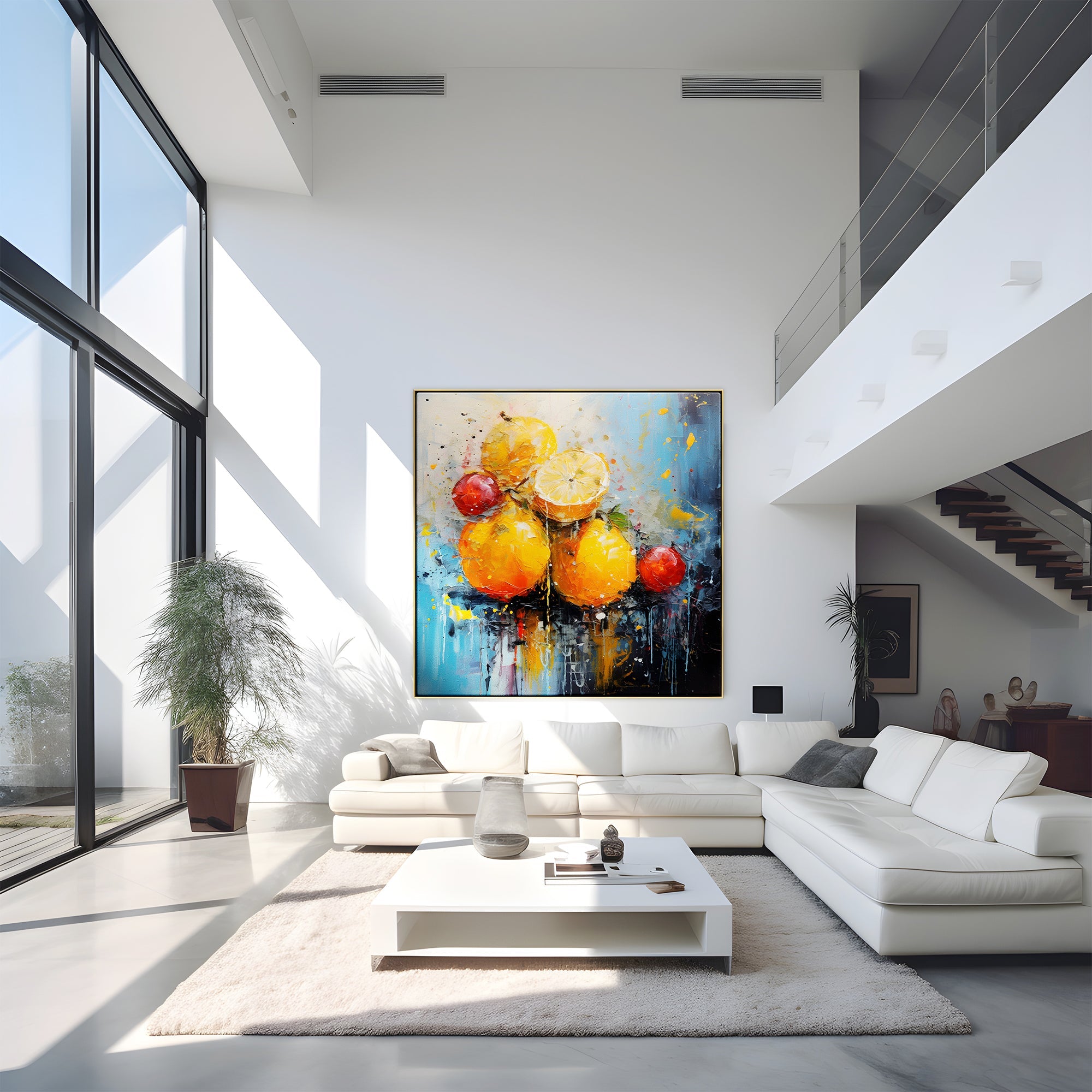 Naturaleza Muerta Goteando presenta una interpretación única del bodegón clásico. Con un moderno estilo "goteo", las frutas parecen más suculentas que nunca. ¿Se te hace la boca agua con solo contemplar esta obra?