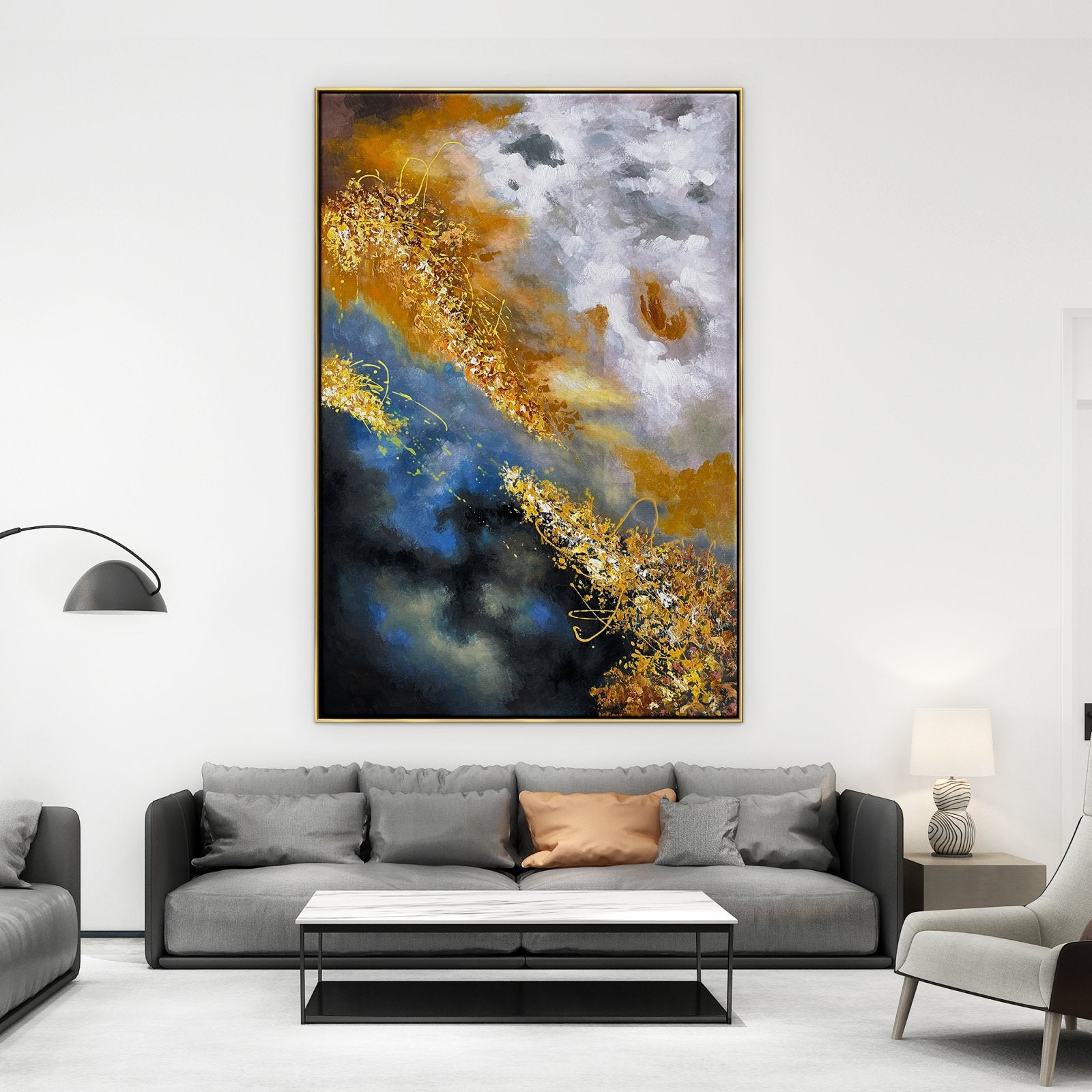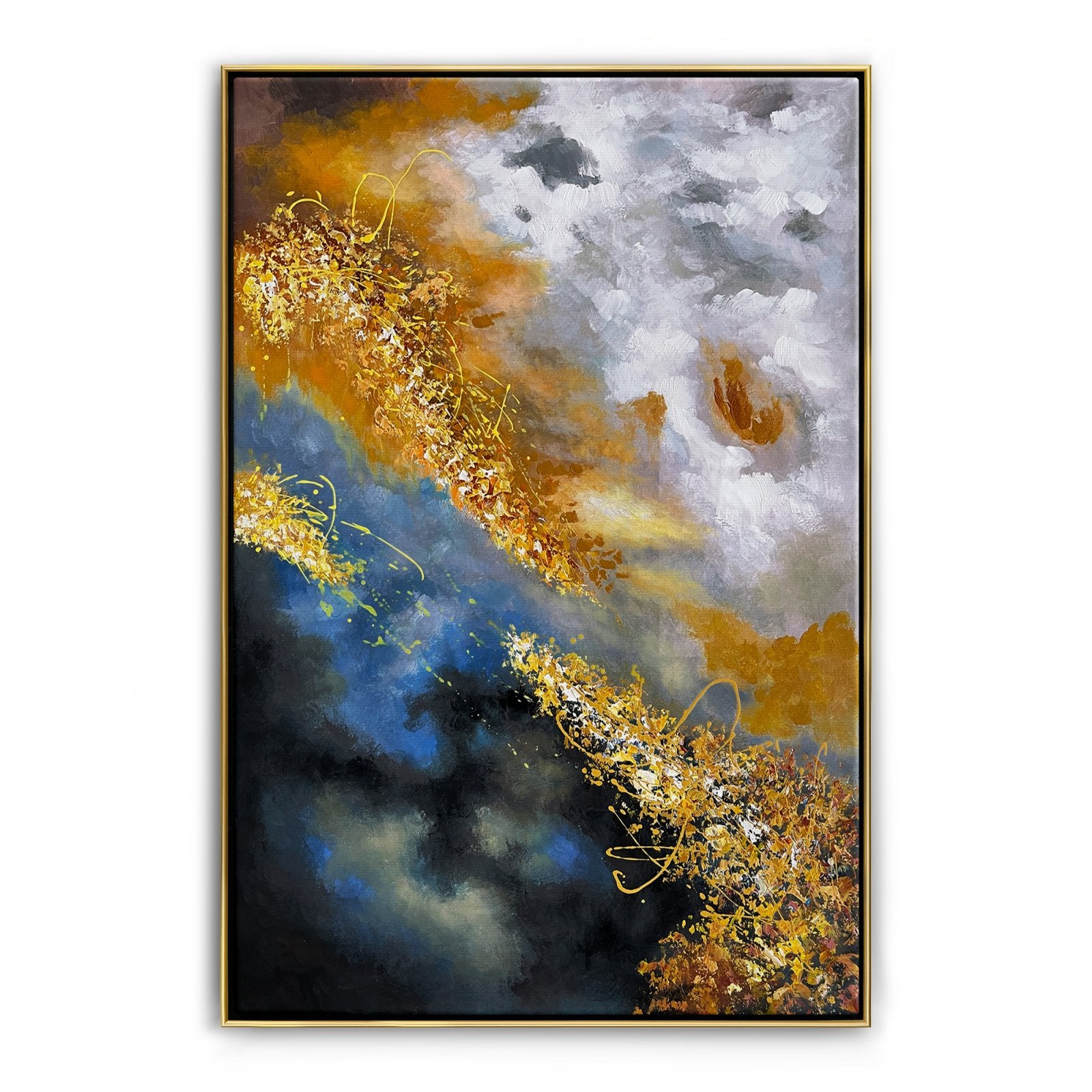 Algunos creen que nuestro destino final es un lugar como el cielo, en lo alto de las nubes. Esta idea está bellamente representada en esta obra de arte abstracto. Con detalles dorados y una composición deslumbrante, esta pieza crea una atmósfera celestial dondequiera que sea retratada.