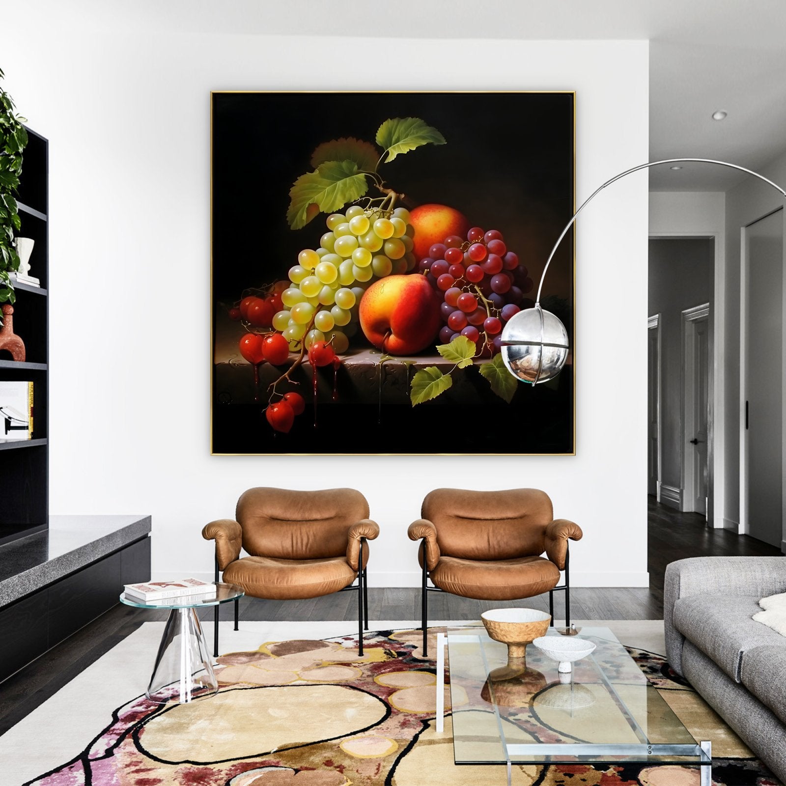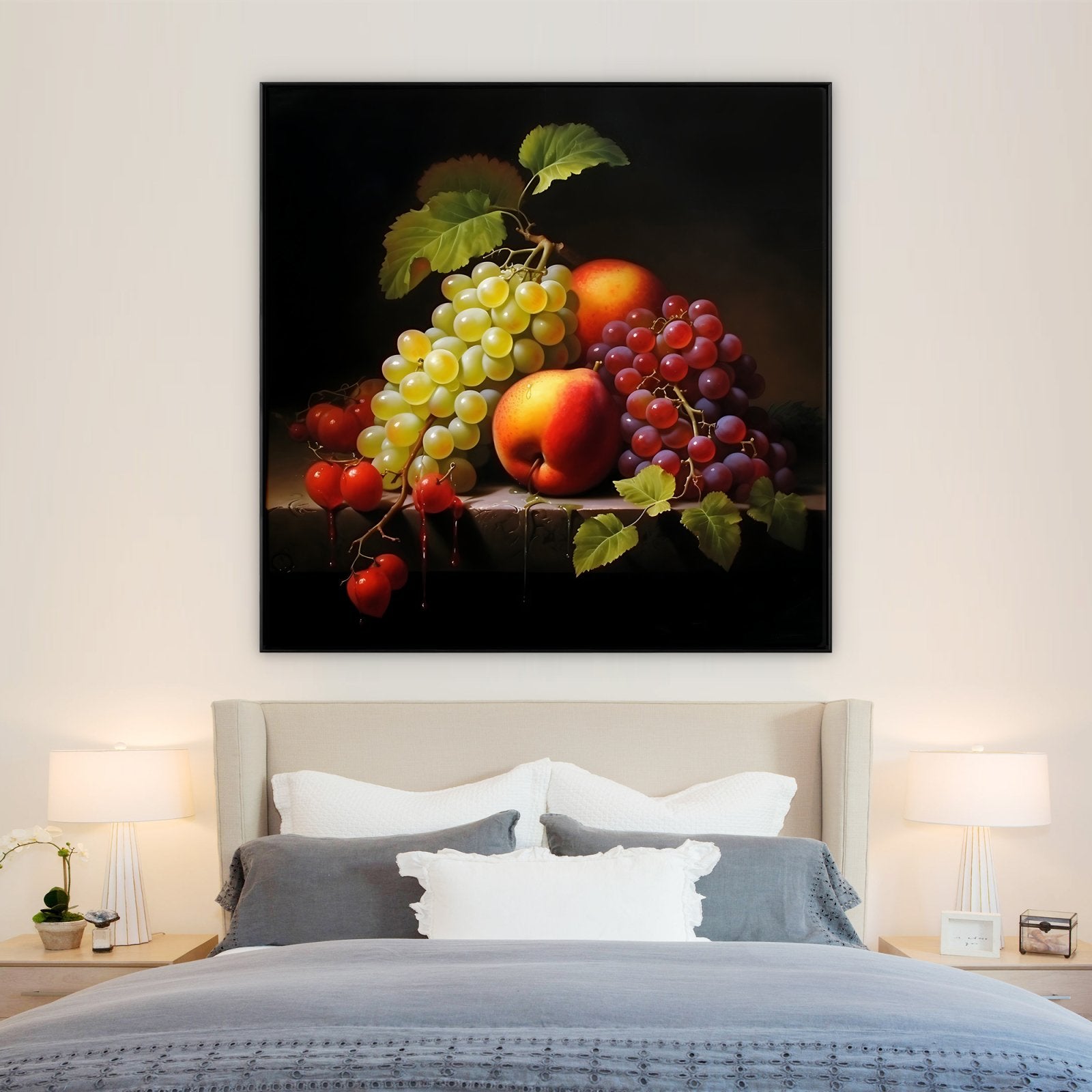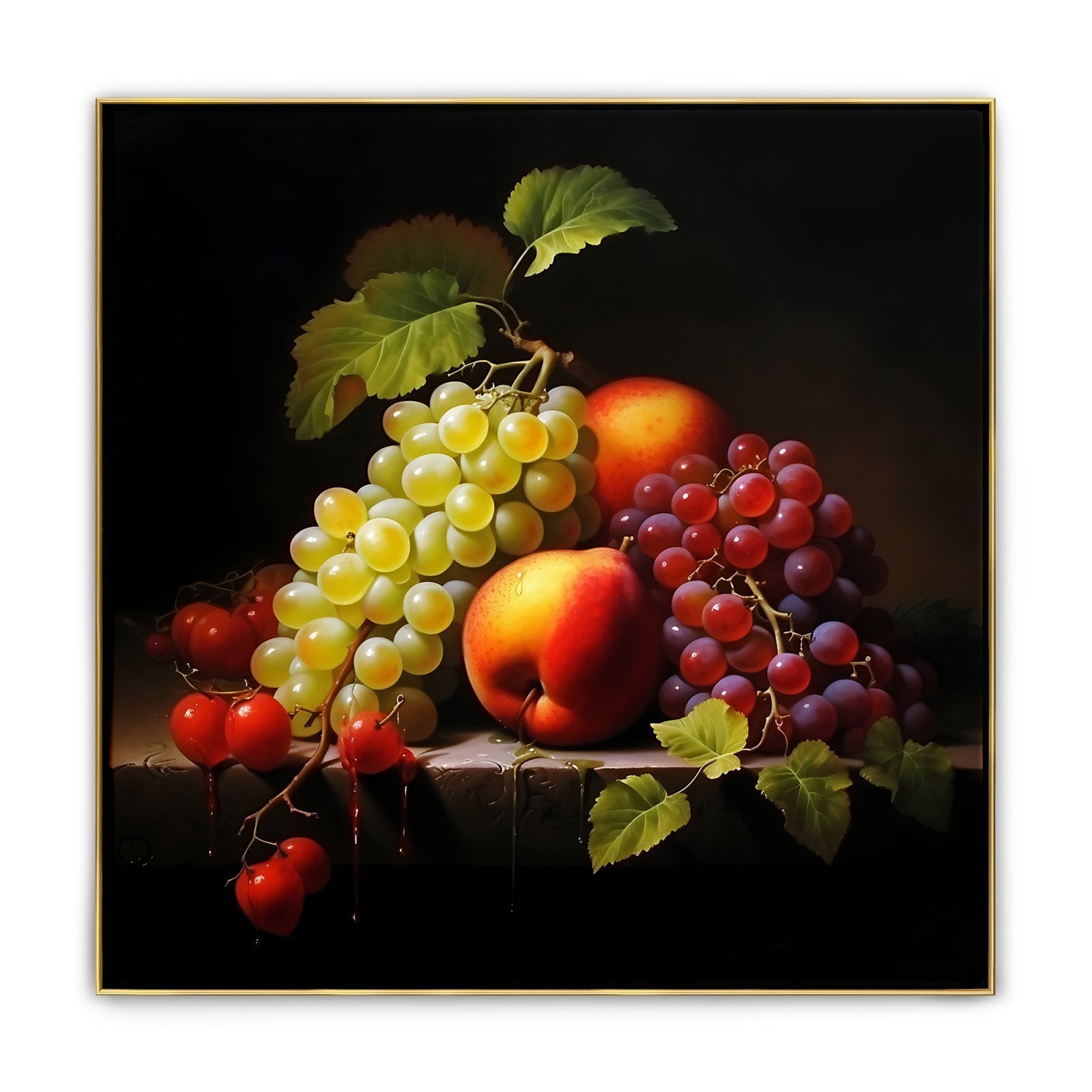 Esta imponente naturaleza muerta transforma frutas comunes en tesoros extraordinarios. Mediante un impresionante juego de sombras e iluminación, las frutas se muestran a la perfección, realzando su belleza natural.
