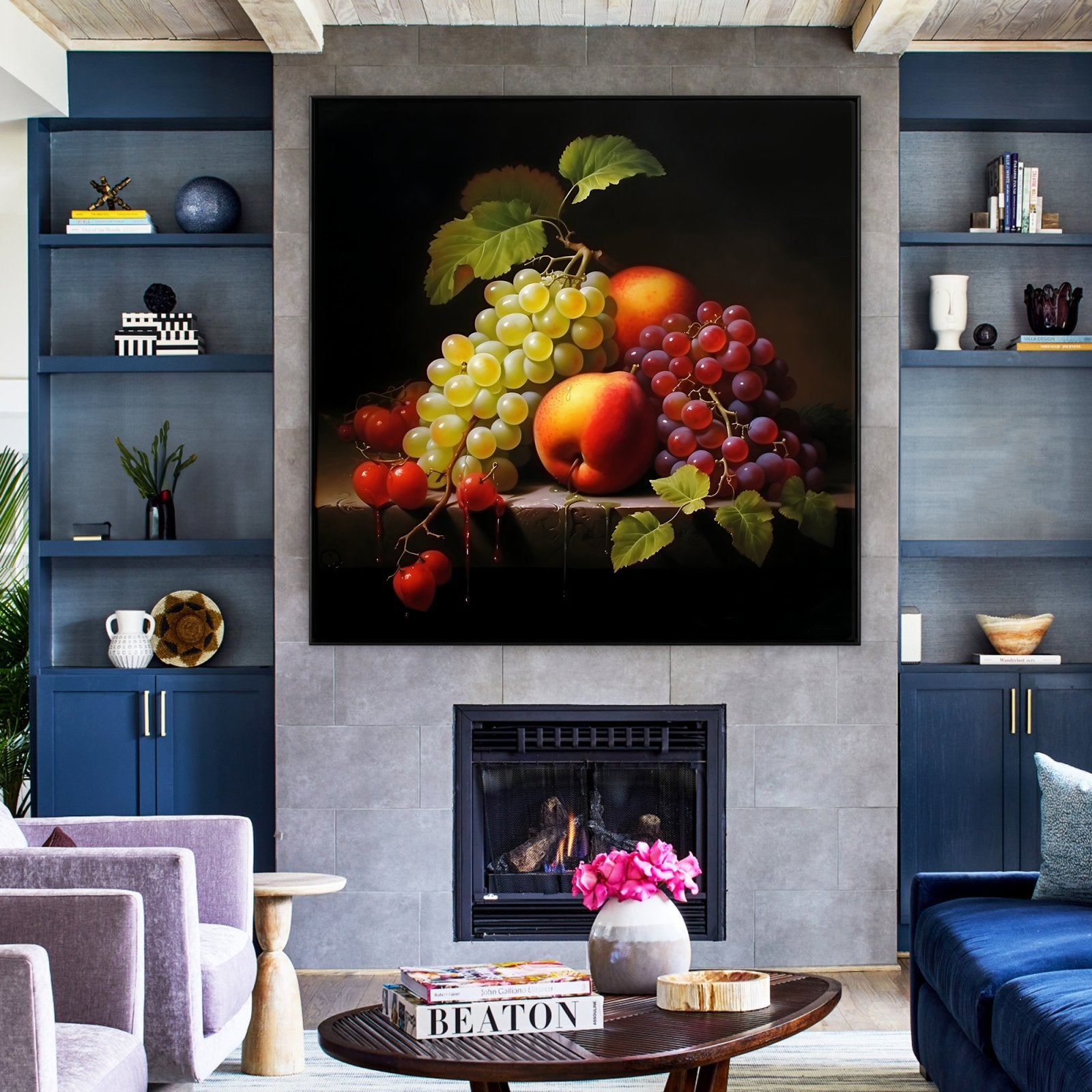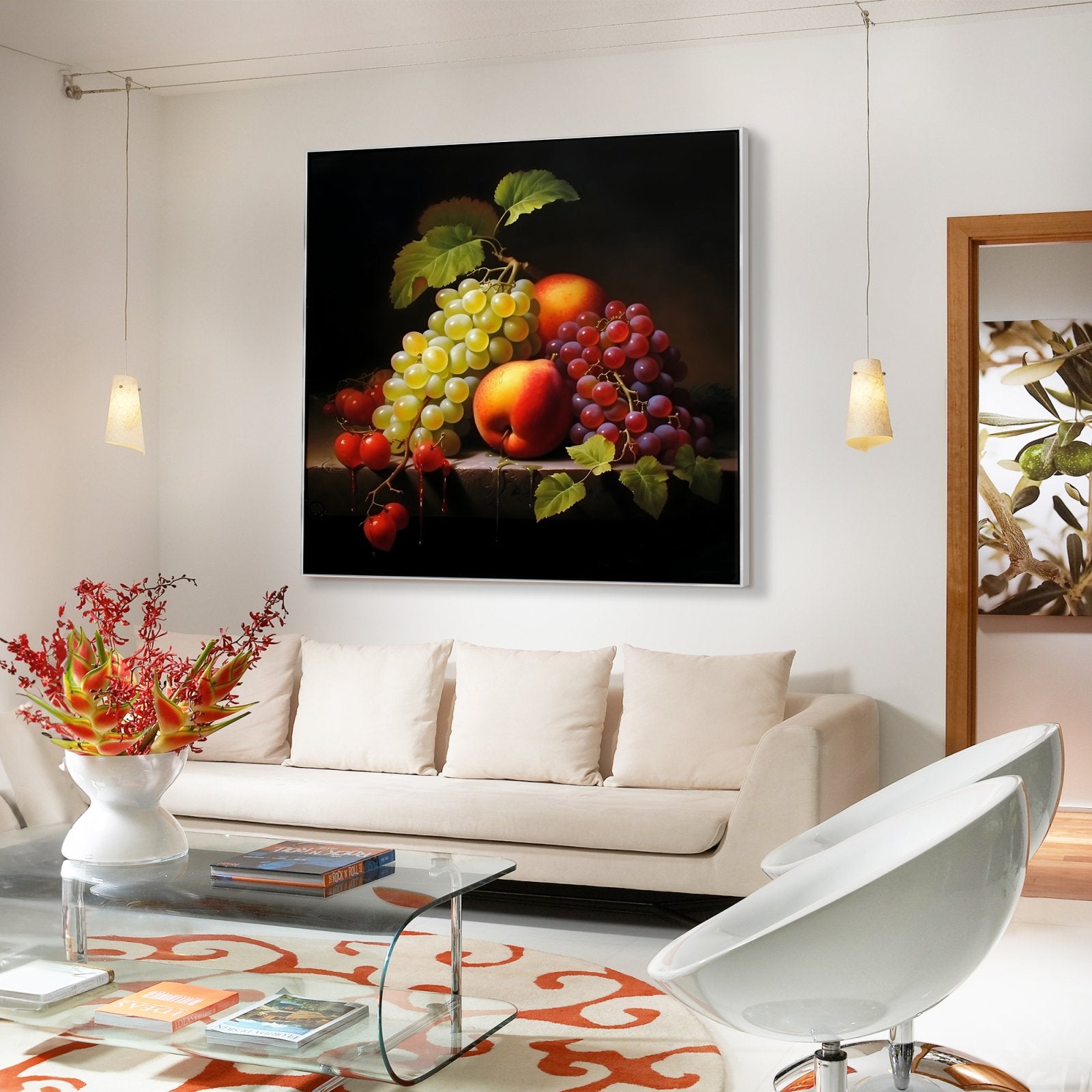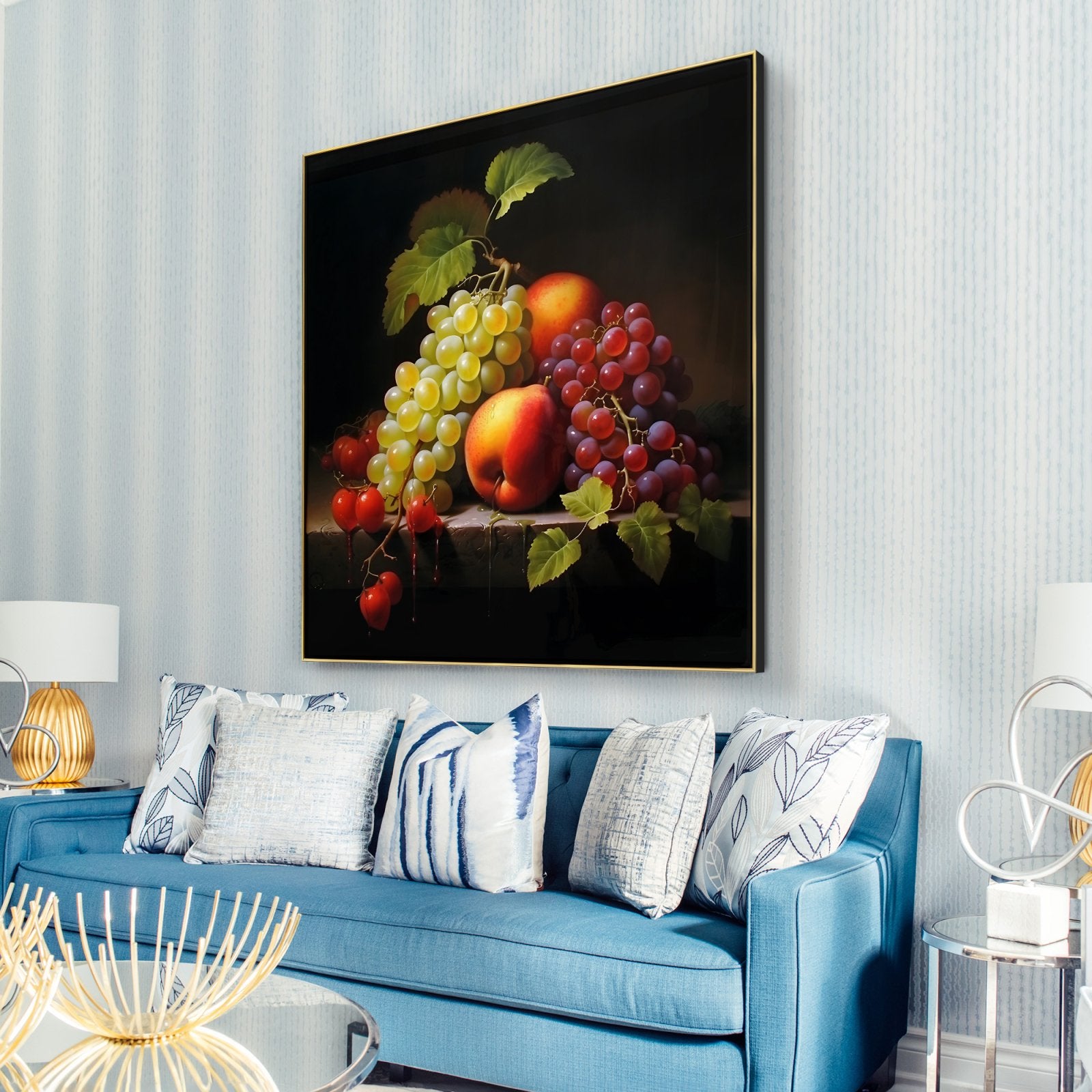 Esta imponente naturaleza muerta transforma frutas comunes en tesoros extraordinarios. Mediante un impresionante juego de sombras e iluminación, las frutas se muestran a la perfección, realzando su belleza natural.