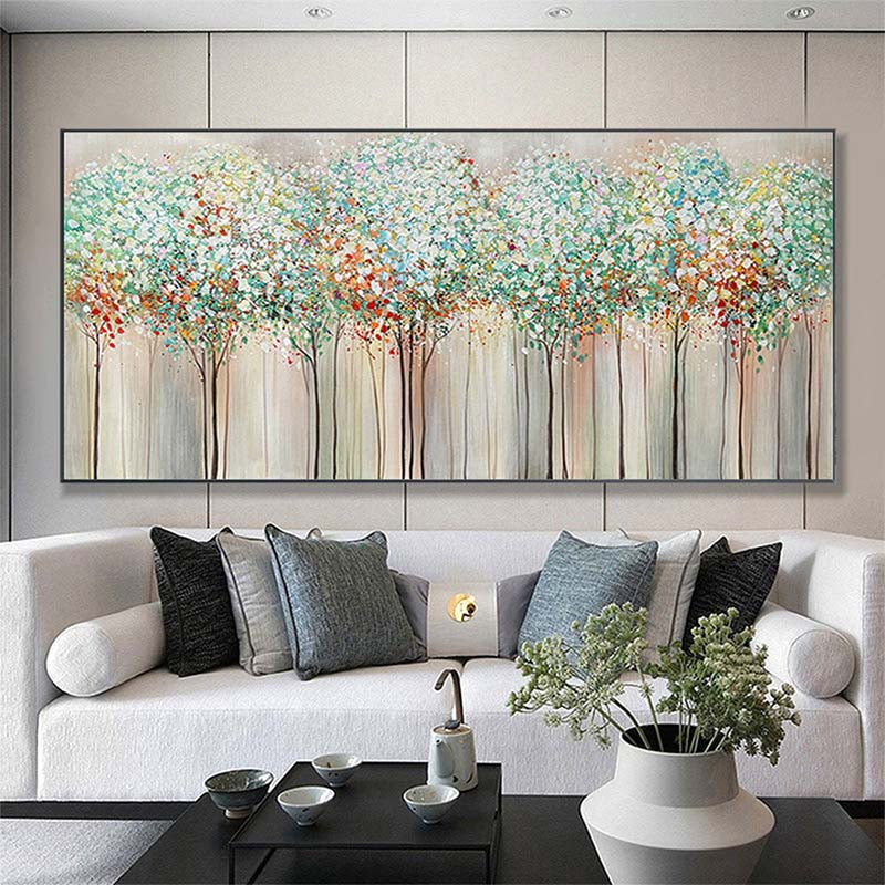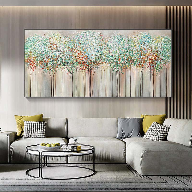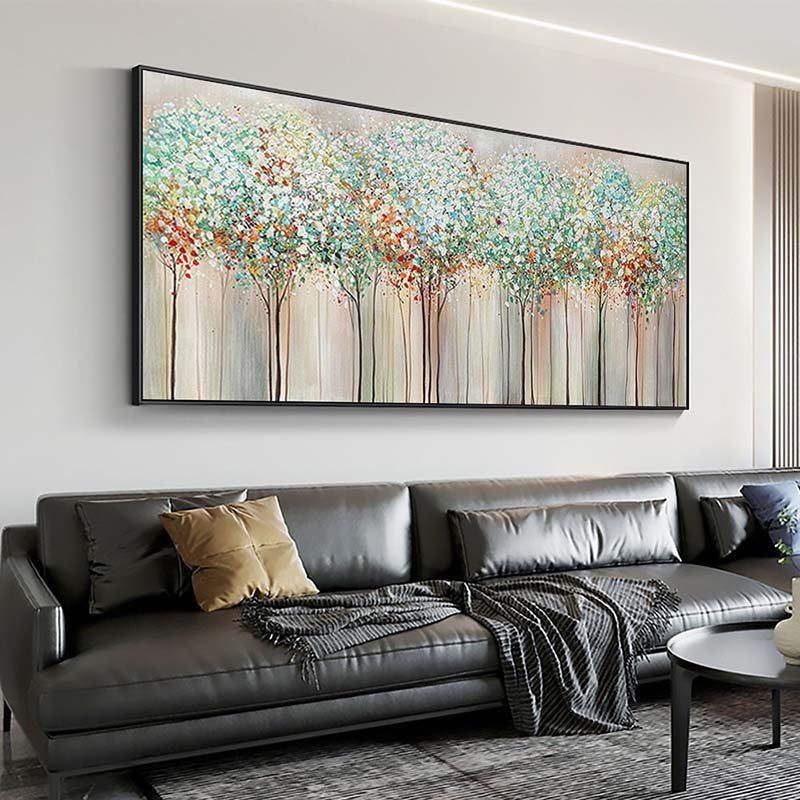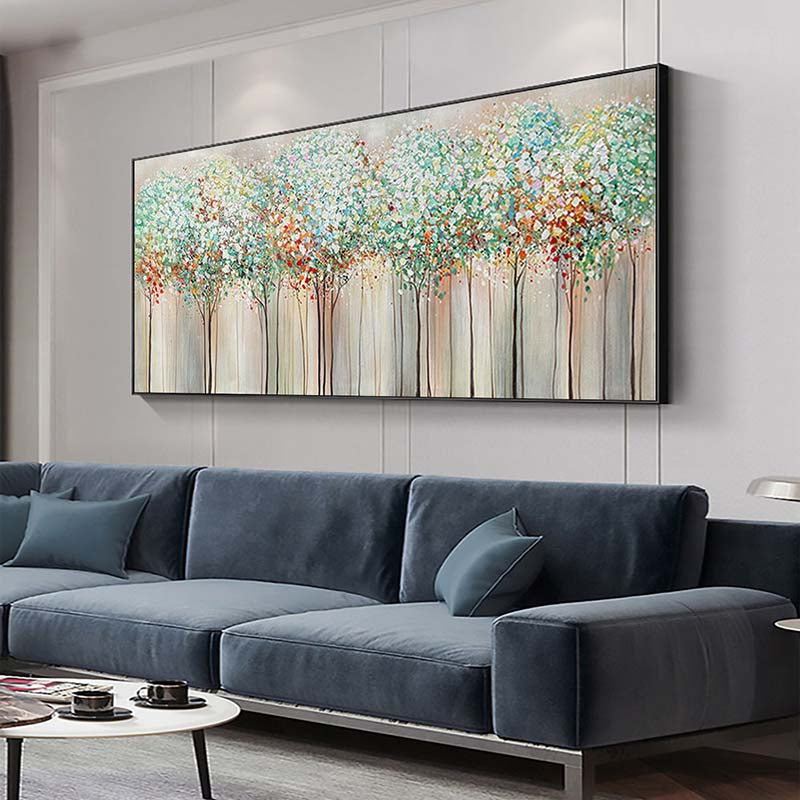 Experimente la majestuosidad de un imponente bosque con esta impresionante obra de arte. Los vibrantes colores y los detallados troncos de los árboles llevan la belleza de la naturaleza al interior, convirtiéndola en una encantadora adición a la decoración de su hogar.