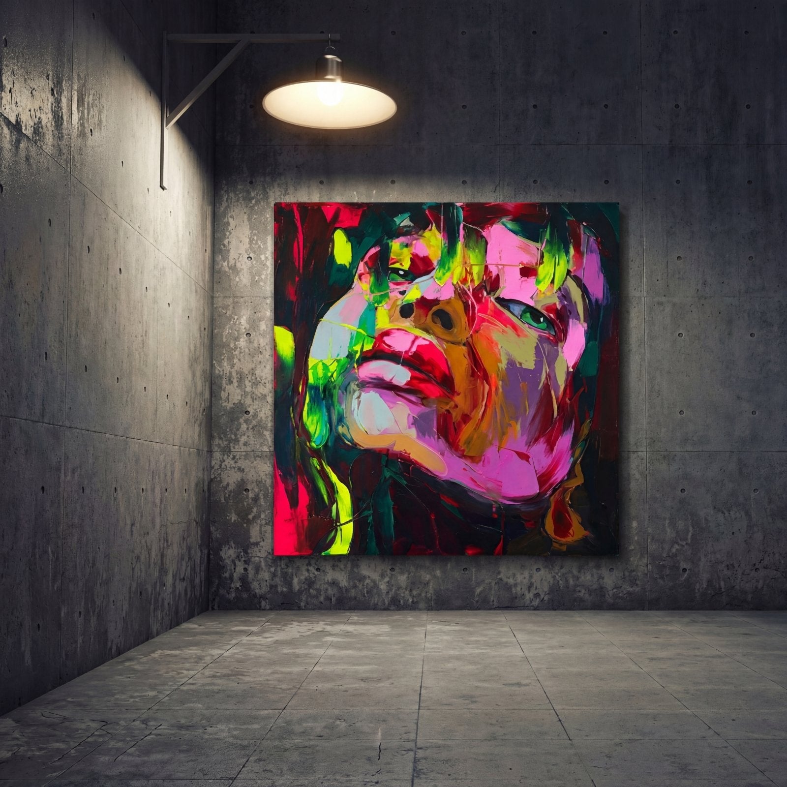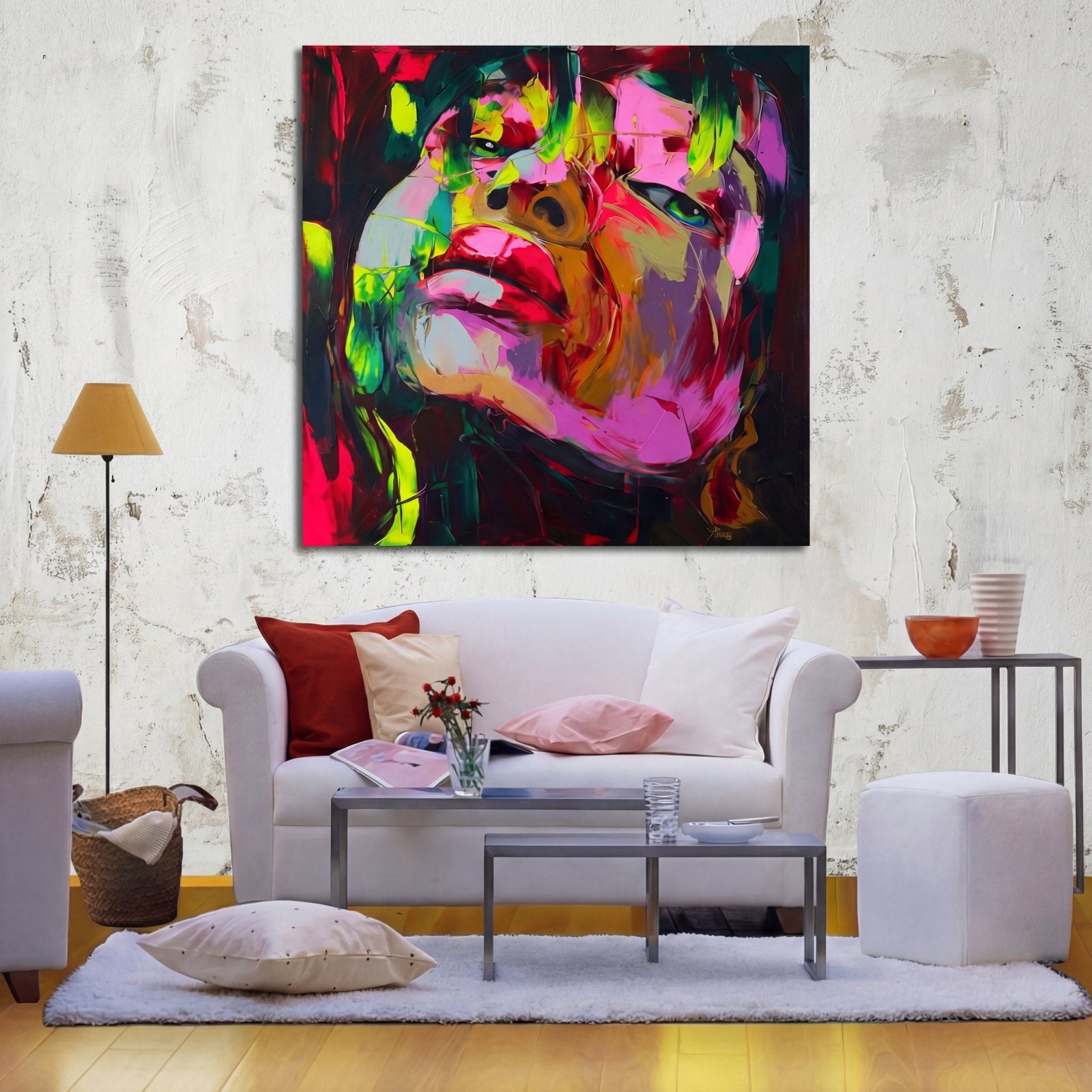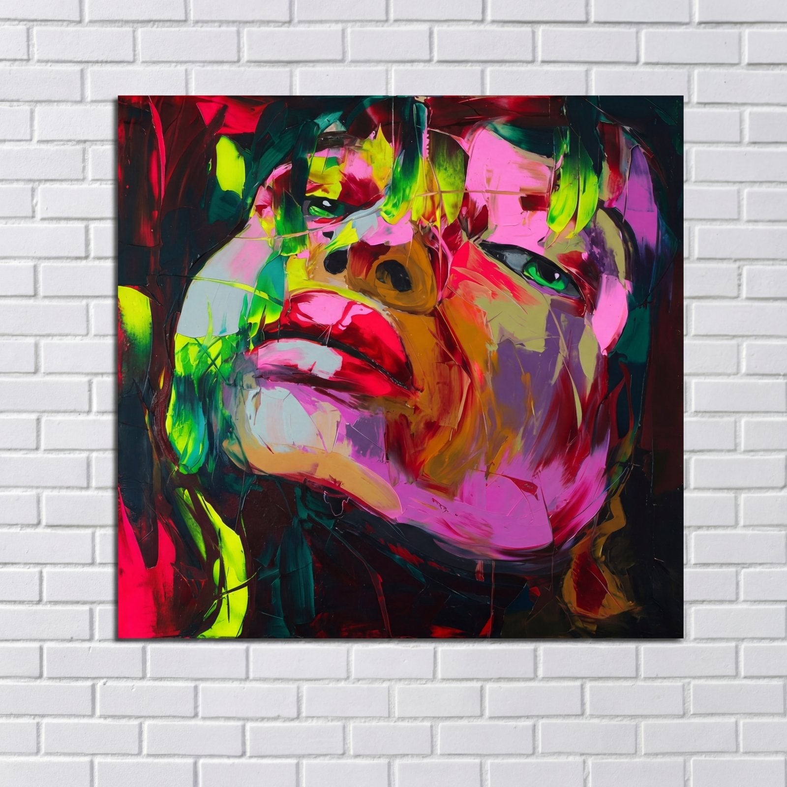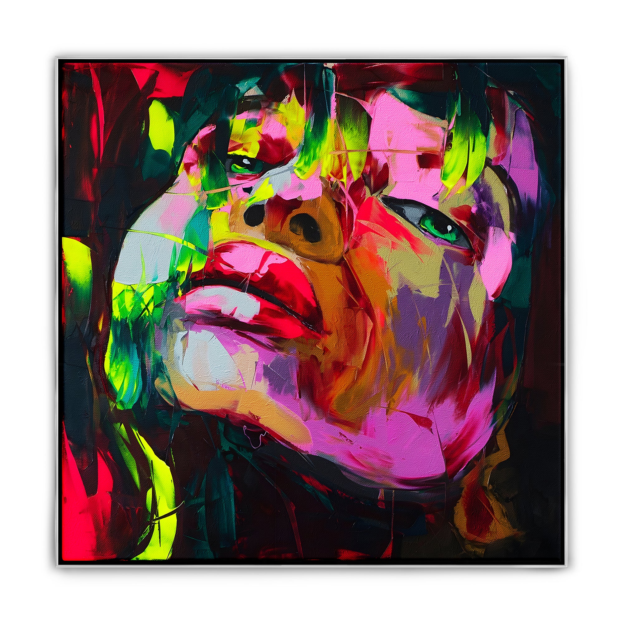 ¡Con ojos penetrantes y colores espectaculares, esta pieza “Resplandor” llama absolutamente la atención! Piérdete en la mirada interminable o en los colores que fluyen a su alrededor. ¡El ajuste perfecto si buscas una pieza central en una habitación!