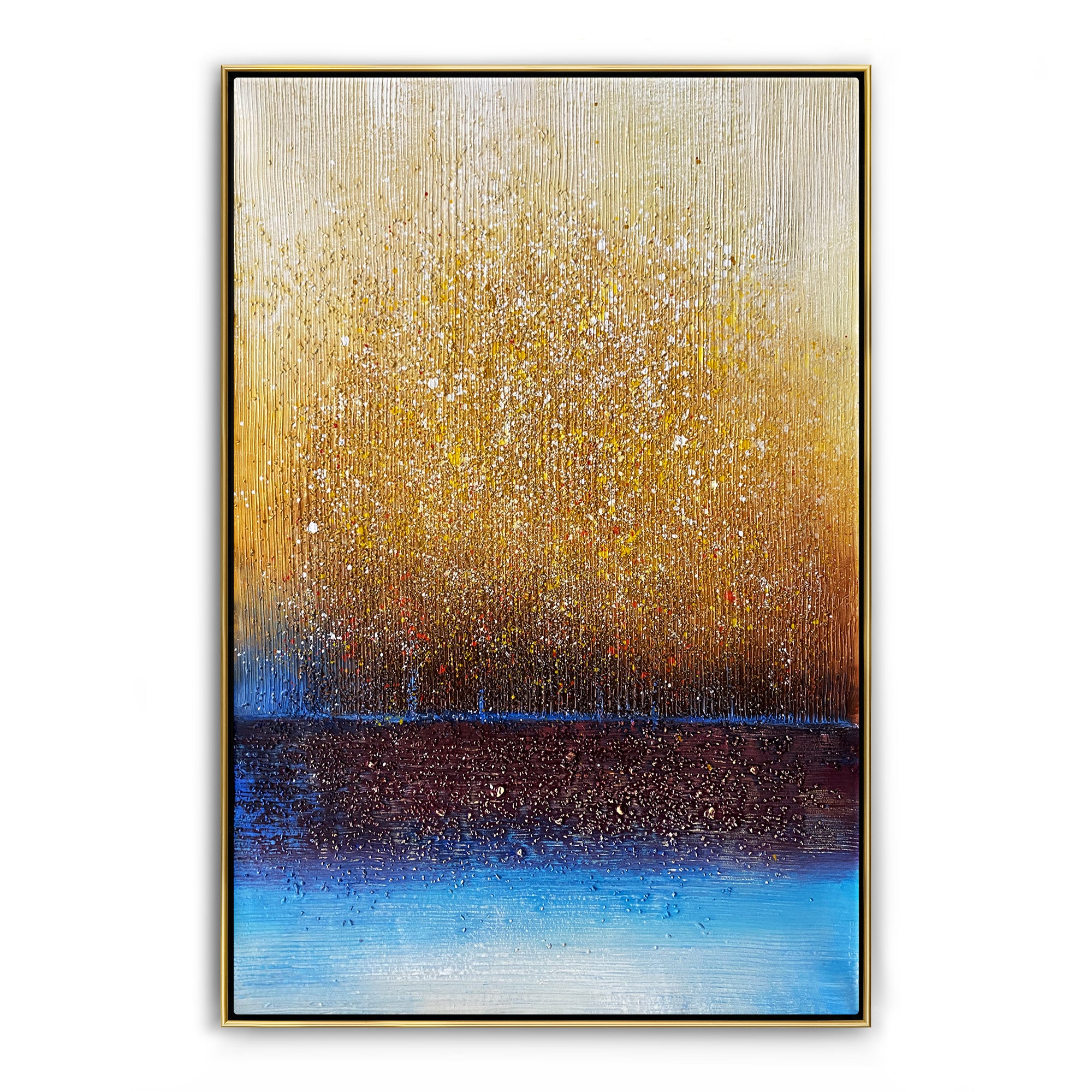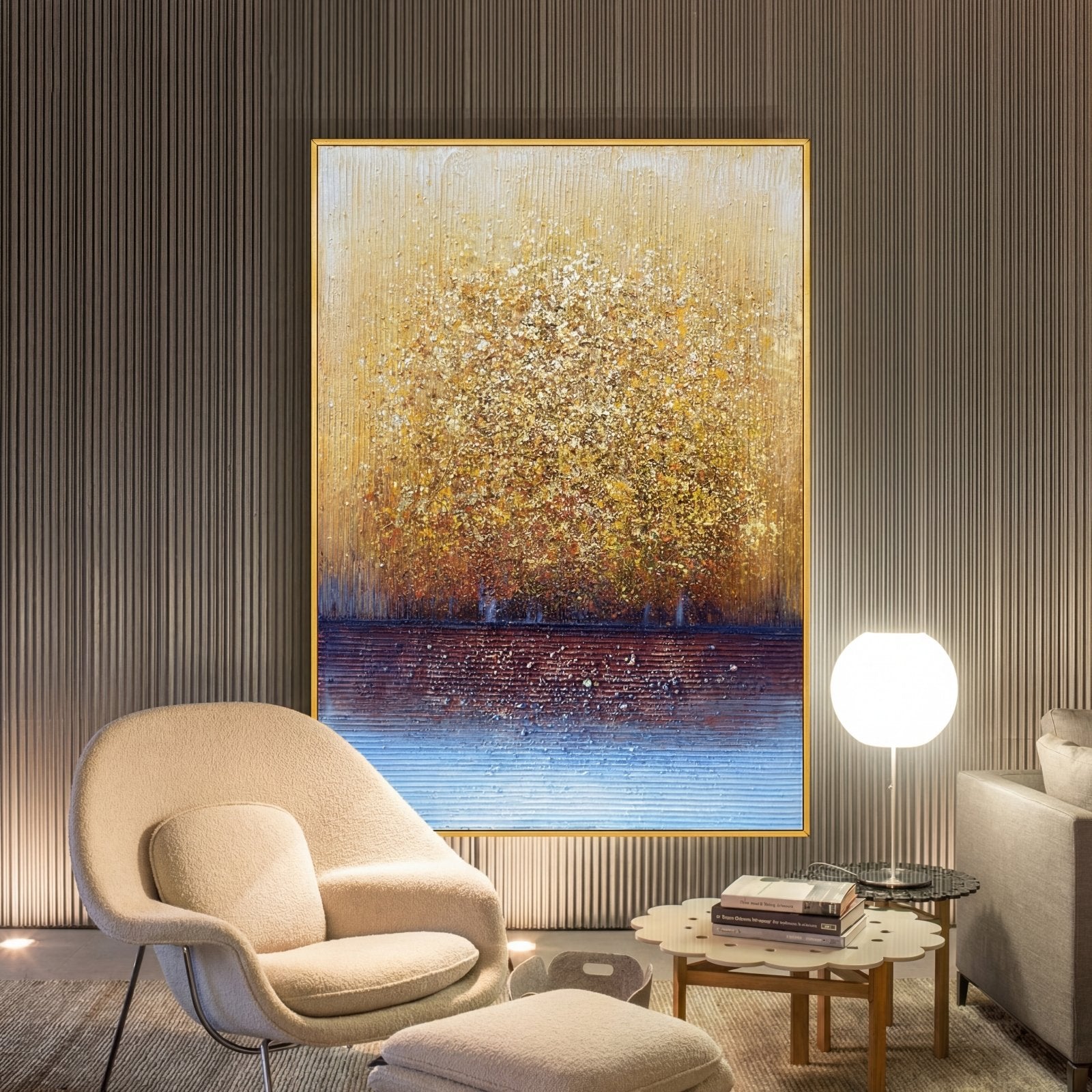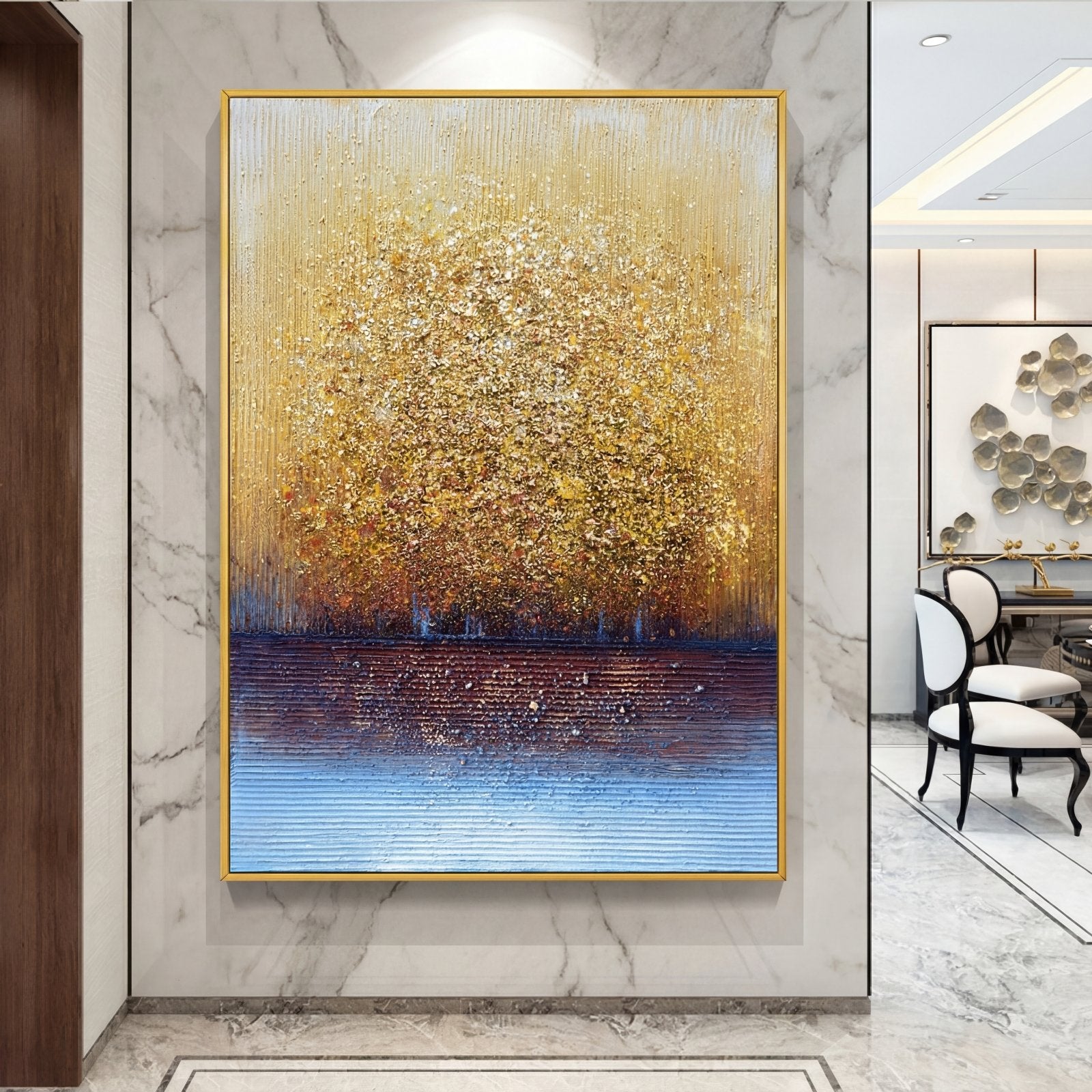 En el poderoso y hermoso bosque dorado, puedes encontrar infinitas riquezas y tesoros, escondidos detrás de sus numerosos árboles relucientes. ¿Eres capaz de encontrarlos? ¡Con una técnica única y colores deslumbrantes, esta composición enriquecerá el interior de cualquier hogar sin esfuerzo!