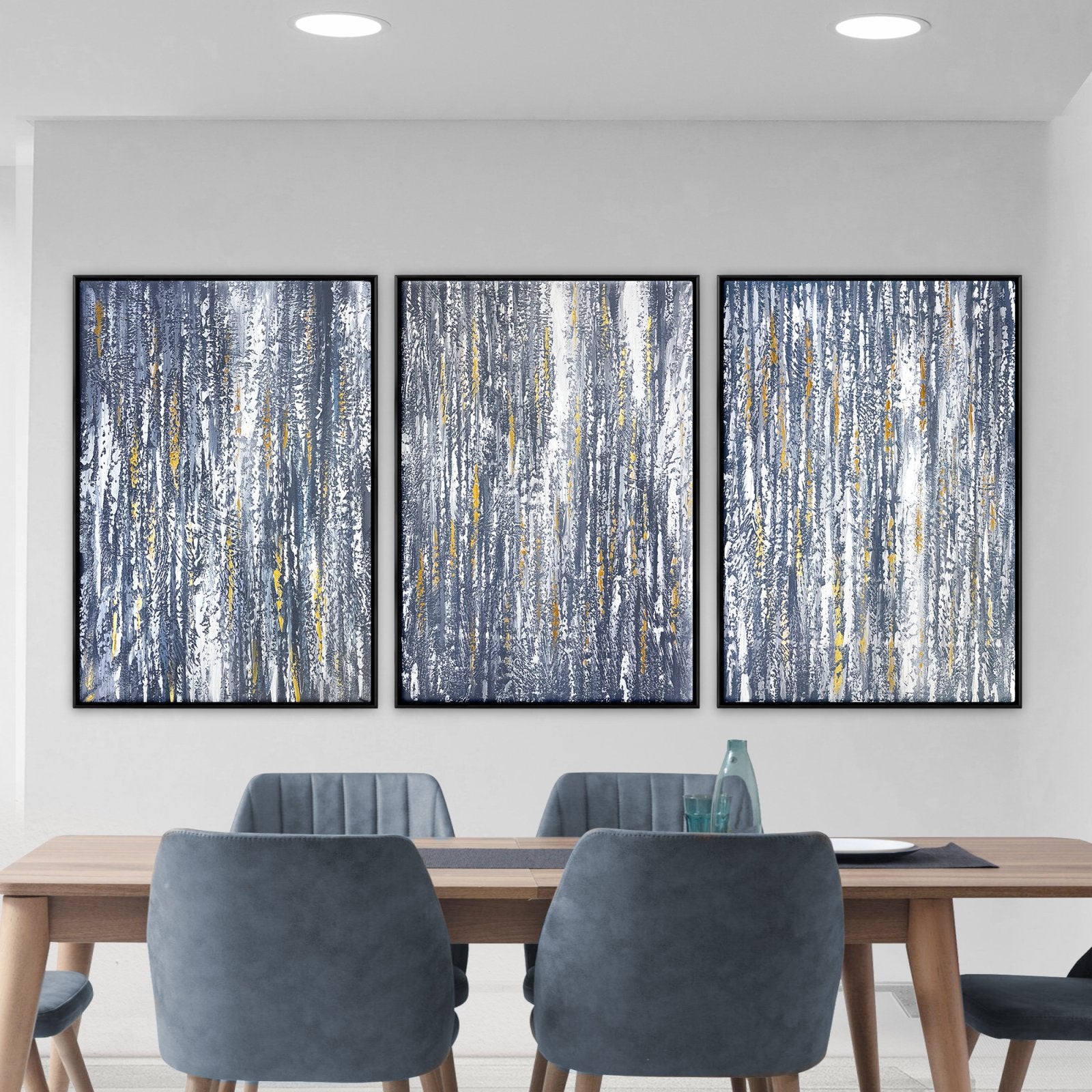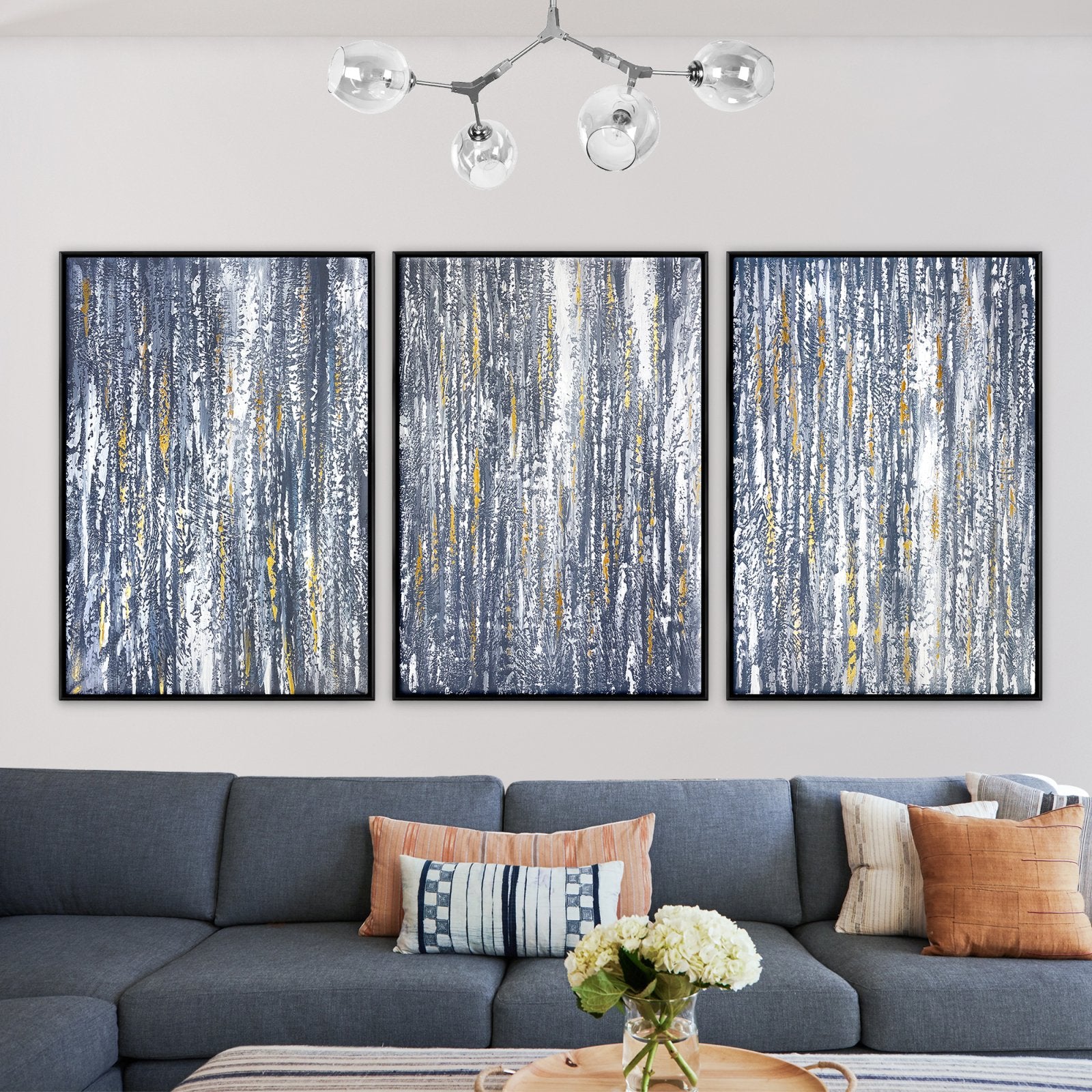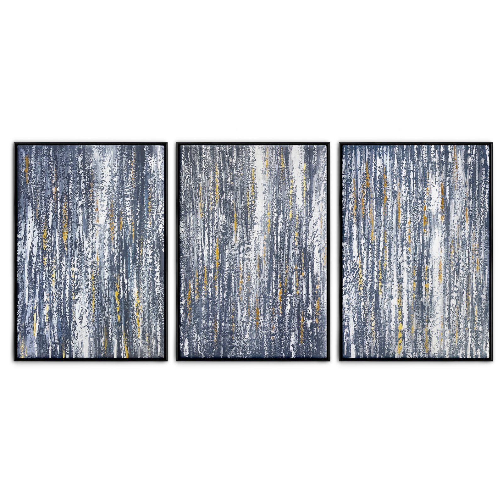 Celebrando la llegada de una nueva era, este magnífico conjunto de lienzos 'Golden Rain' retrata fuegos artificiales brillantes. Revoloteando lentamente en el brumoso cielo nocturno, creando pequeñas estrellas doradas.