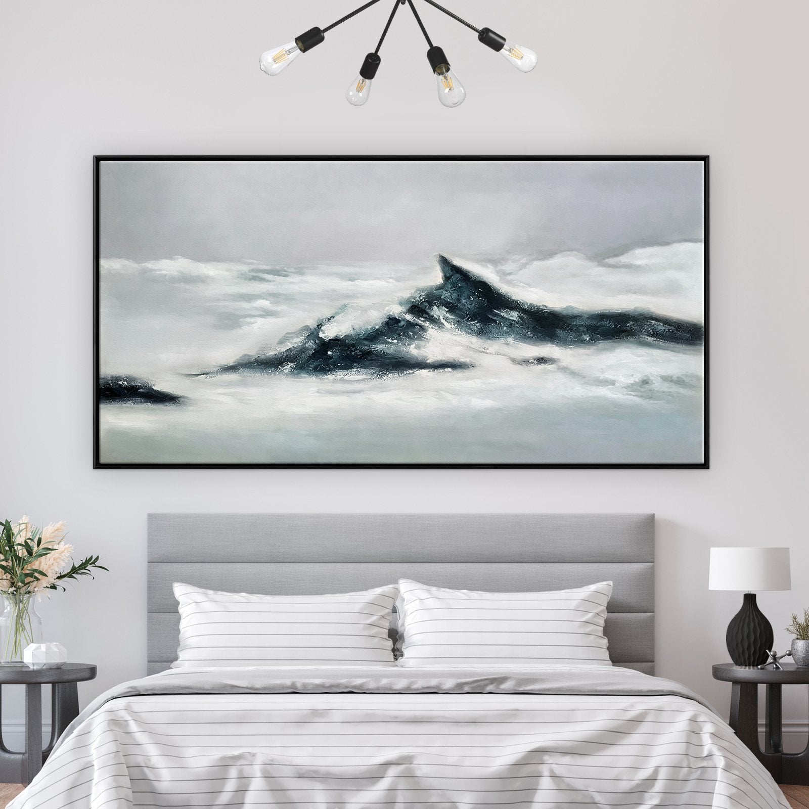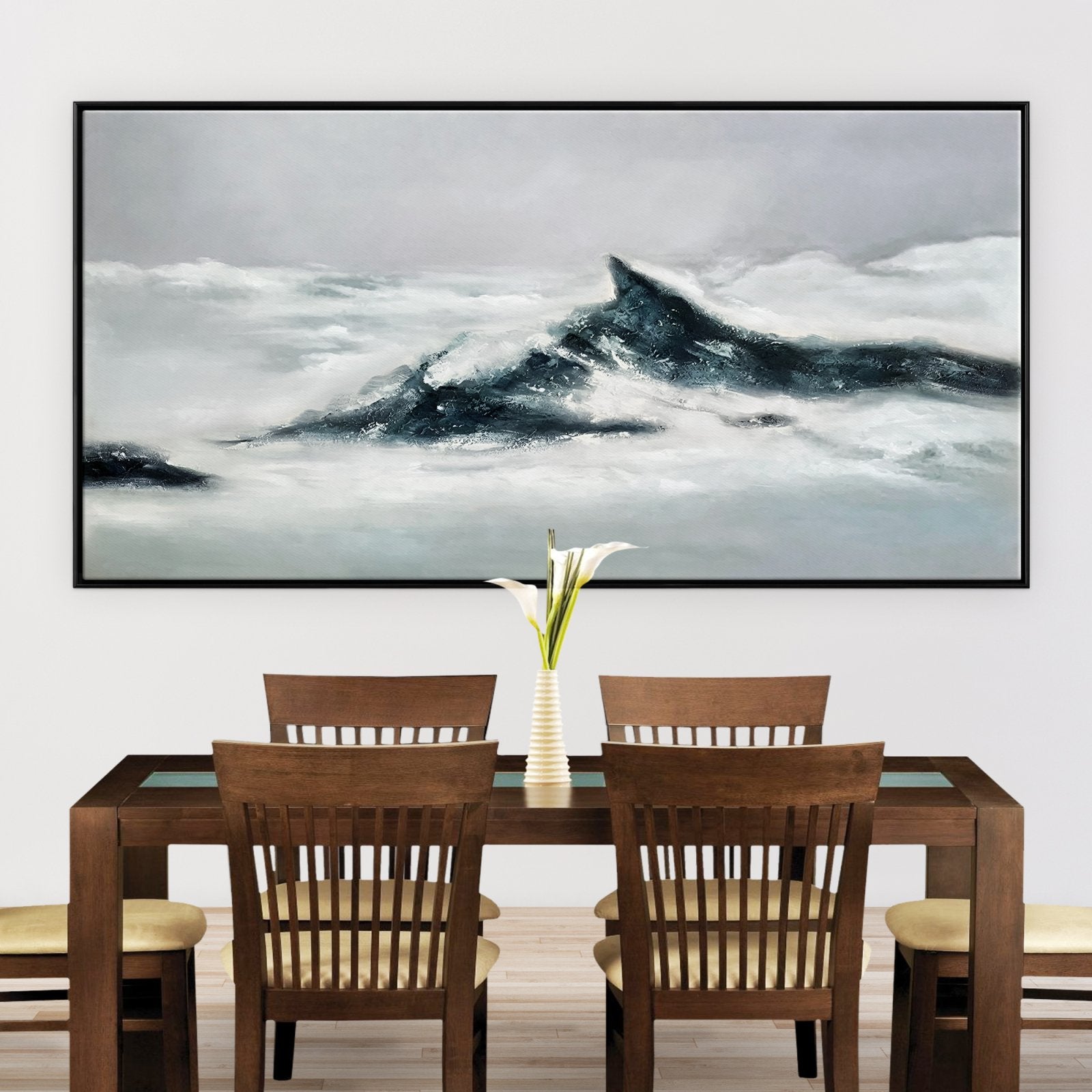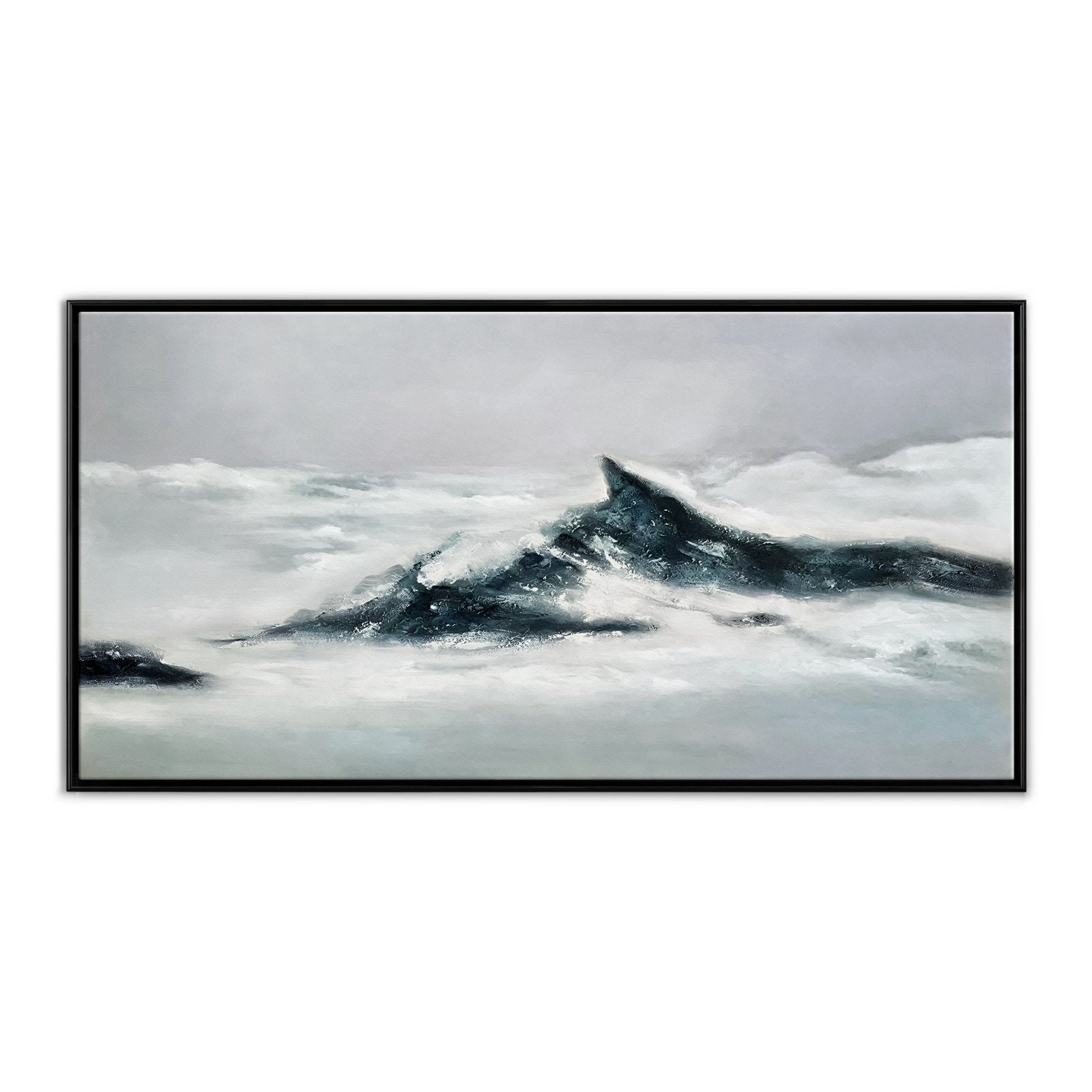 ¡Estamos en las nubes con la belleza de esta obra! "En las Nubes" es una obra moderna e impresionista que muestra imponentes montañas que se alzan sobre un suave manto de nubes. Con hermosos contrastes, ¡podrás sumergirte en esta pieza durante horas!