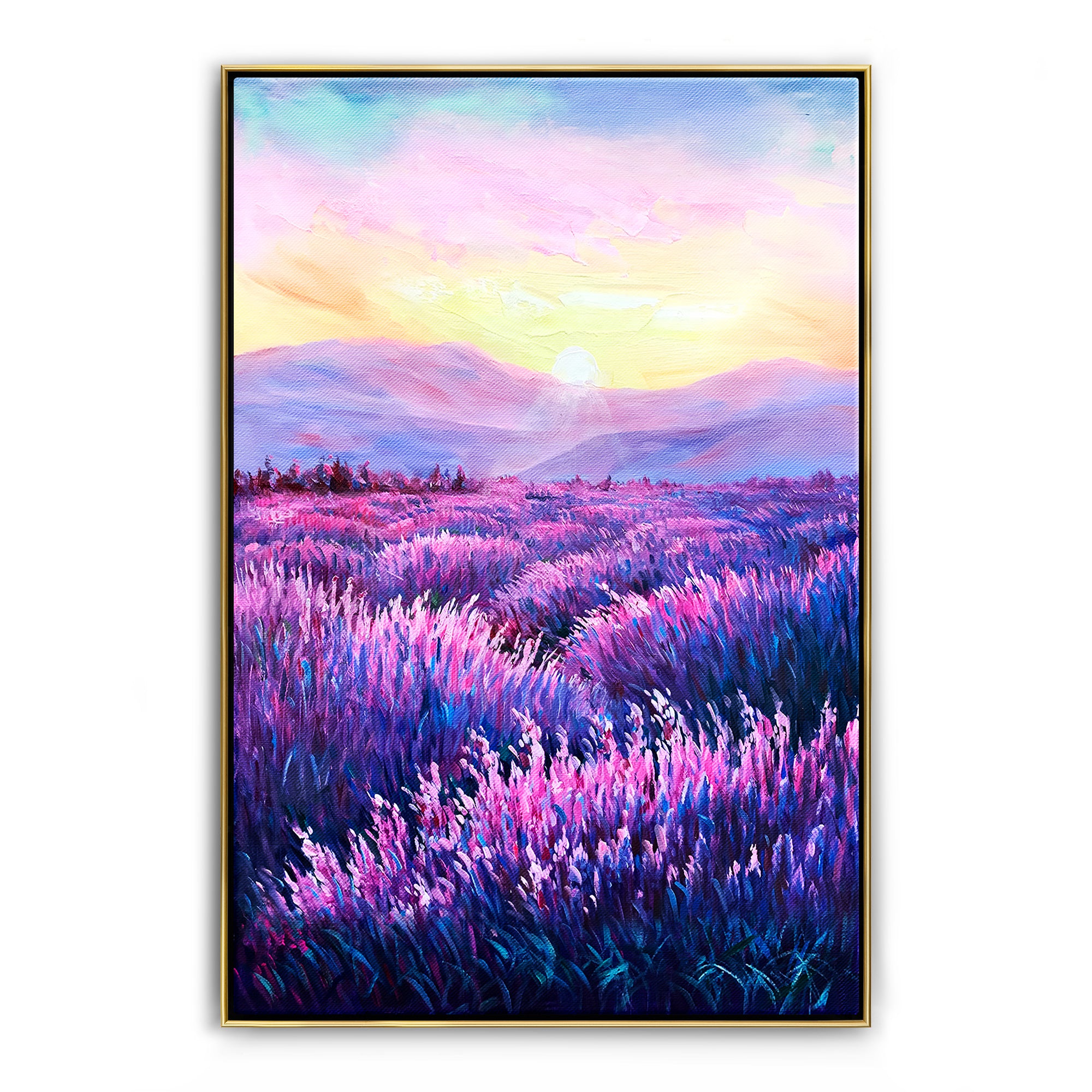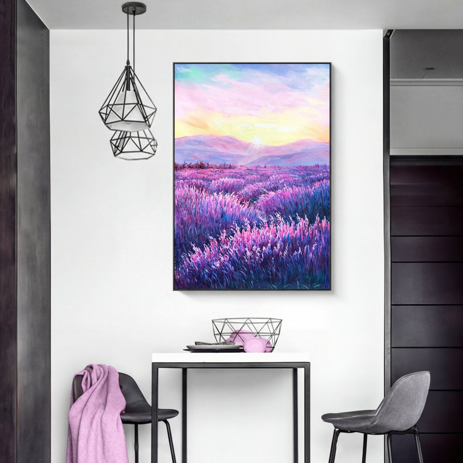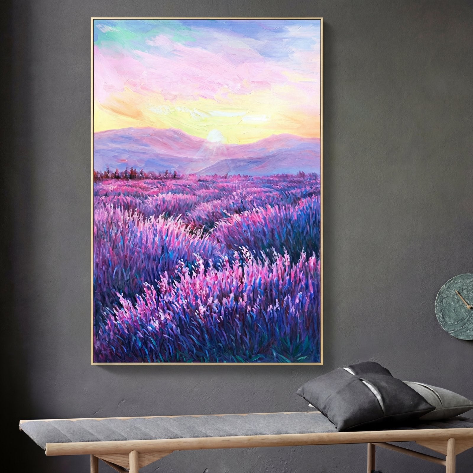 Simultáneamente relajante y acogedora, esta nueva obra de arte hecha a mano con campos de lavanda le da un nuevo significado al color púrpura. Una composición impresionante y un maravilloso paisaje de nubes te llevan más lejos para explorar lo que hay más allá.