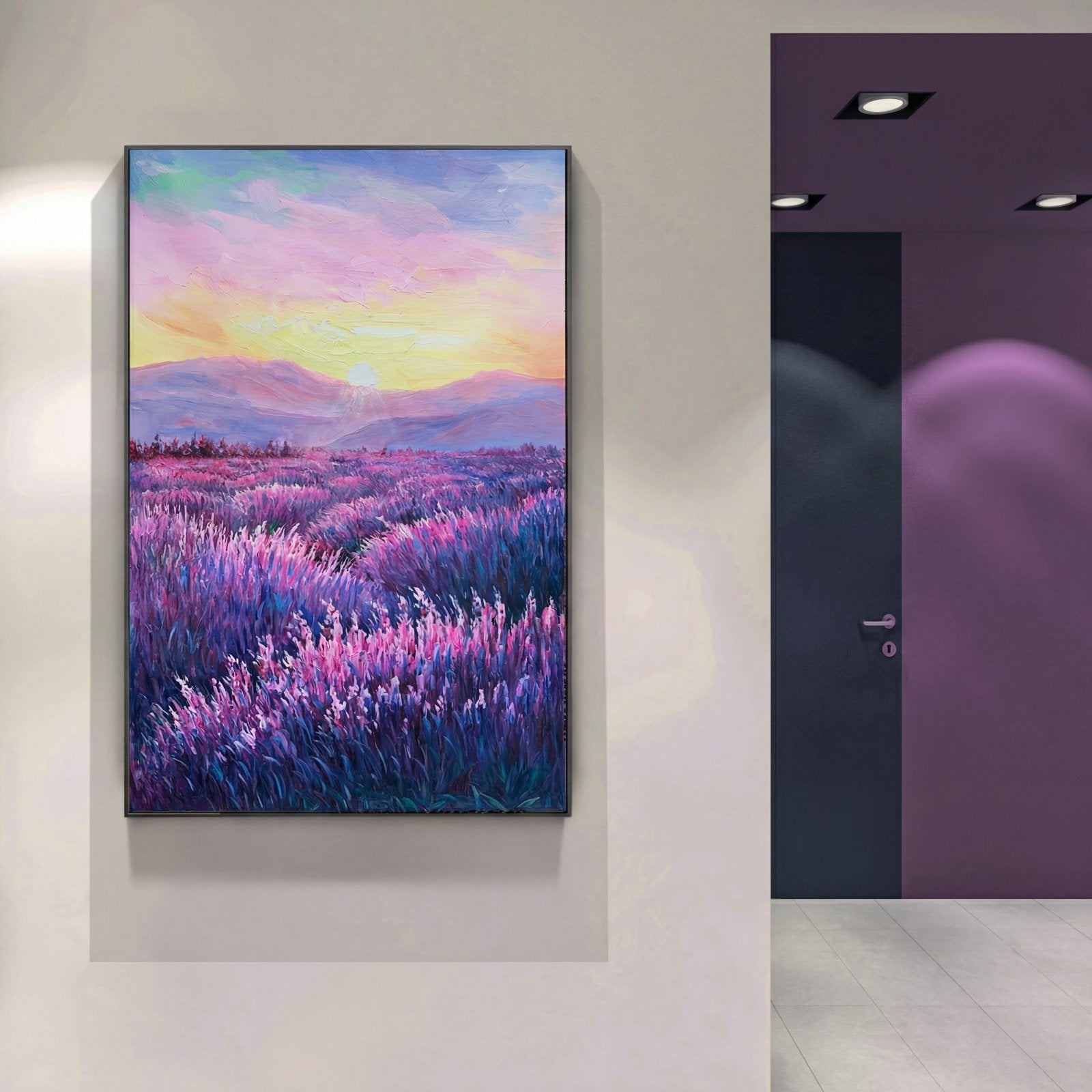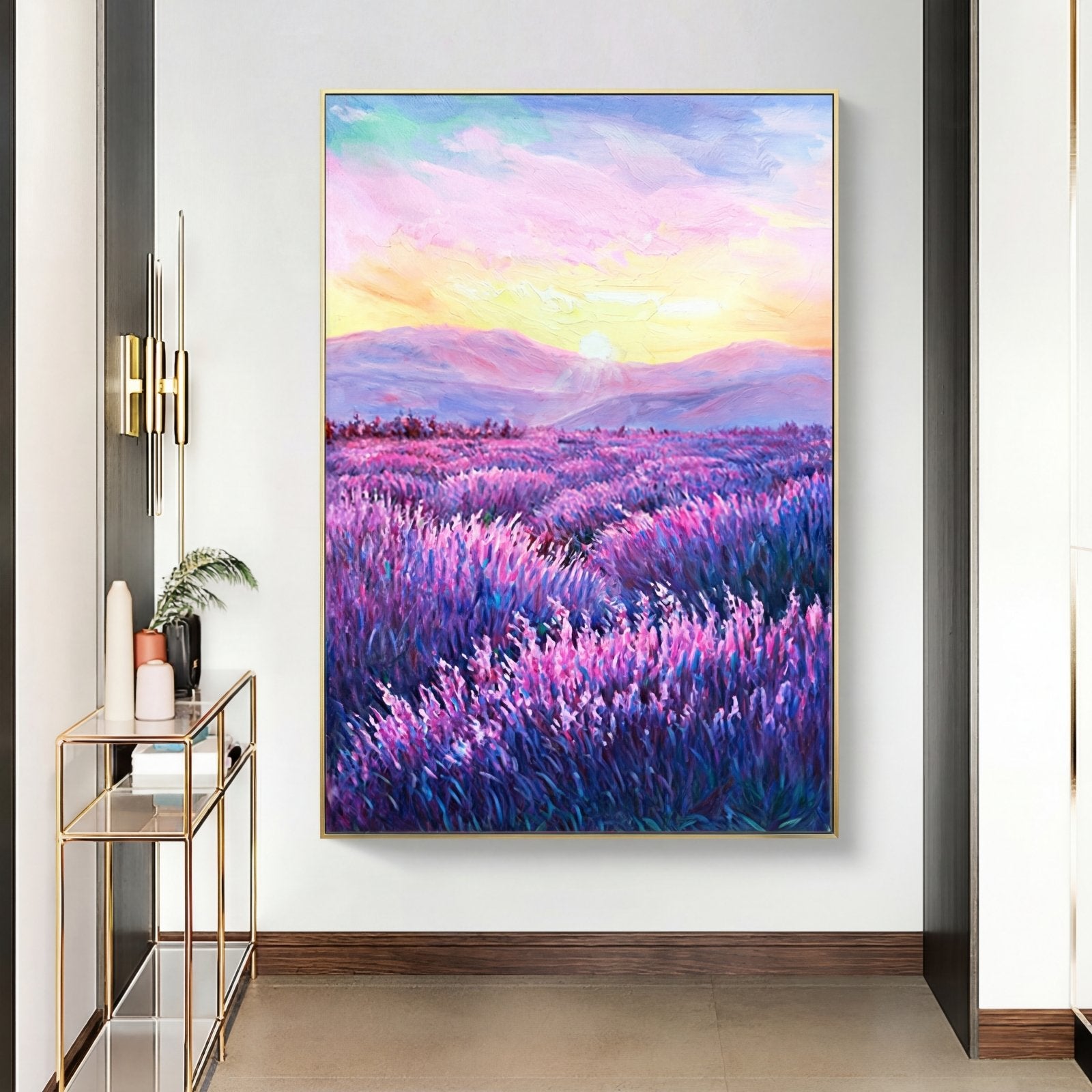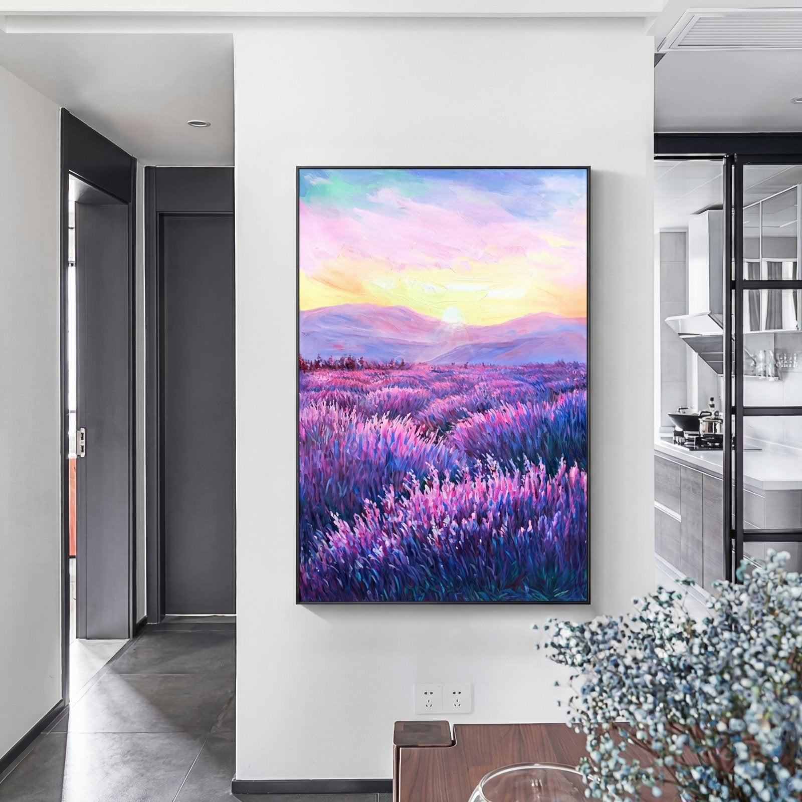 Simultáneamente relajante y acogedora, esta nueva obra de arte hecha a mano con campos de lavanda le da un nuevo significado al color púrpura. Una composición impresionante y un maravilloso paisaje de nubes te llevan más lejos para explorar lo que hay más allá.