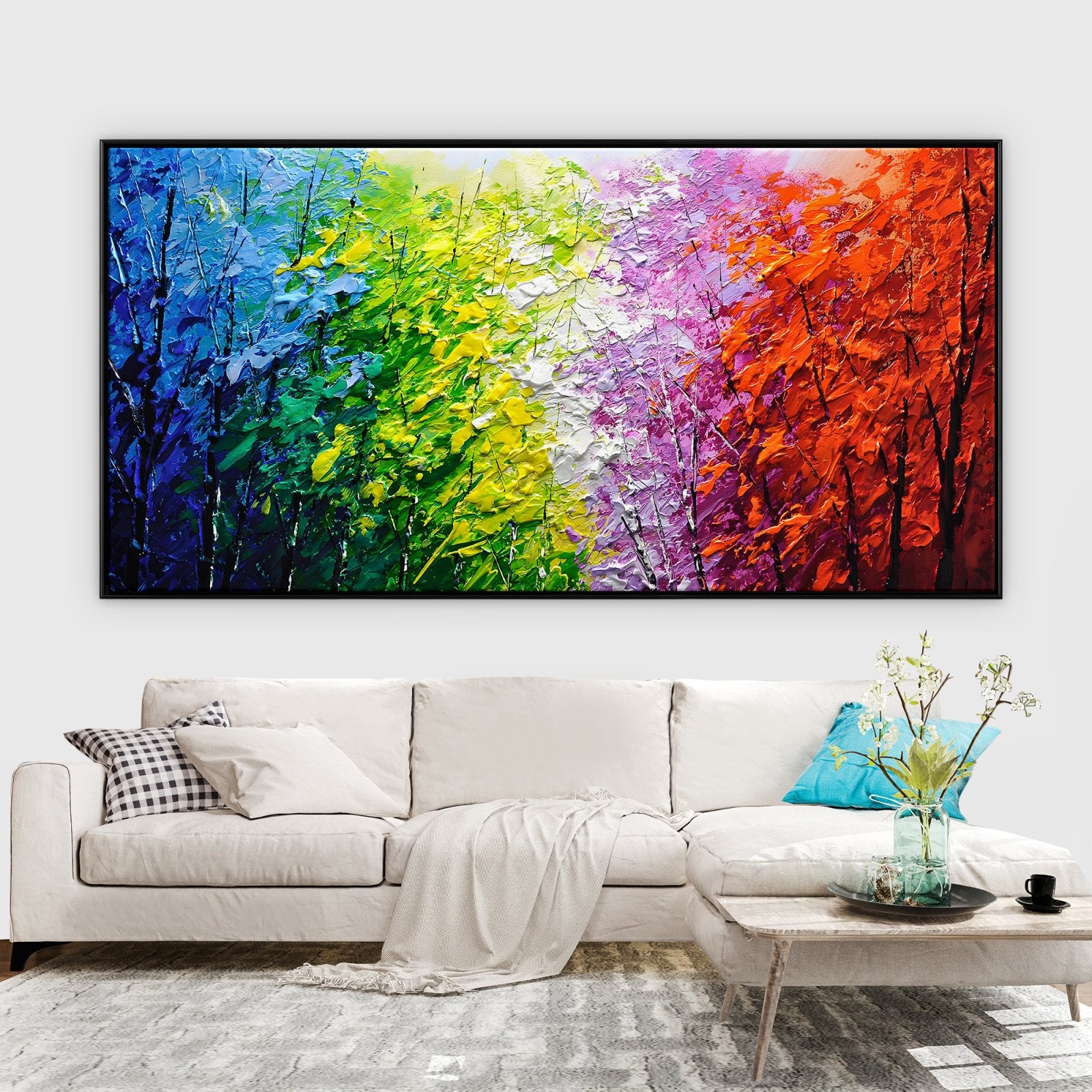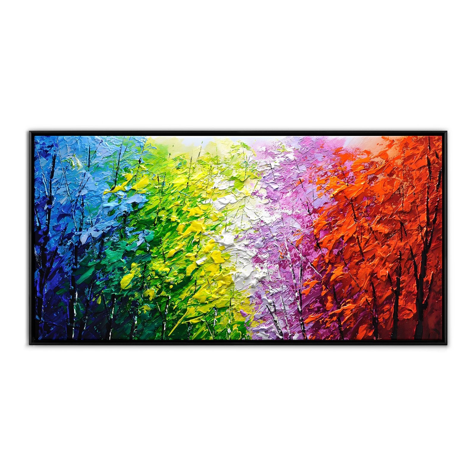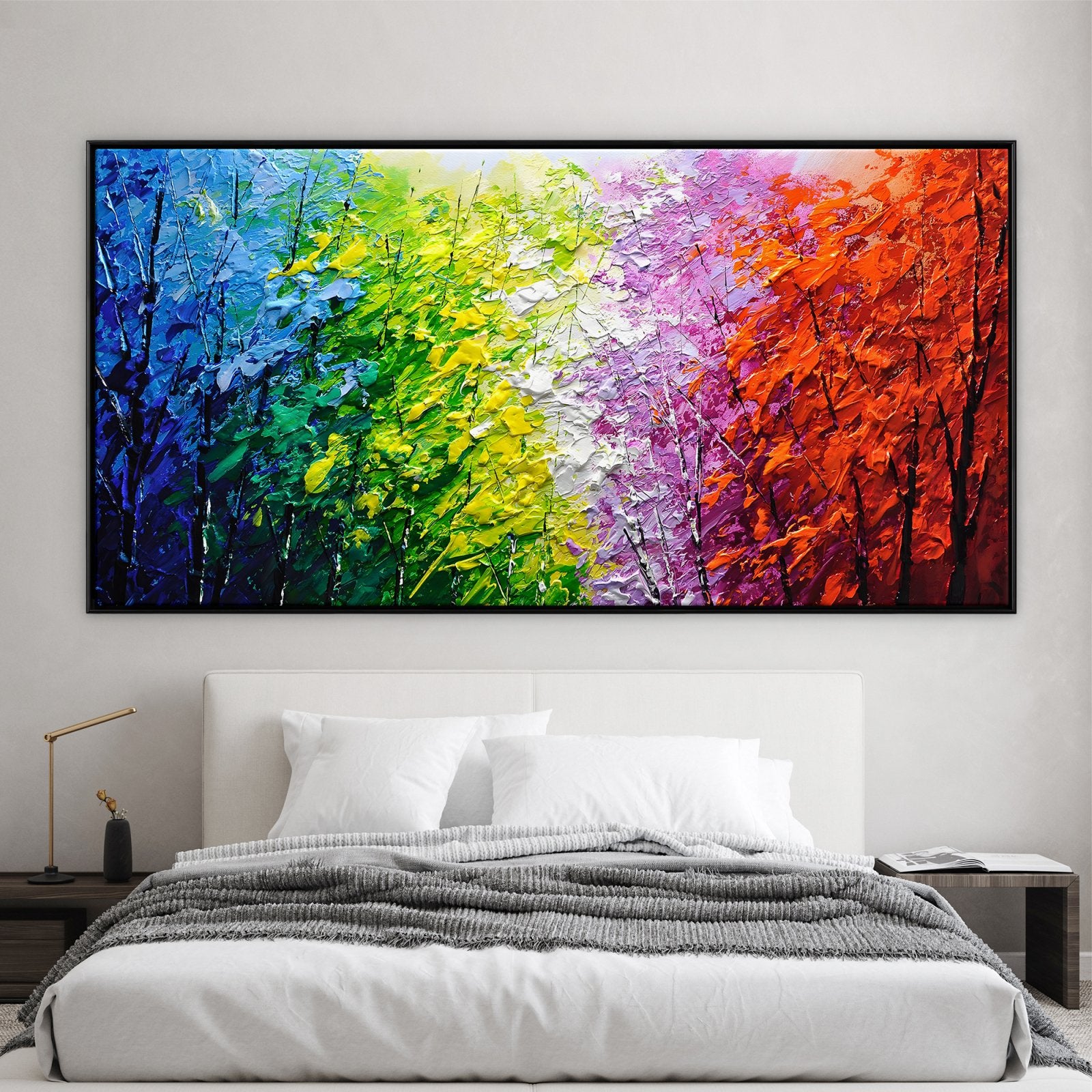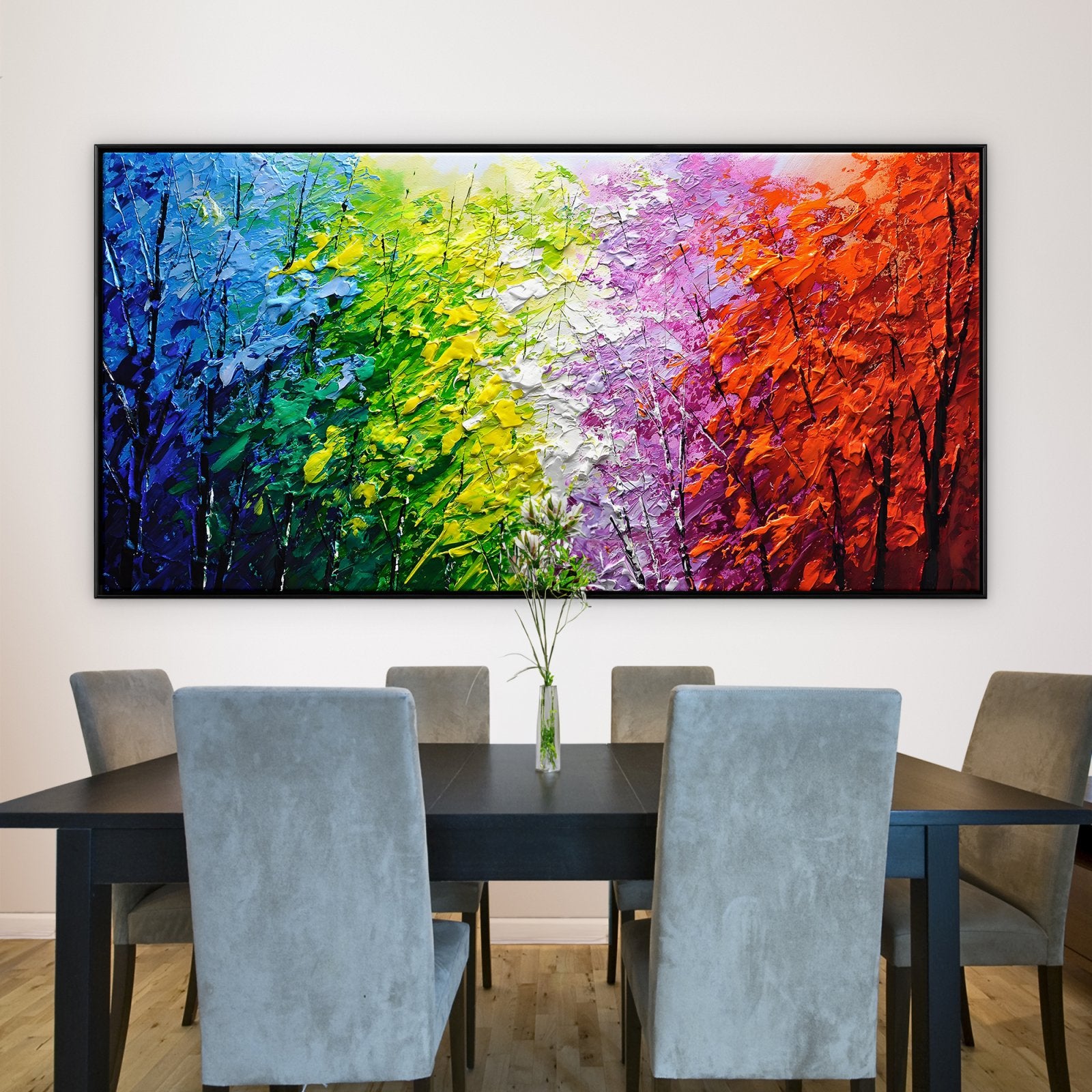 Imagina caminar por un bosque donde cada hoja tiene un color diferente. Esta pintura da vida a esa escena con ricas texturas y vibrantes tonos, lo que la convierte en la opción perfecta para añadir energía y emoción a tu interior.