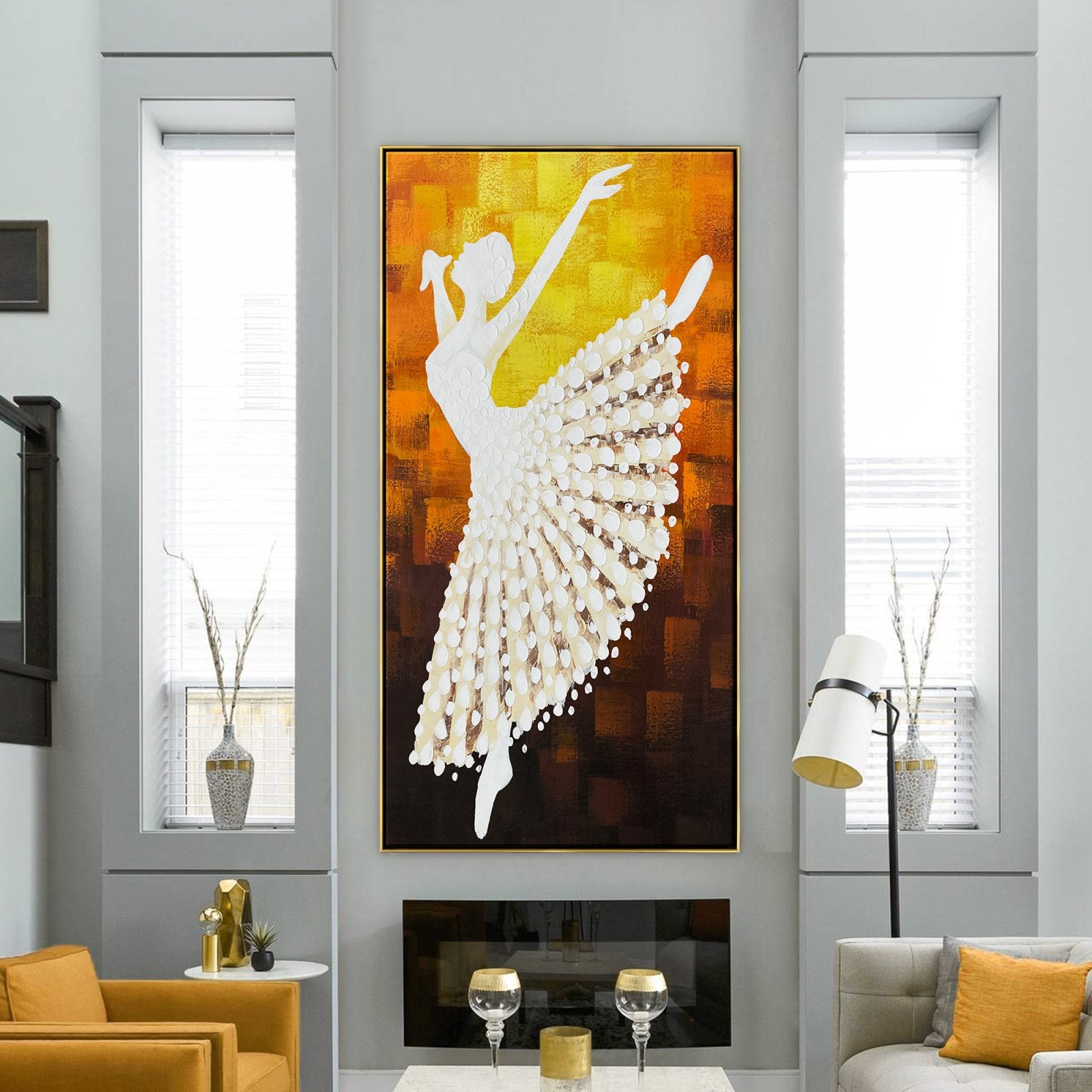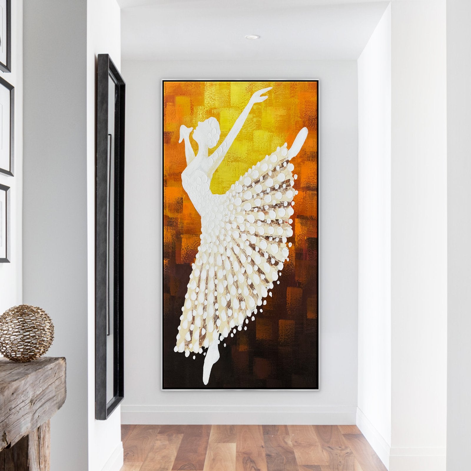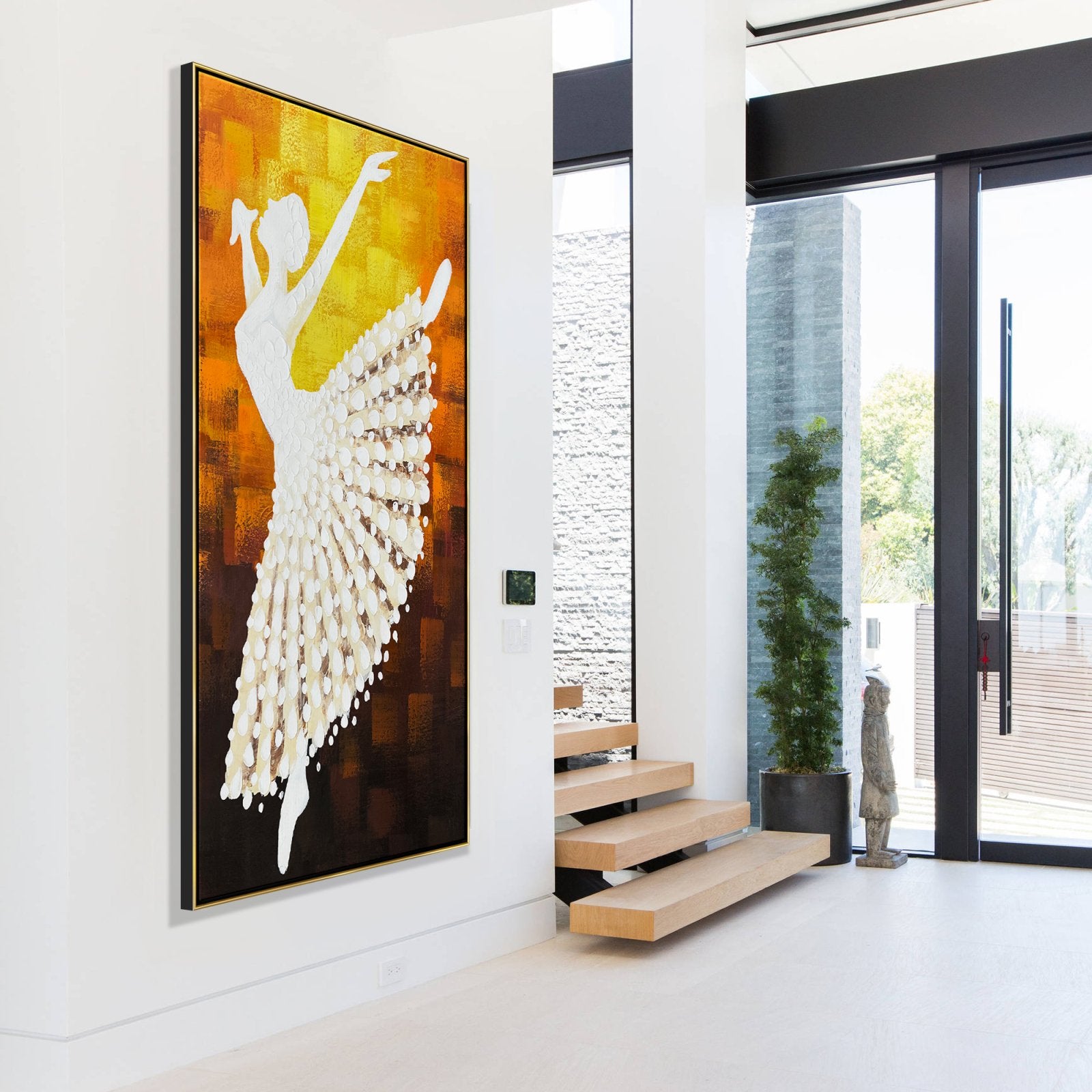 El cuadro representa a una bailarina bailando sobre un fondo marrón dorado. Los colores llamativos y las hermosas pinceladas la convierten en una de las piezas más hermosas que jamás hayamos visto. ¡Le dará a cualquier habitación un ambiente elegante! ¡Simplemente impresionante!