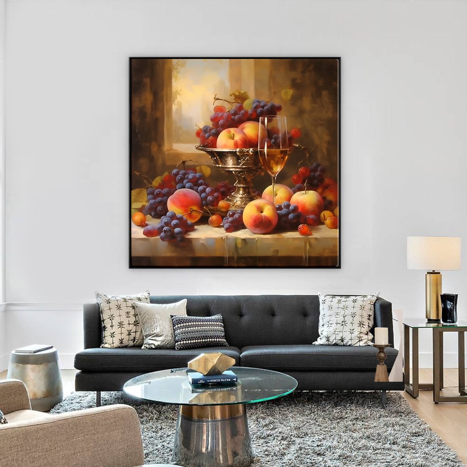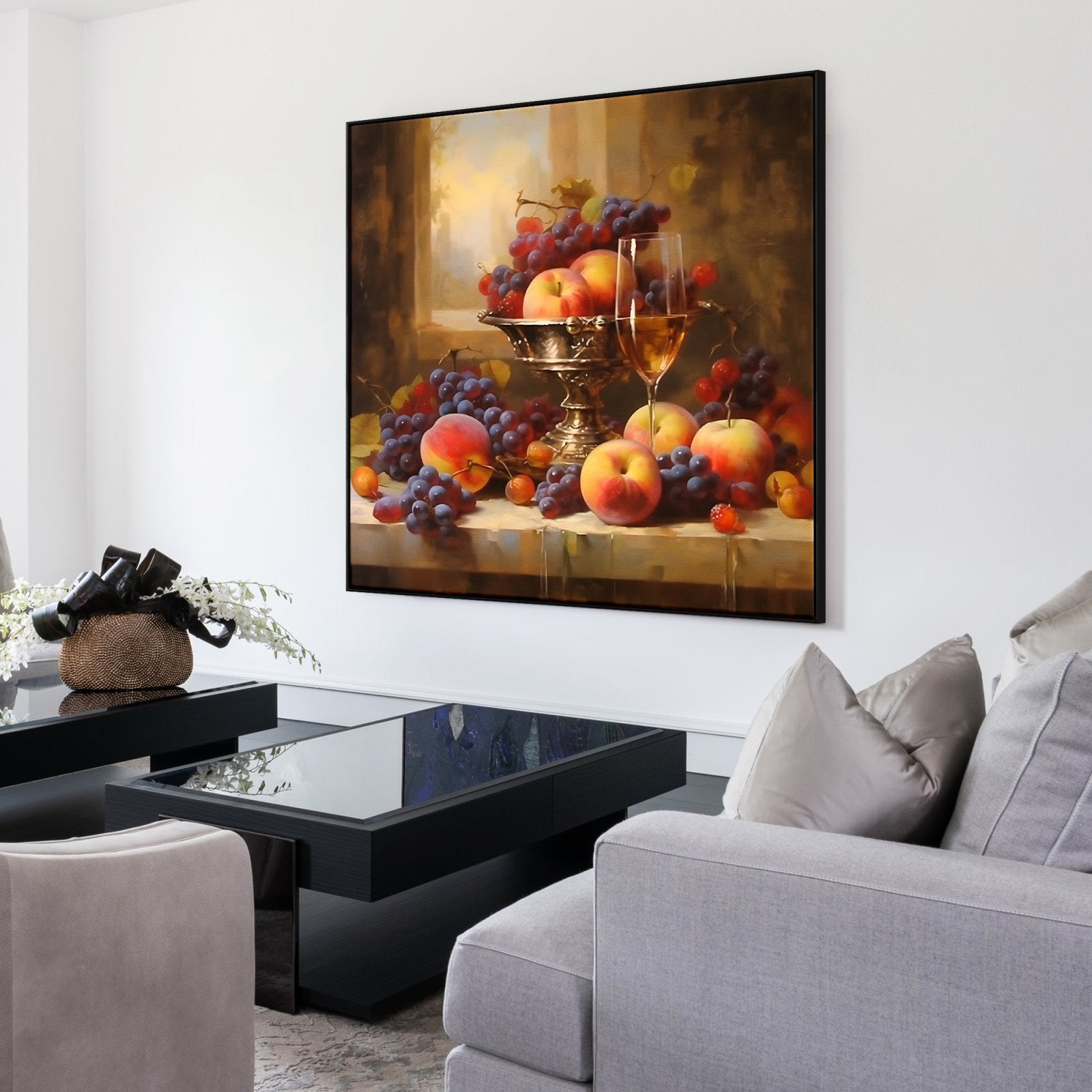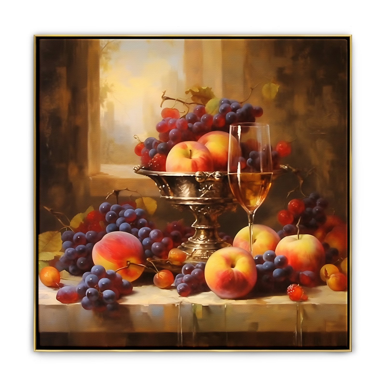 Disfrute del festín visual de "Bodegón Lujoso". El estilo realista del artista y su meticulosa atención al detalle crean un vibrante bodegón que brilla con la suntuosa belleza de frutas frescas y exquisiteces.