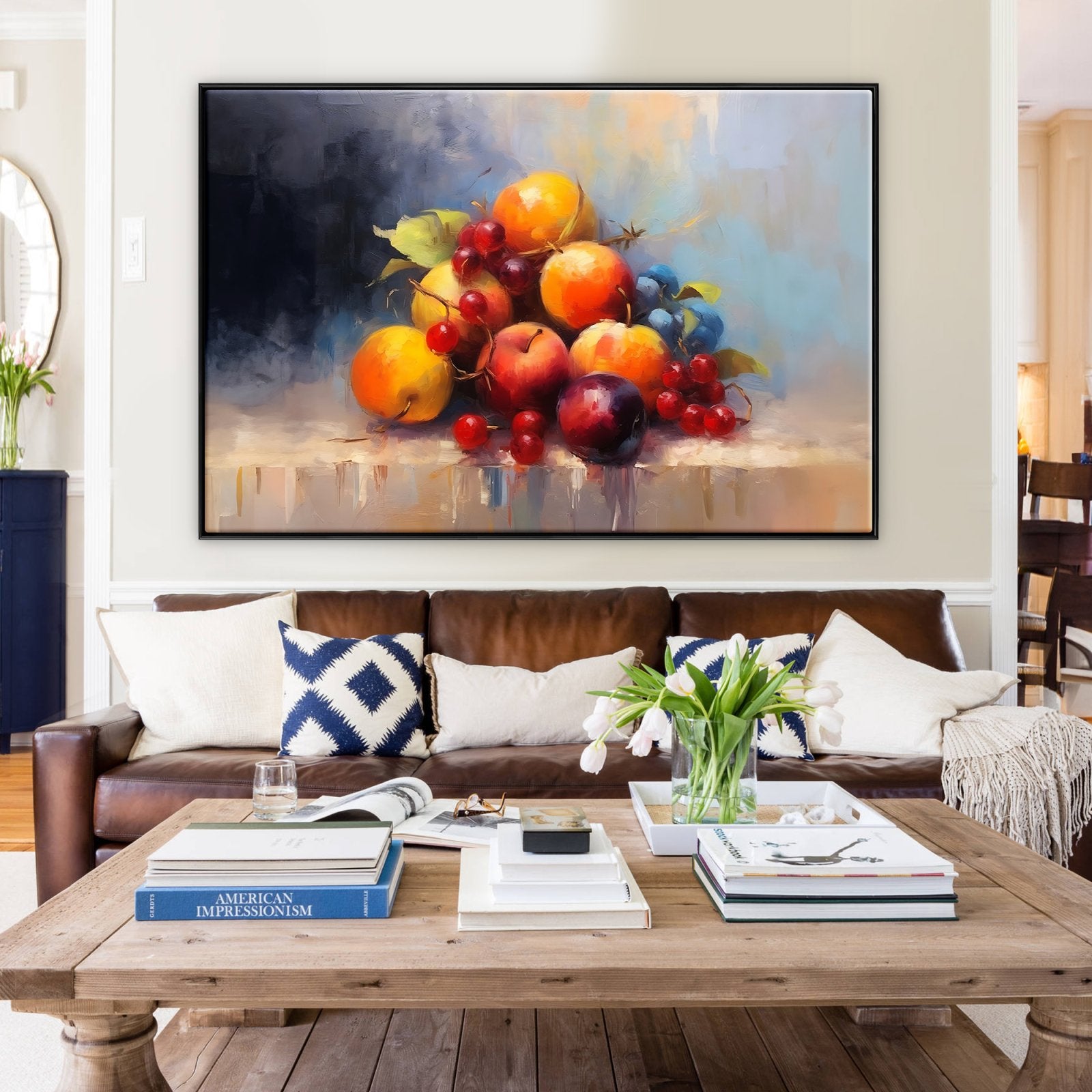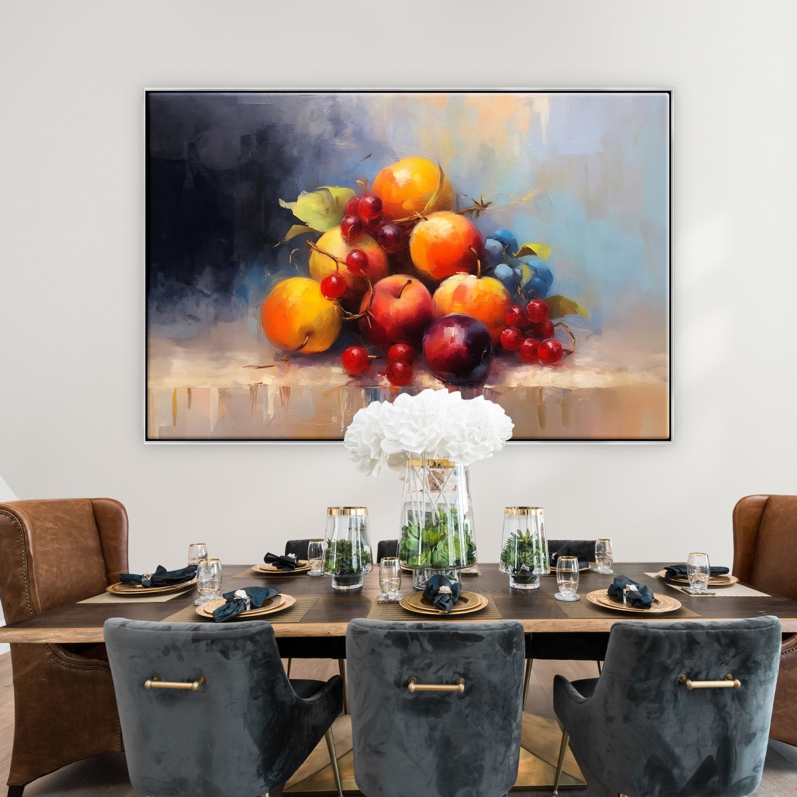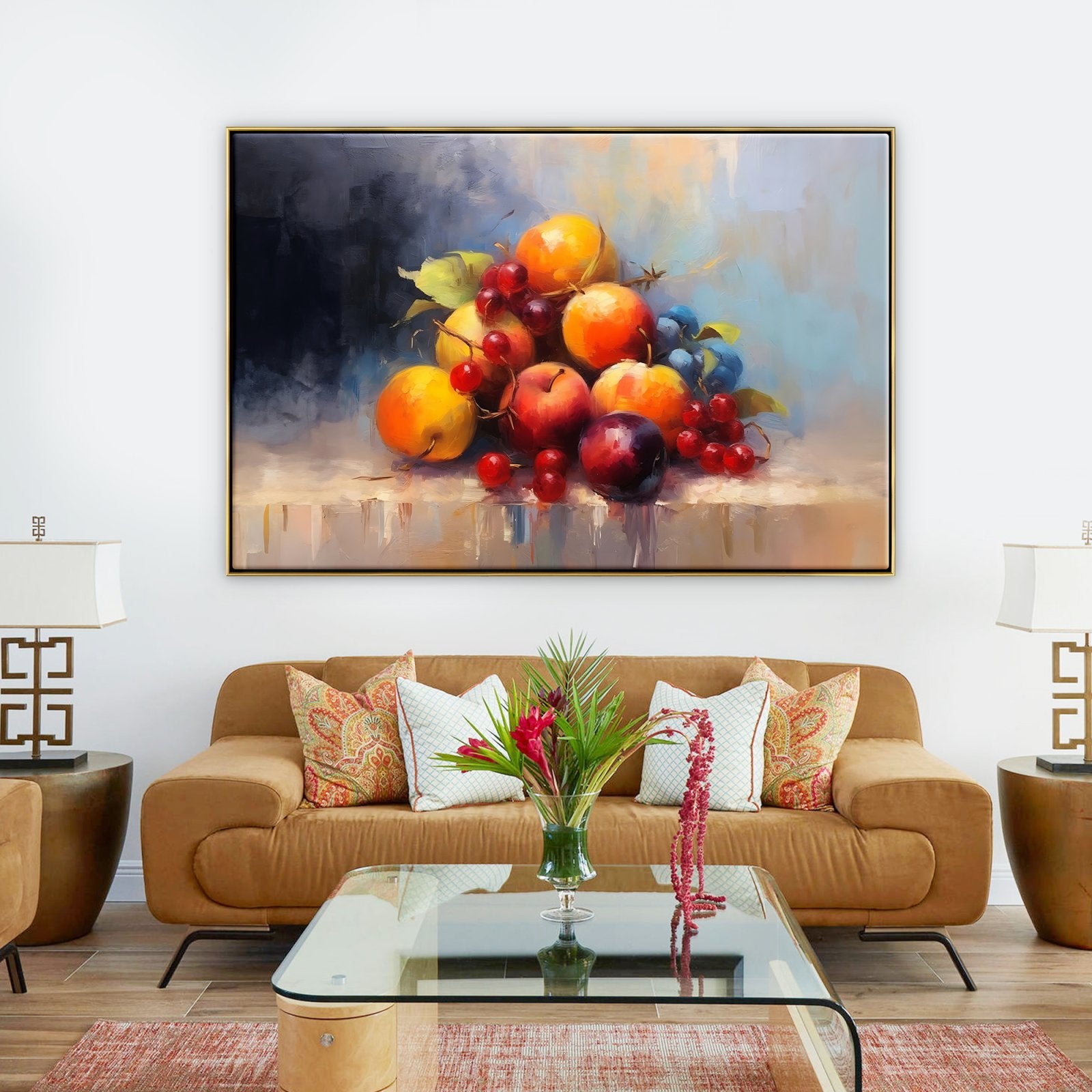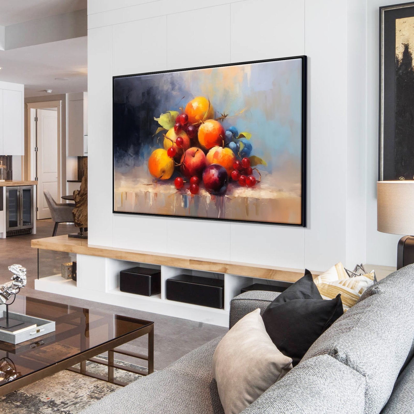 Experimente una paleta de frescura en este bodegón moderno. La obra captura los vibrantes colores y la vitalidad de las frutas, convirtiéndola en un elemento vibrante y llamativo para su entorno.