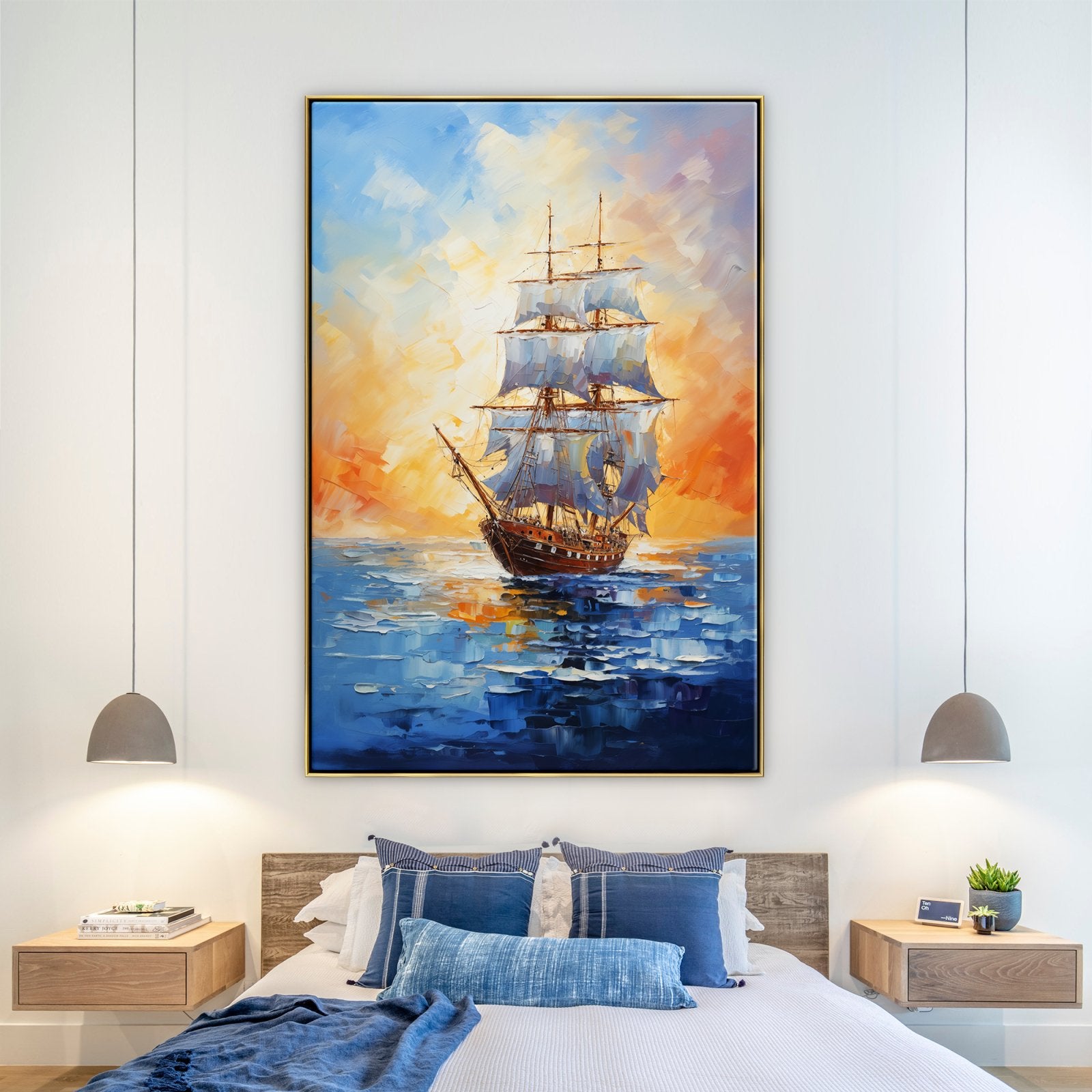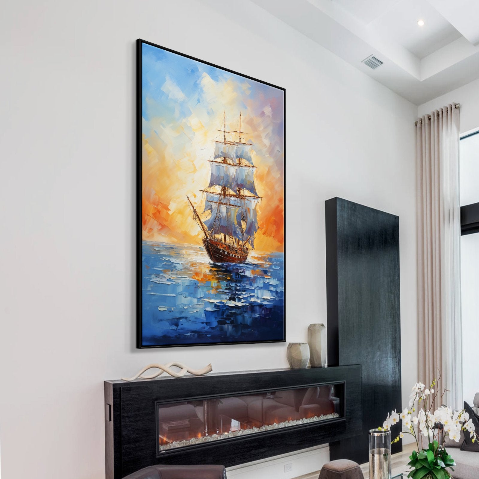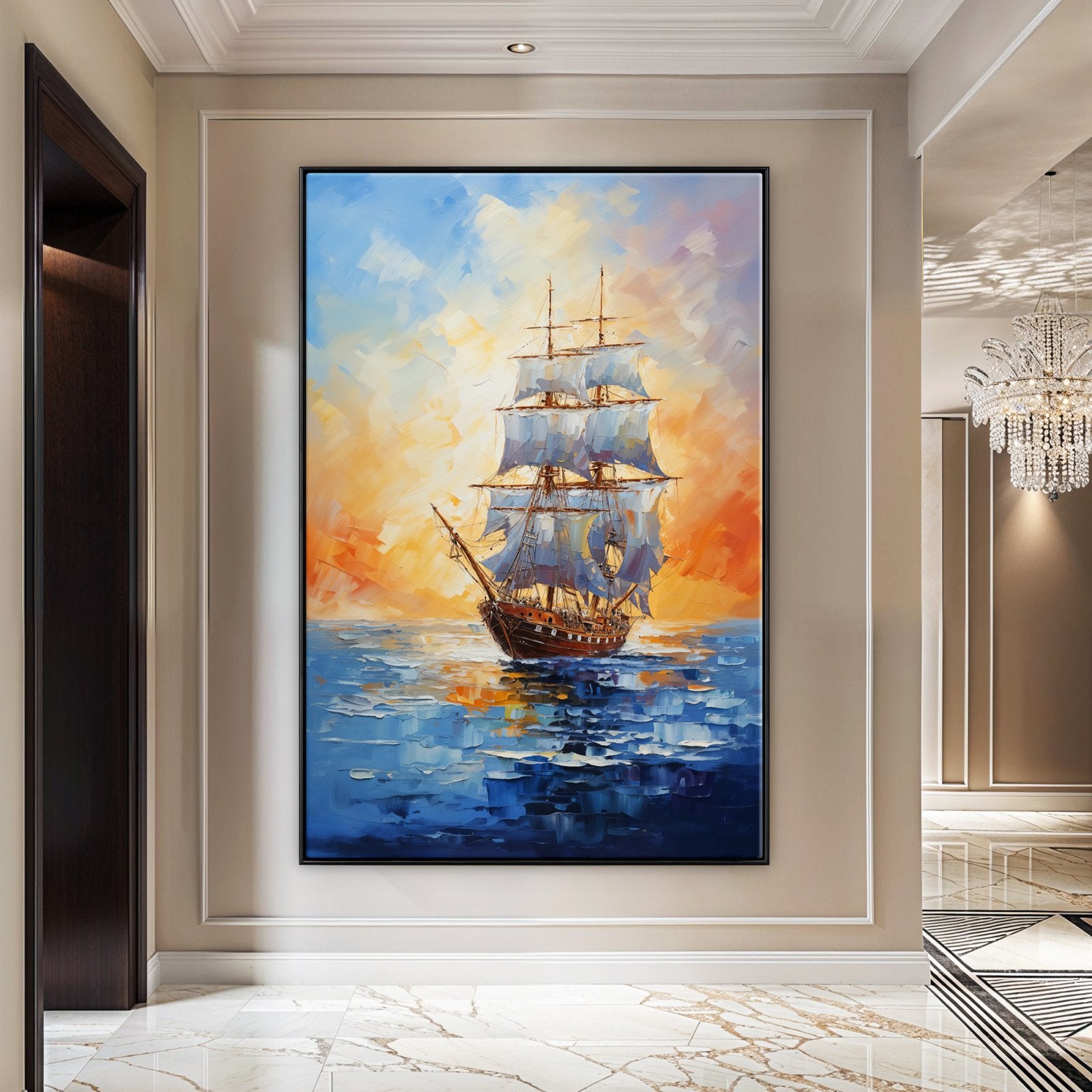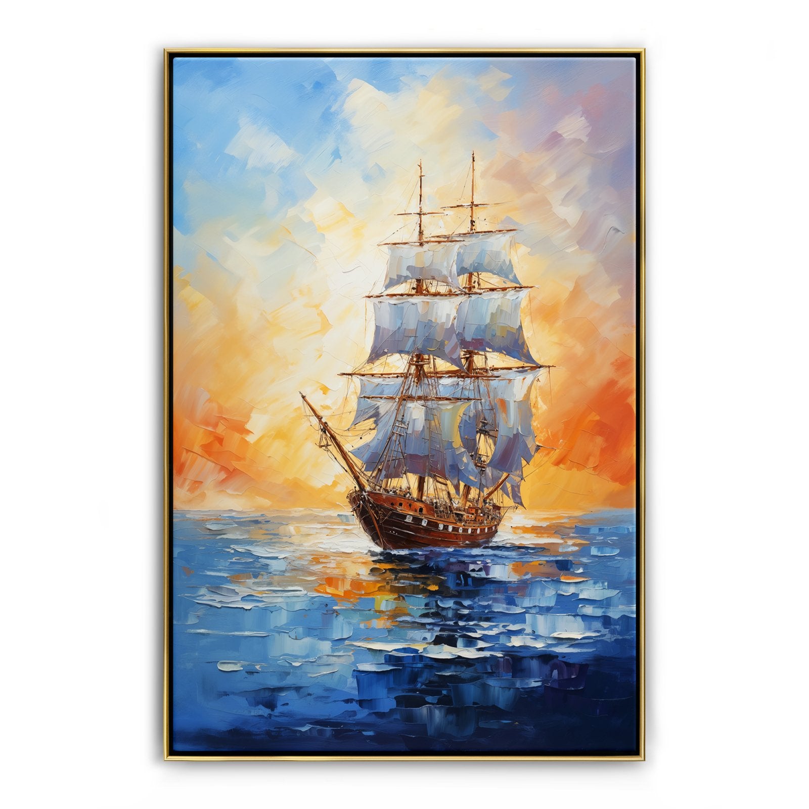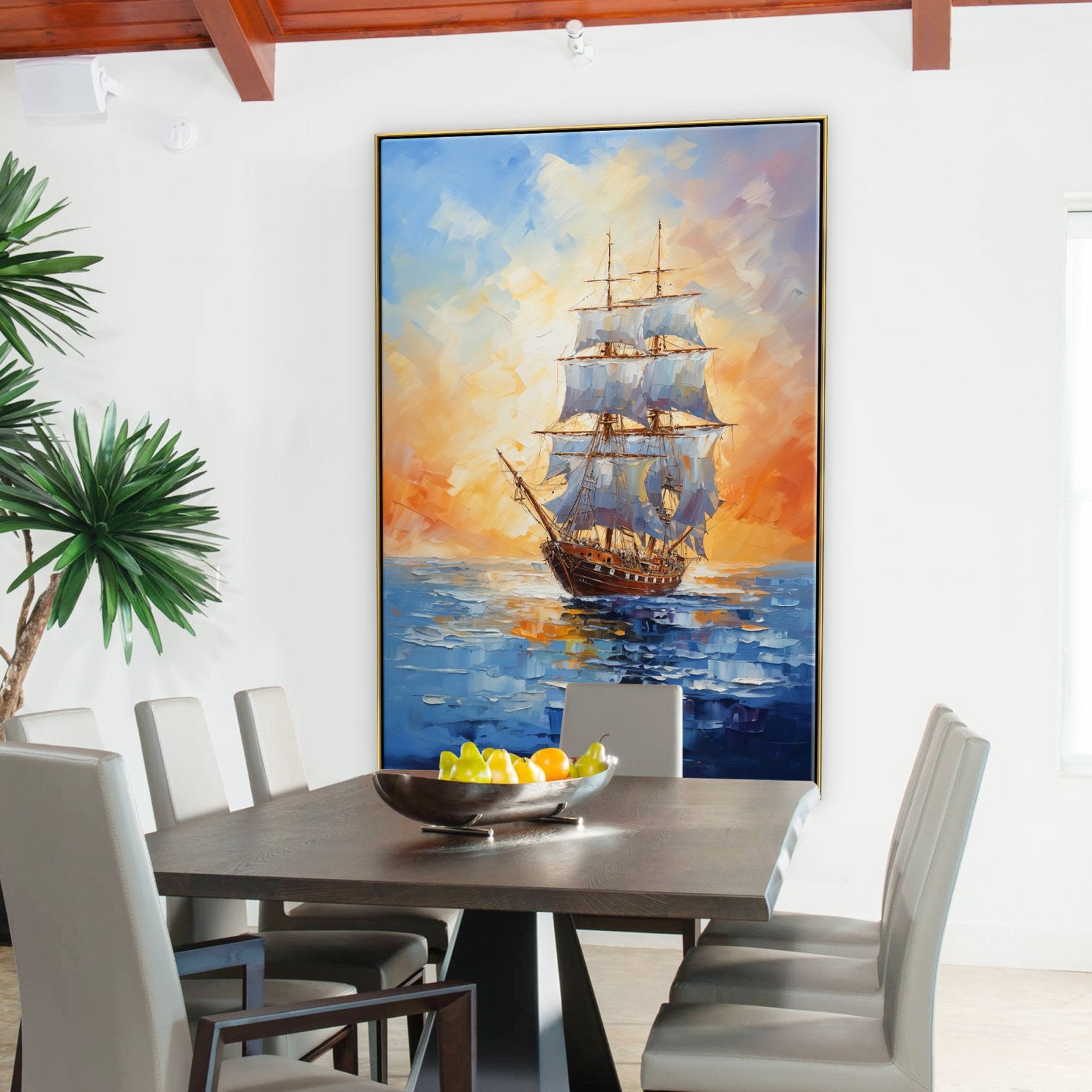 Una escena majestuosa se despliega mientras el clásico barco emprende su viaje oceánico. Esta hermosa obra de arte realista captura la grandeza de la aventura marítima, invitándote a explorar y soñar más allá del horizonte.