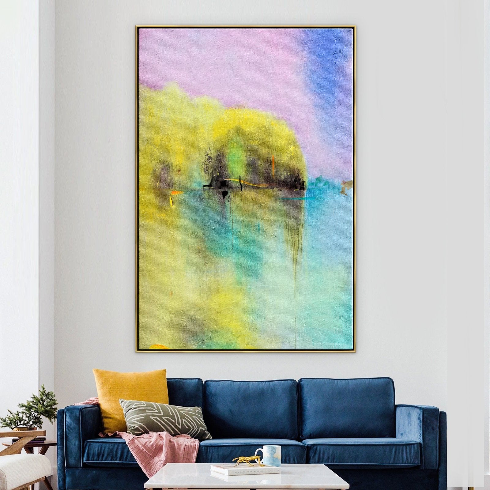 “Vacaciones de Verano” es una pintura abstracta que presenta una escena junto al lago. Los colores azul y amarillo del cuadro son hermosos y están inspirados en el recuerdo de unas vacaciones de verano de tu infancia.