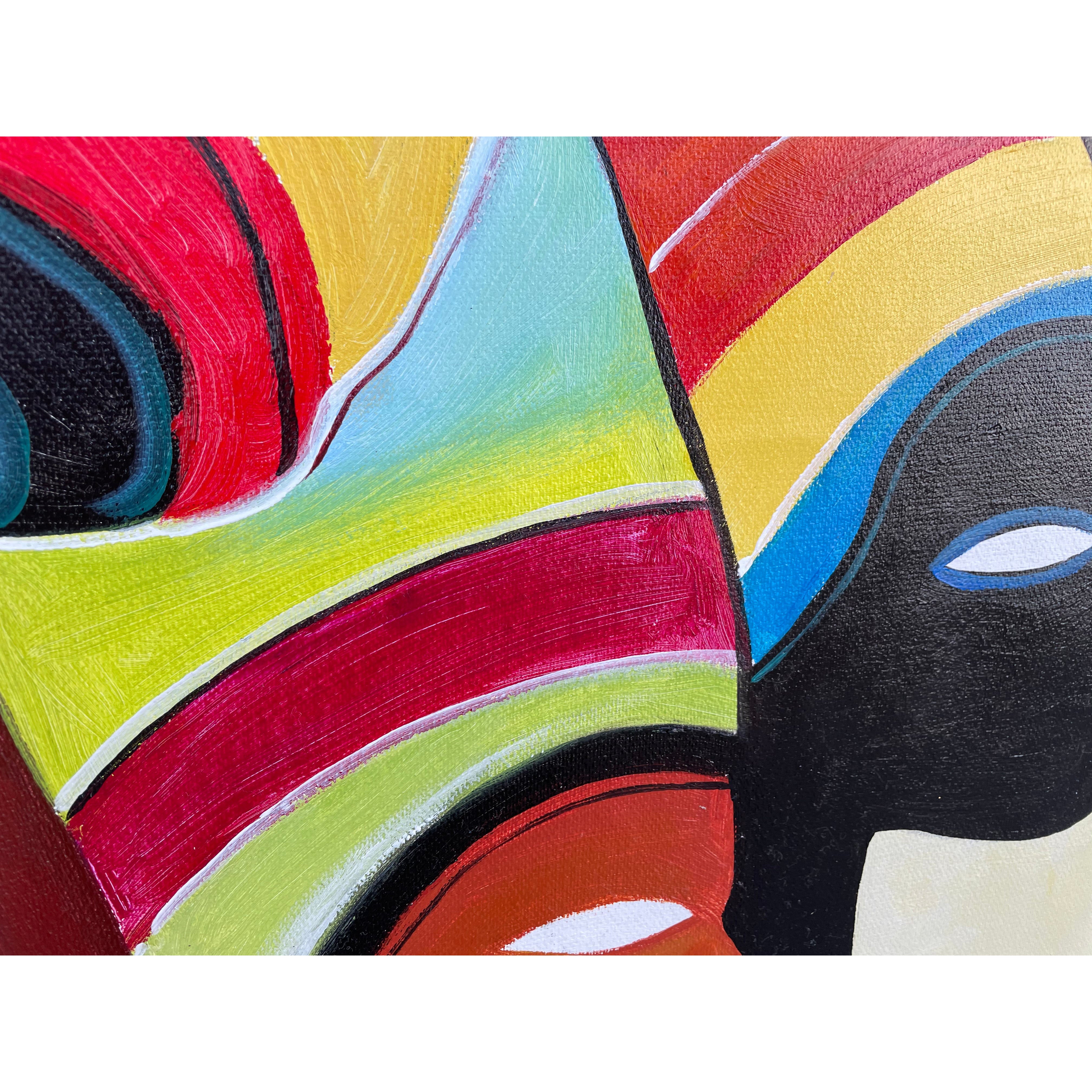 Estas son las Diosas del Sol, portadoras de luz y guardianas de la oscuridad. Esta escena africana está pintada con un estilo distintivo, lo que le da mucho carácter a este exótico lienzo.