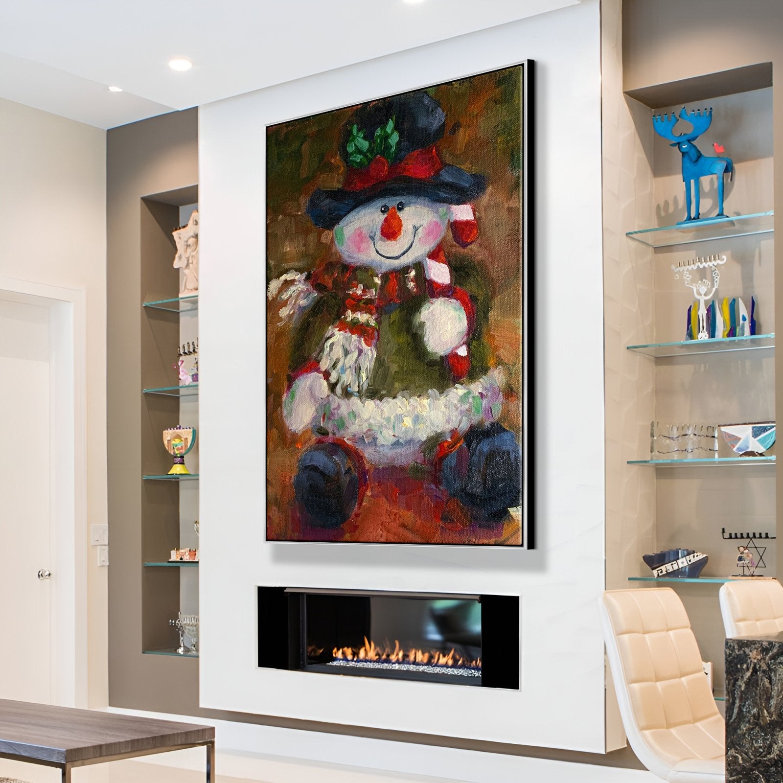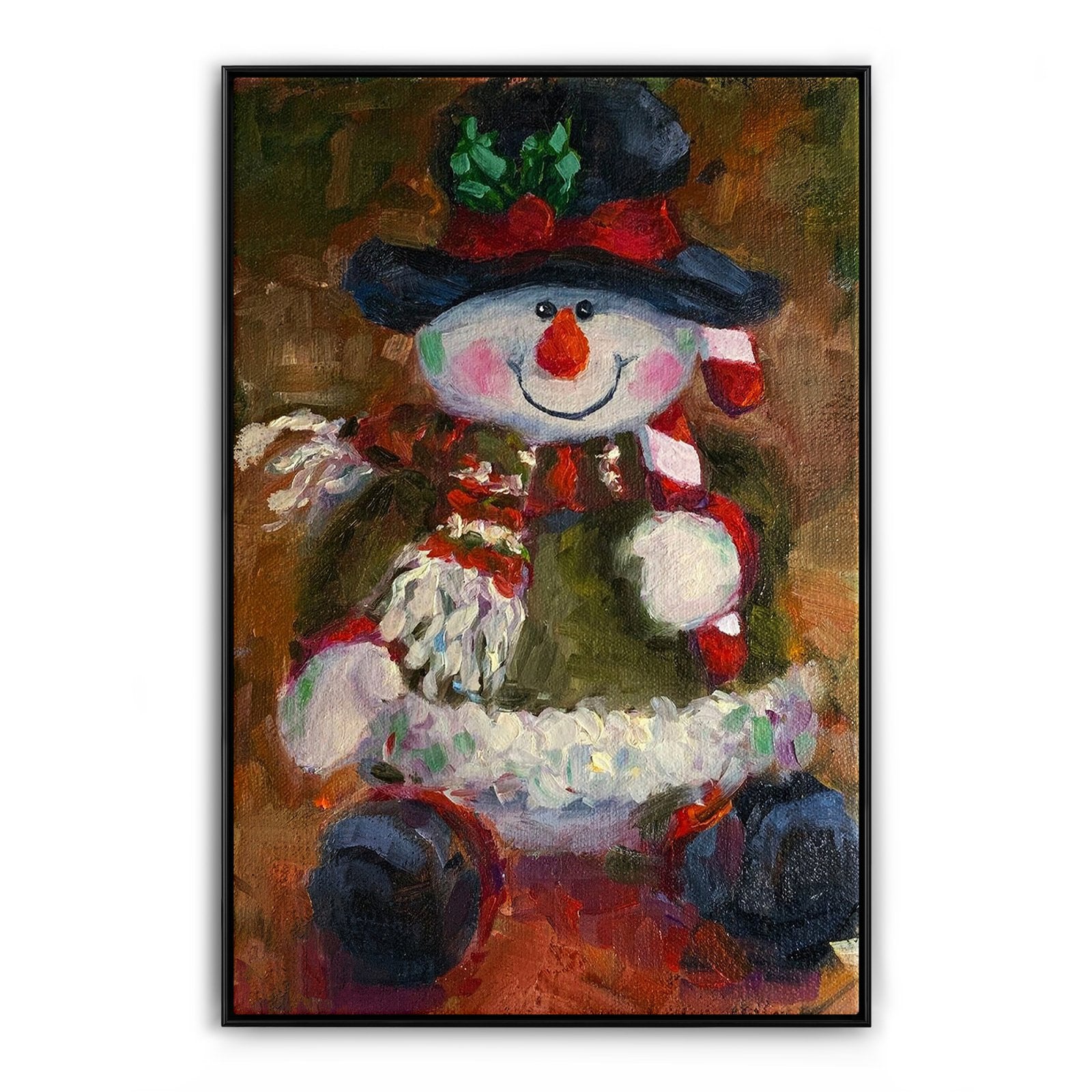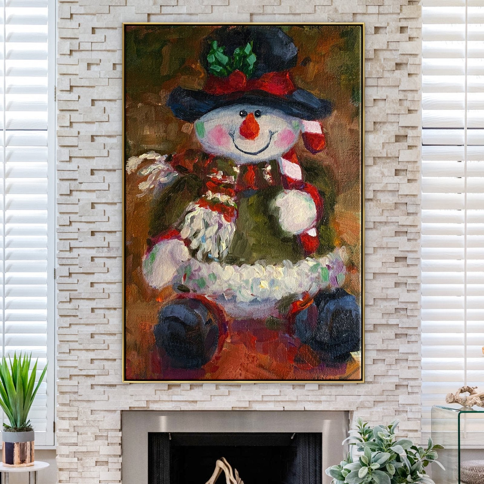 En esta encantadora escena, un muñeco de nieve ocupa un lugar central, vestido con un conjunto festivo navideño. Con una nariz de zanahoria y una bufanda que añade un toque de fantasía, esta obra de arte captura la esencia de las fiestas en una exhibición informalmente encantadora.