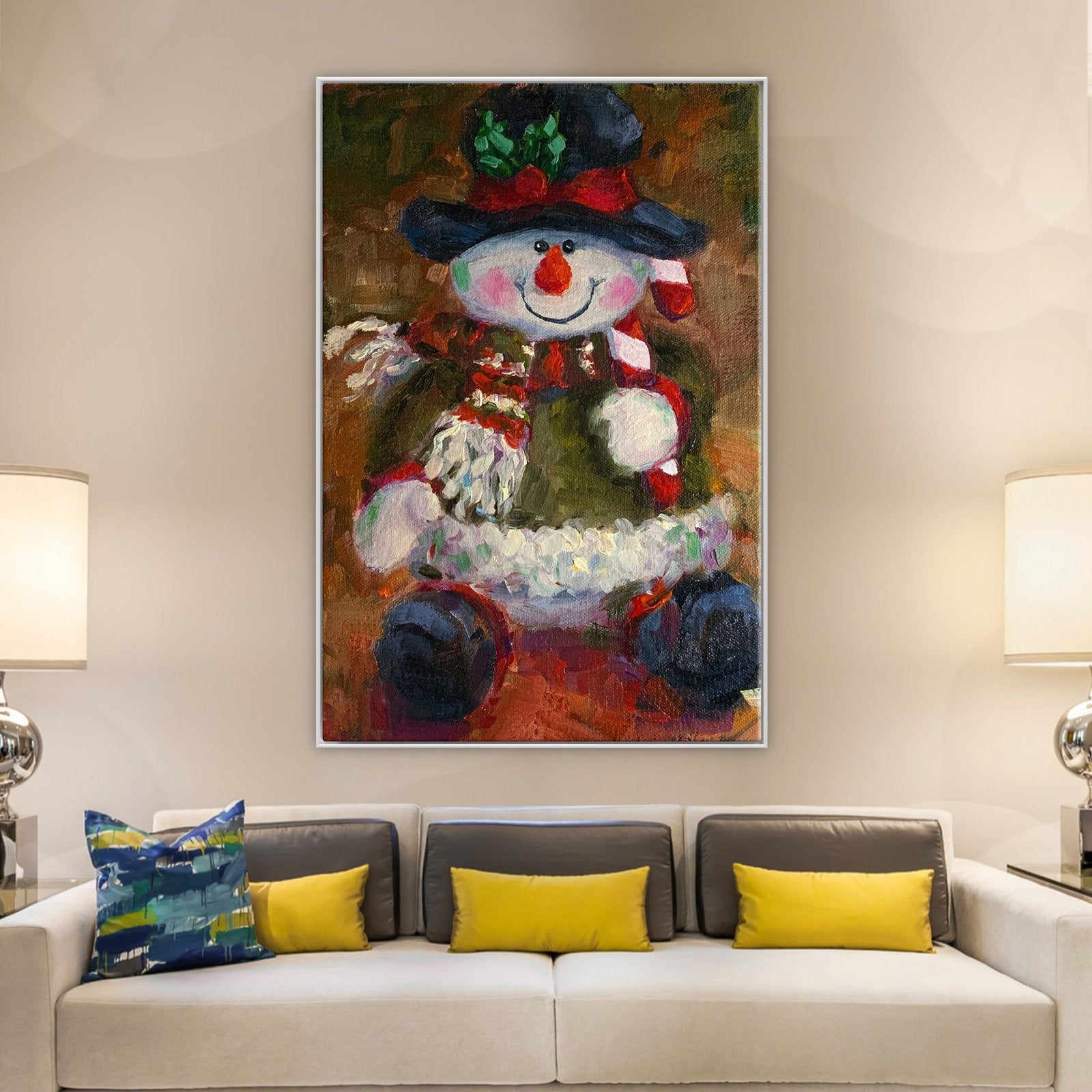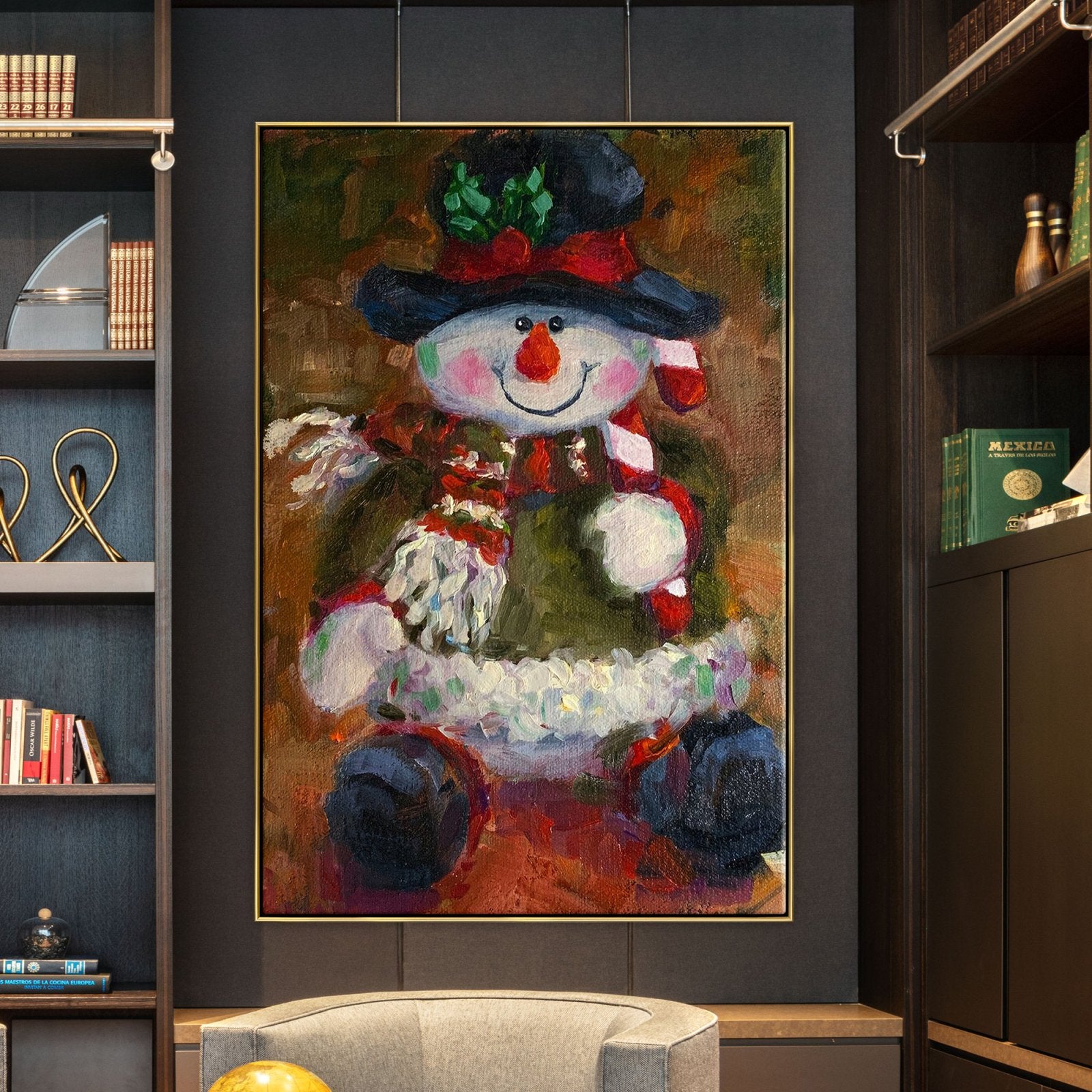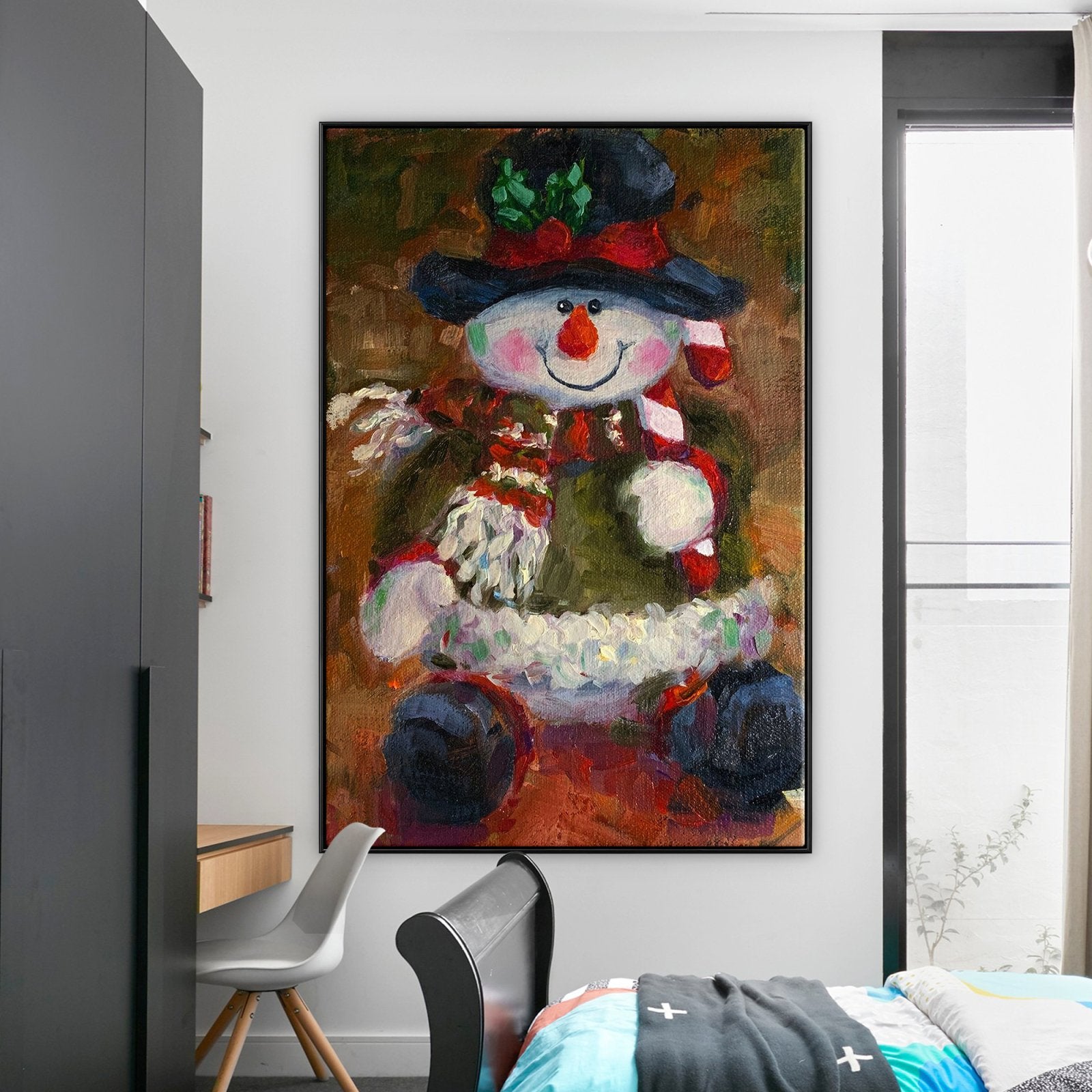 En esta encantadora escena, un muñeco de nieve ocupa un lugar central, vestido con un conjunto festivo navideño. Con una nariz de zanahoria y una bufanda que añade un toque de fantasía, esta obra de arte captura la esencia de las fiestas en una exhibición informalmente encantadora.