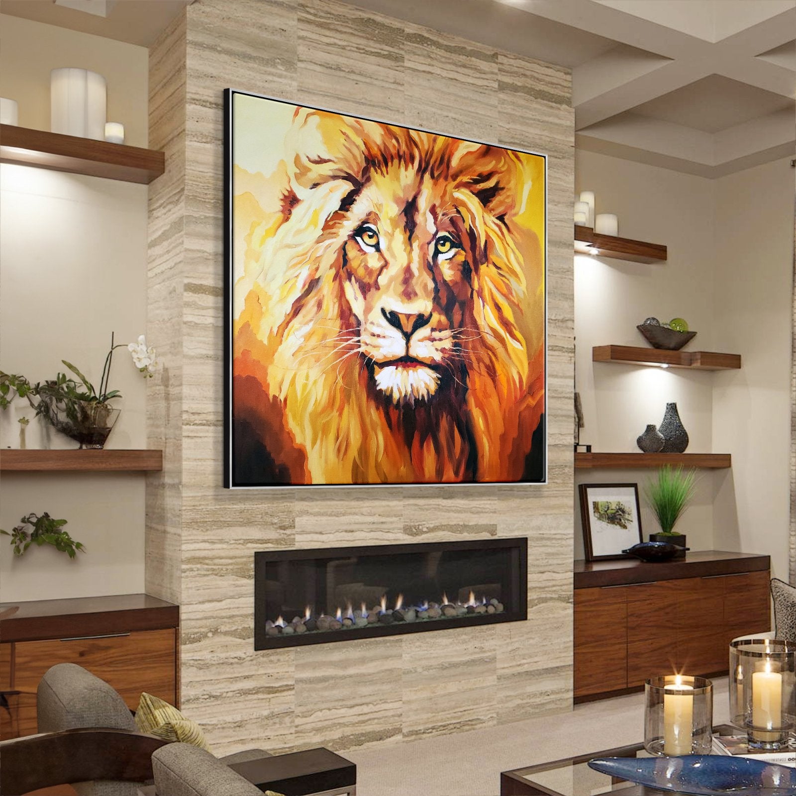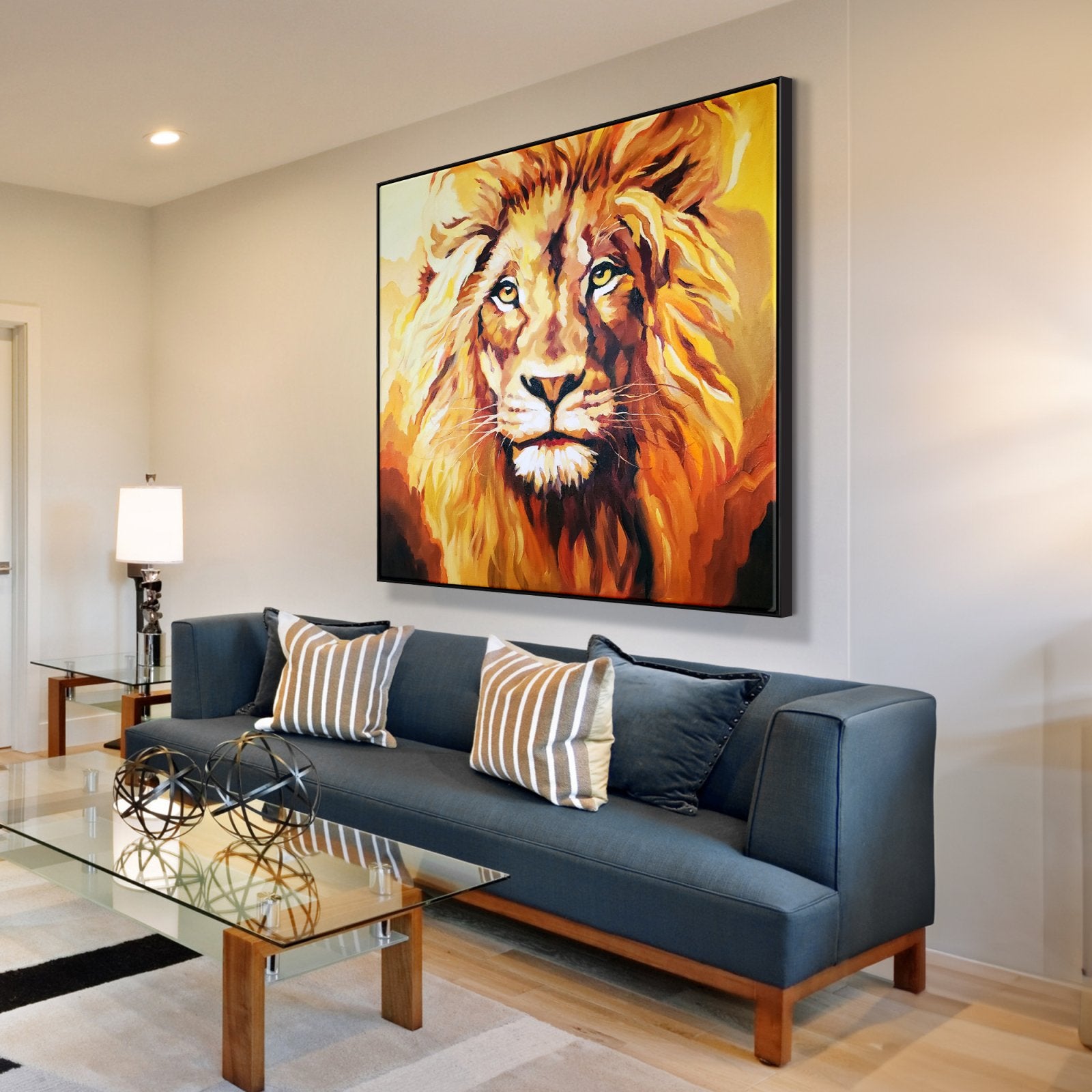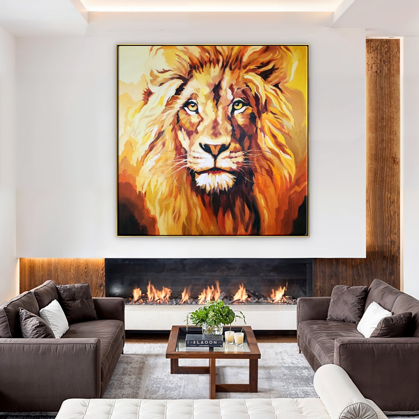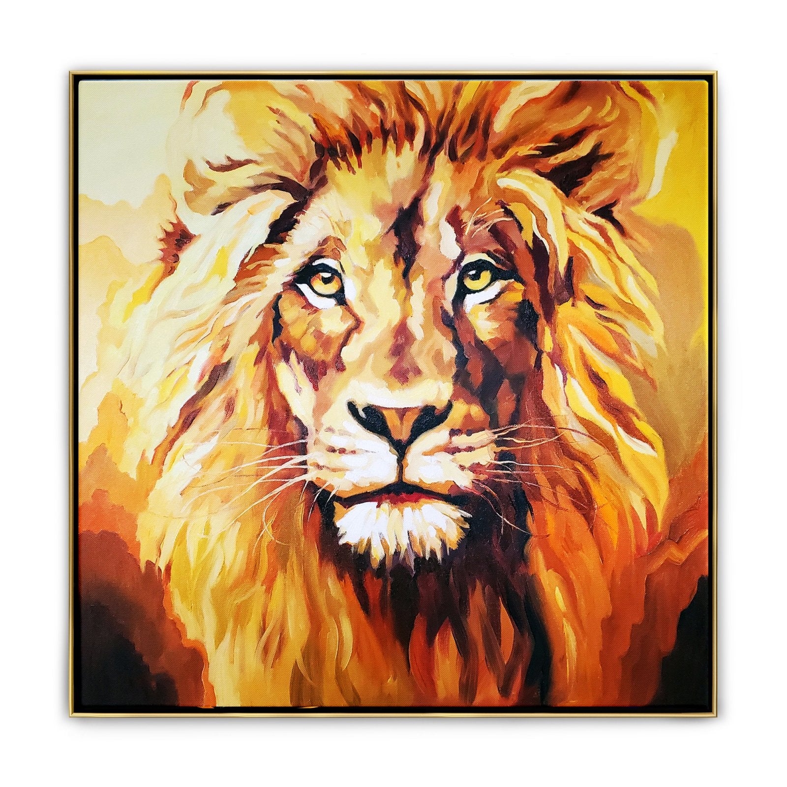 El león, rey de la selva, es un animal maravilloso y poderoso. Esta pintura de estilo realista representa a esta imponente bestia con colores cálidos y vibrantes y una composición impactante. Los detalles y la mirada intrigante del león hacen de esta pieza una pieza inolvidable.