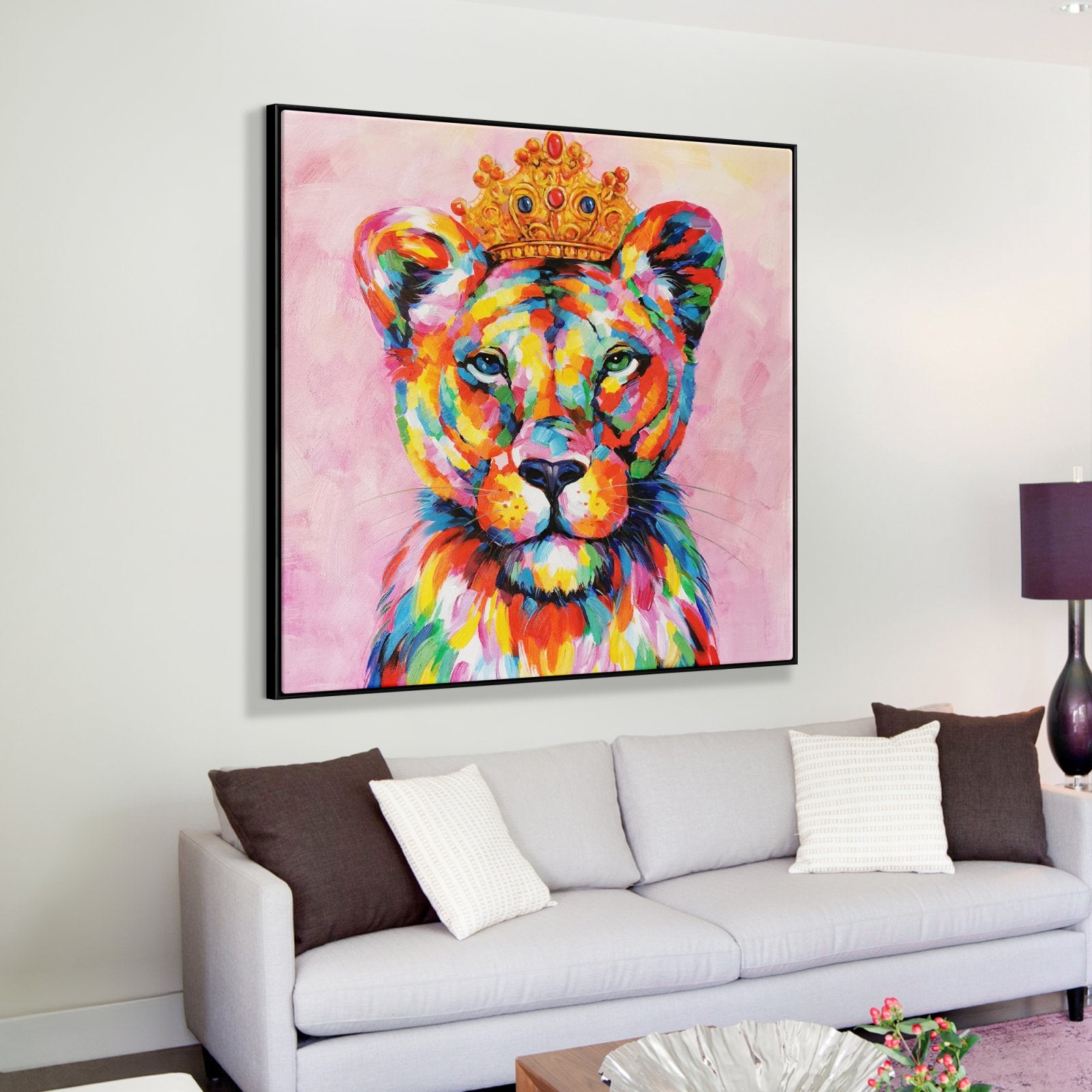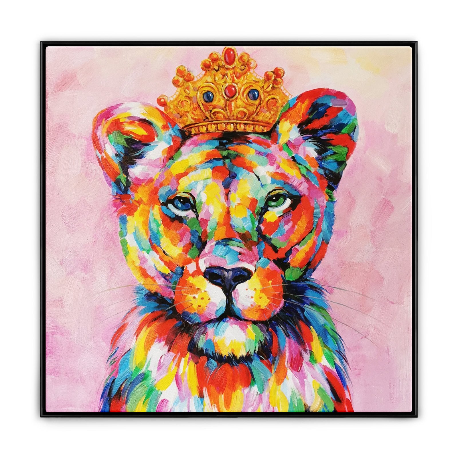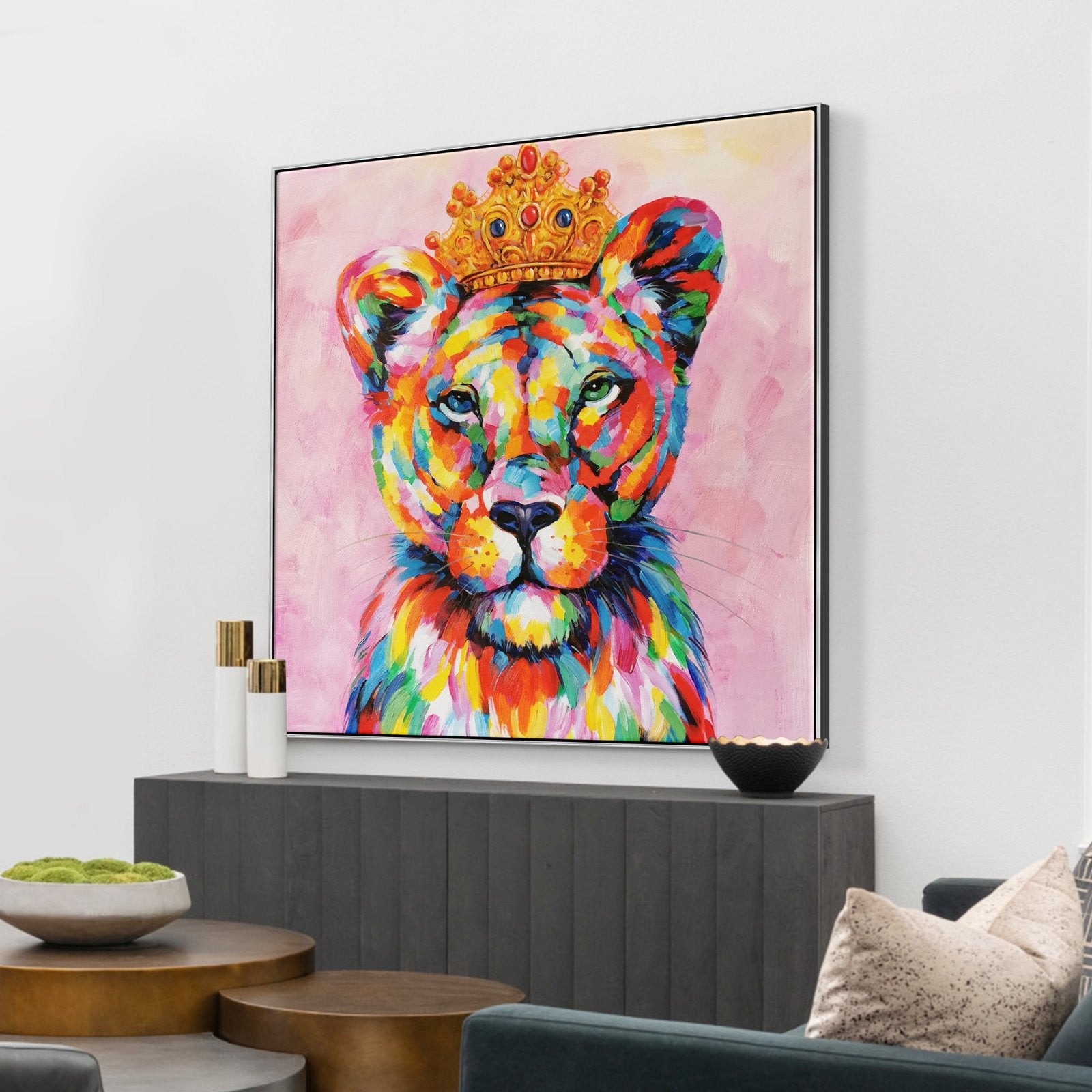 Conoce a la adorable princesa leona en este conmovedor retrato. Con una preciosa corona sobre un fondo rosa, su inocente mirada te cautivará al instante. ¡Ideal para una habitación infantil o para crear un ambiente alegre en cualquier lugar!
