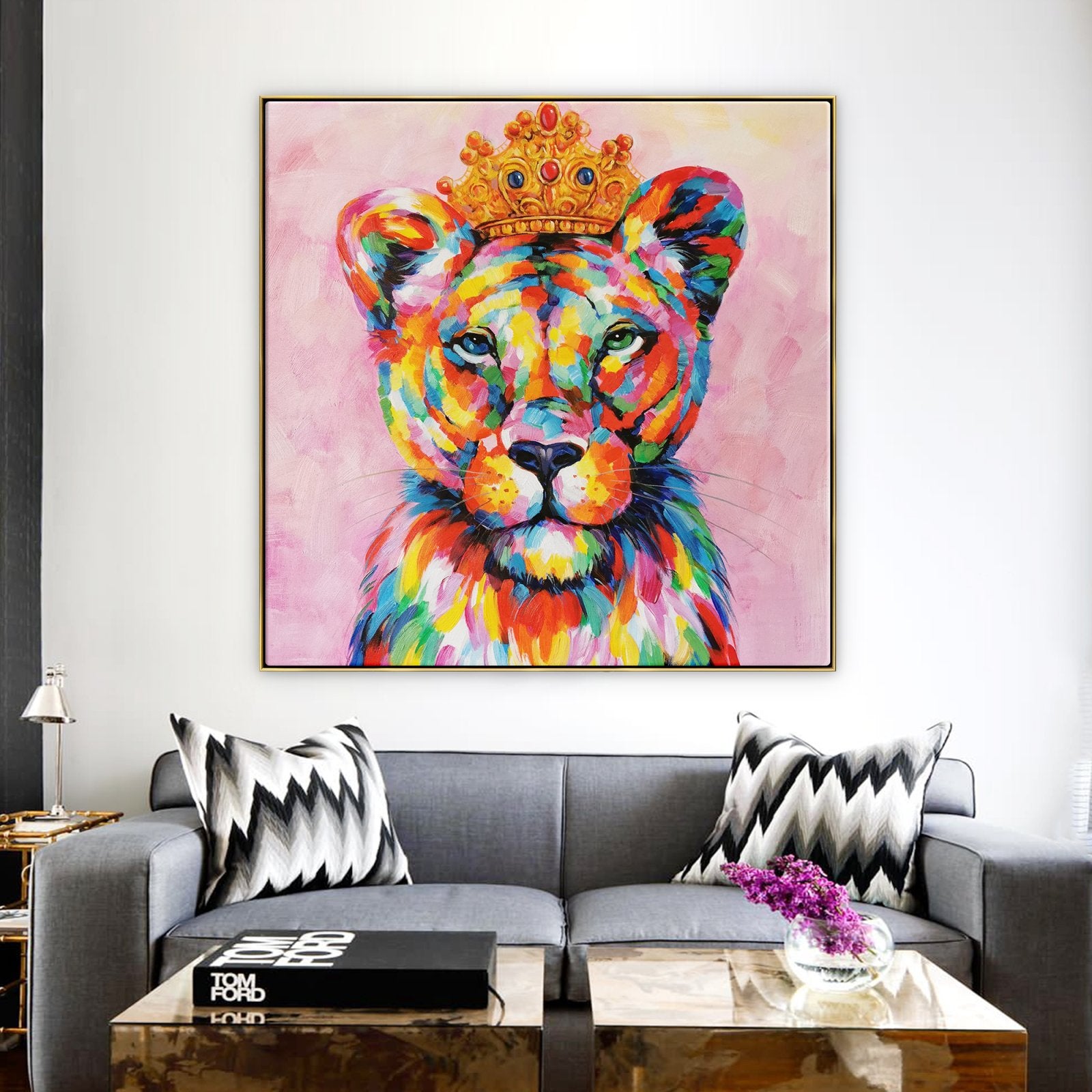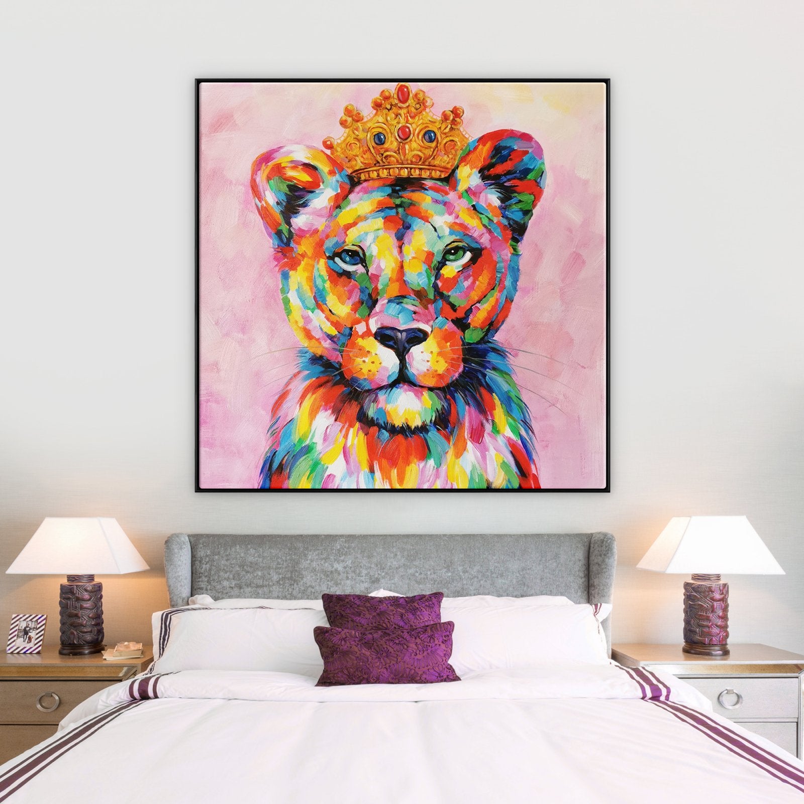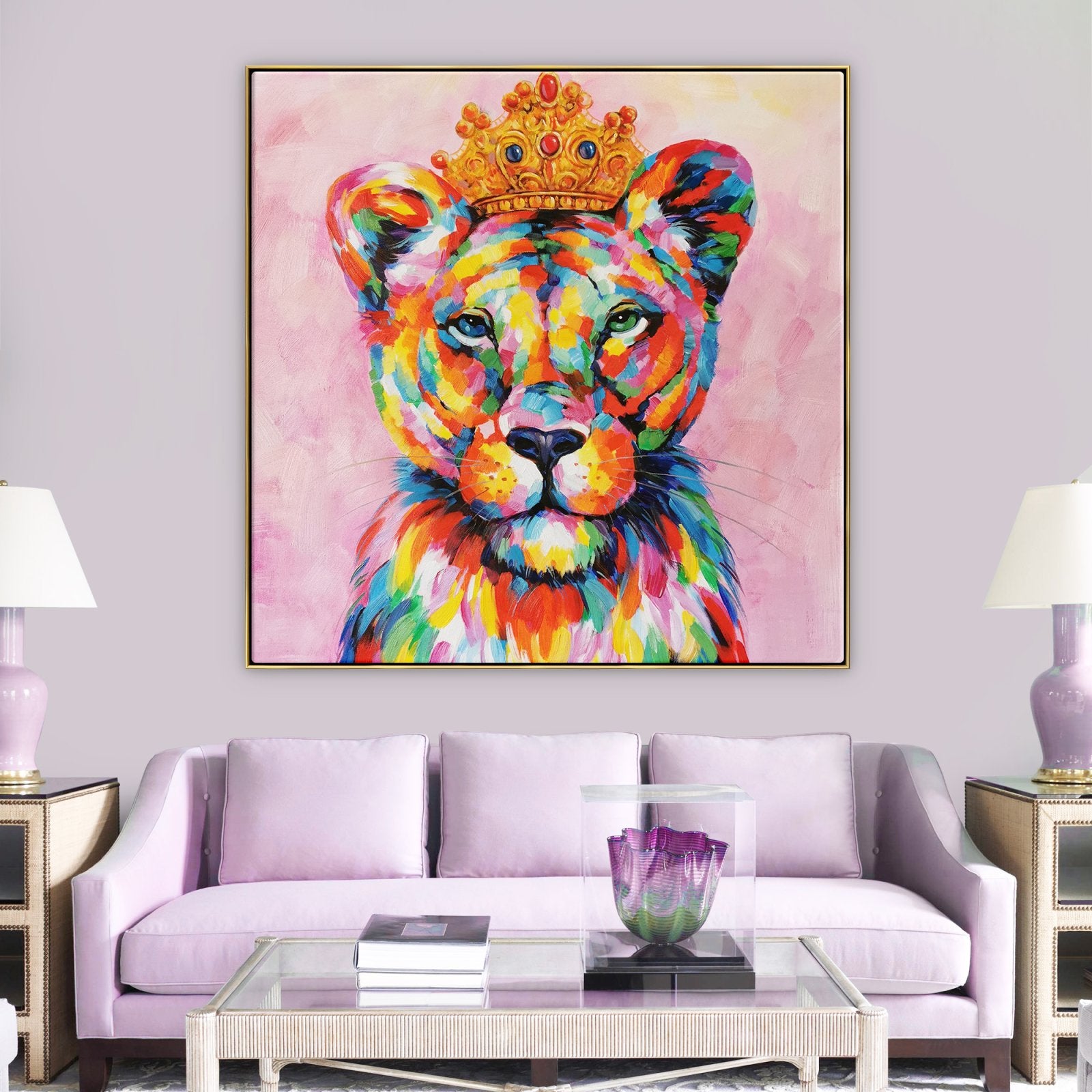 Conoce a la adorable princesa leona en este conmovedor retrato. Con una preciosa corona sobre un fondo rosa, su inocente mirada te cautivará al instante. ¡Ideal para una habitación infantil o para crear un ambiente alegre en cualquier lugar!