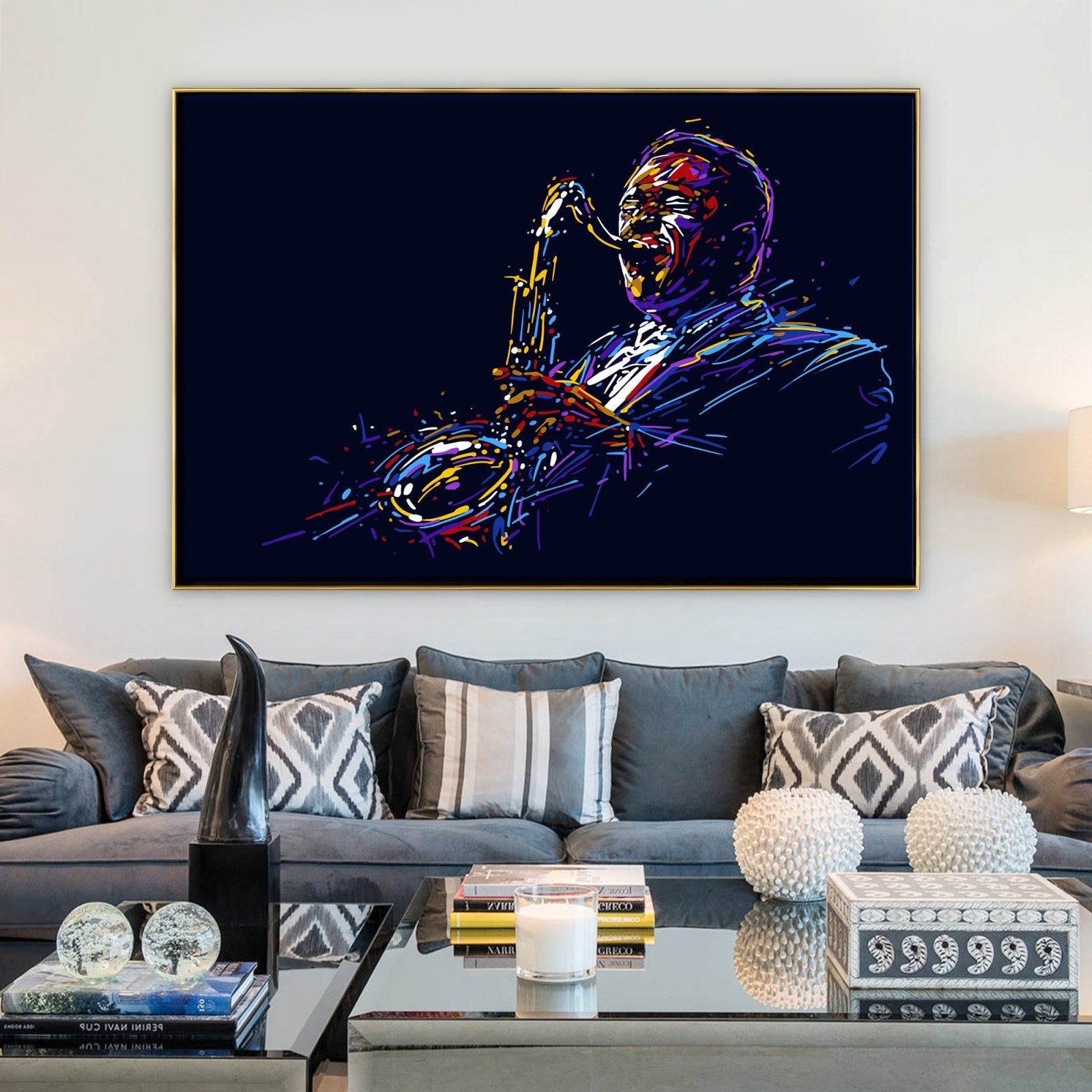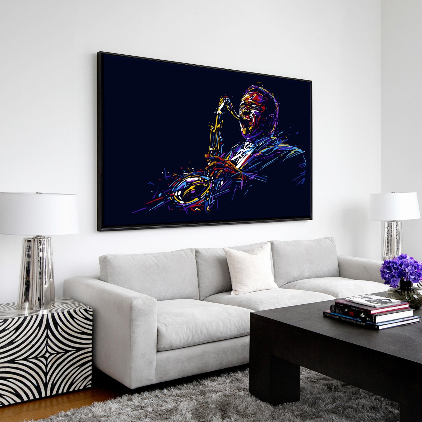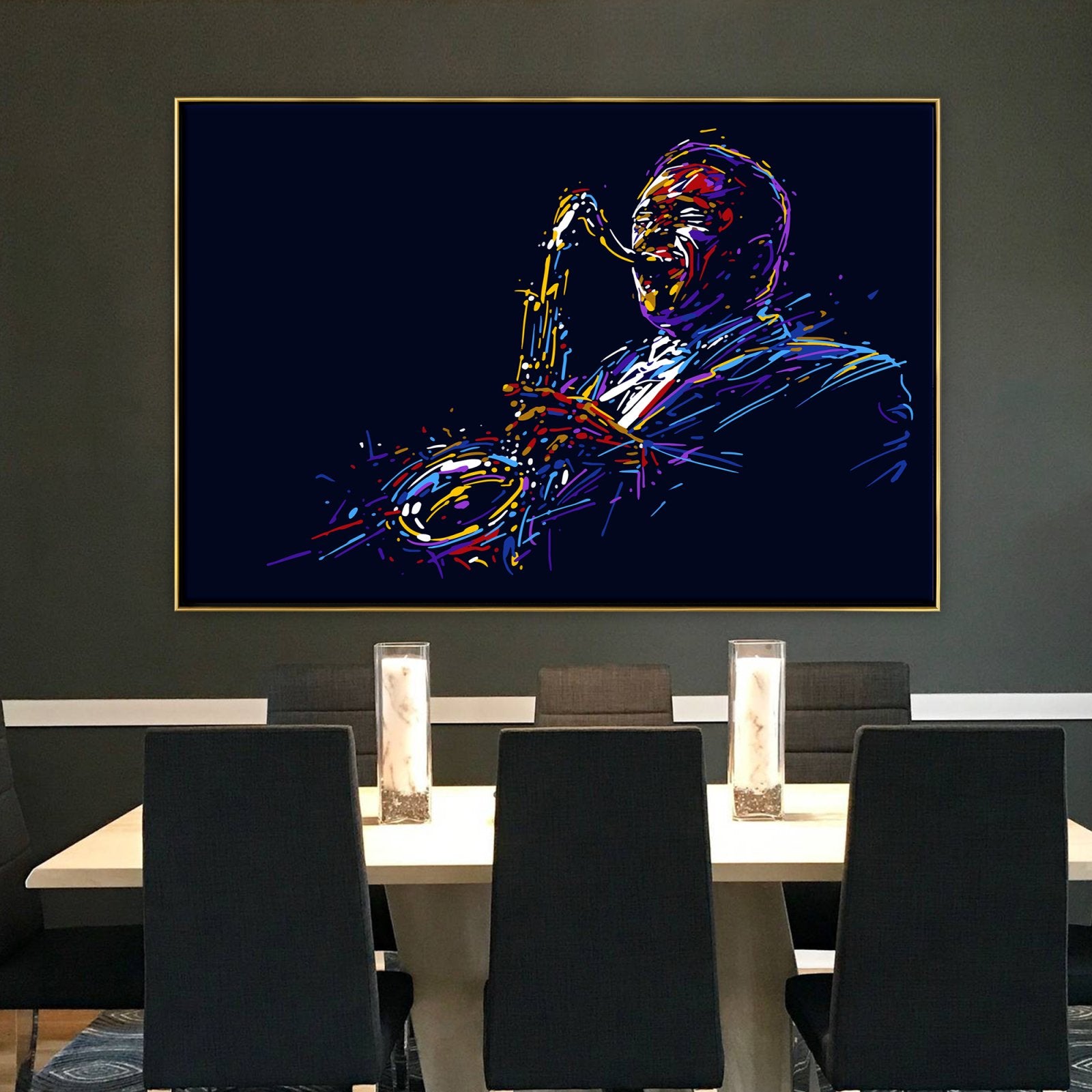 Siente el alma del jazz en esta impresionante obra de arte. Los golpes vívidos y la composición animada dan vida a la música, por lo que es una pieza perfecta para cualquier espacio o habitación.