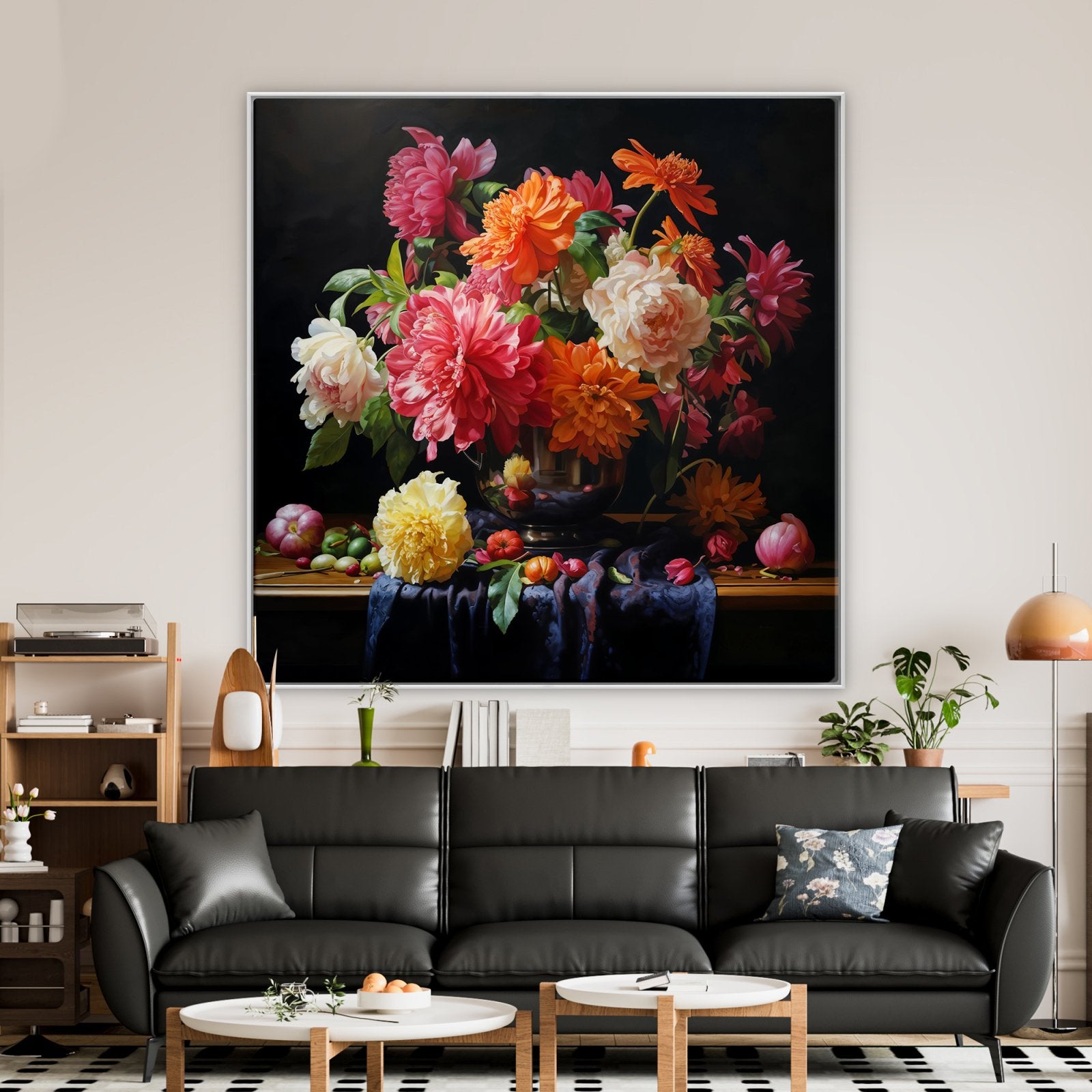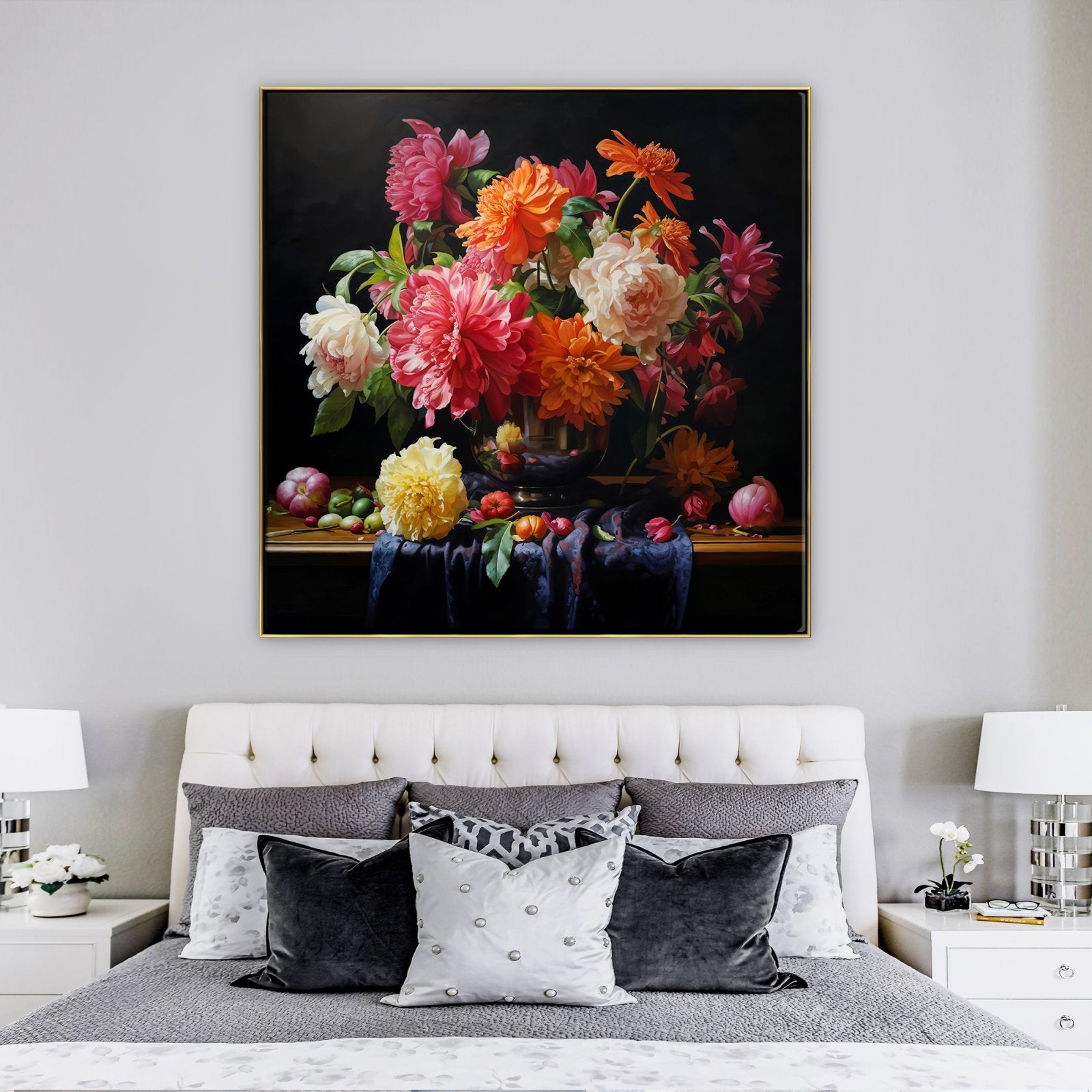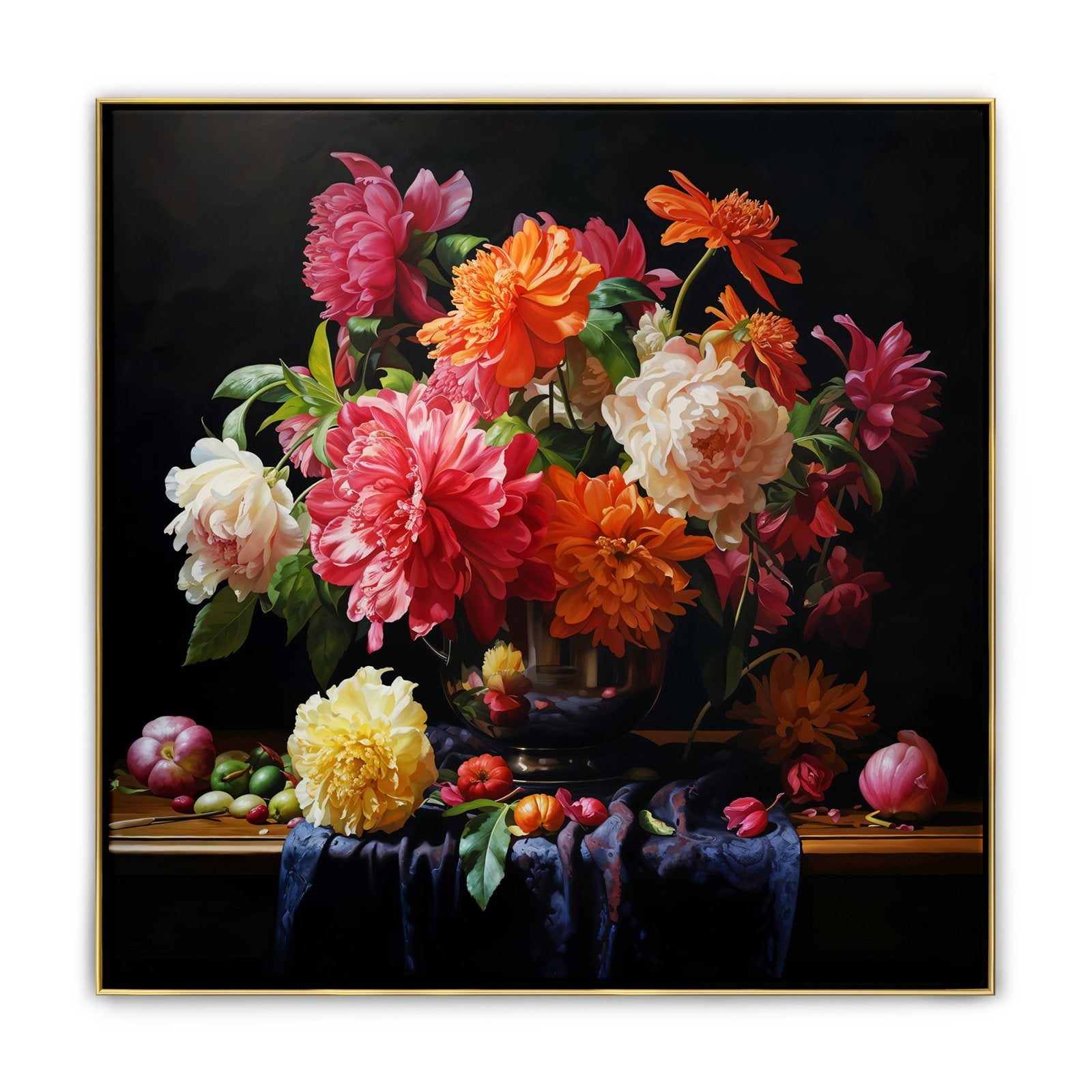 ¡Estas flores nunca se marchitan! Esta hermosa obra de arte muestra flores vívidas en un impresionante estilo realista. Debido al fondo negro, los colores vibrantes resaltan aún más, ¡lo que lo convierte en un atractivo para cualquier espacio!