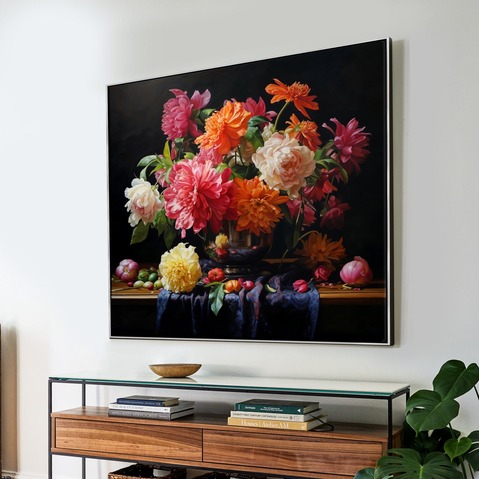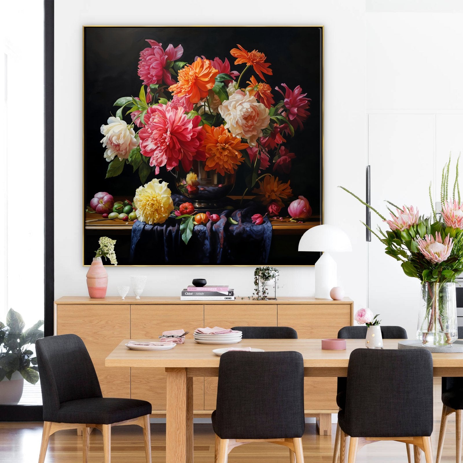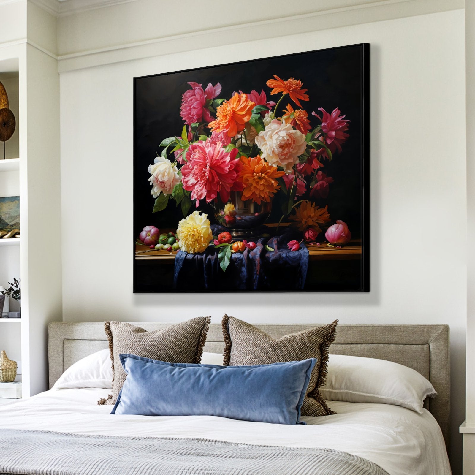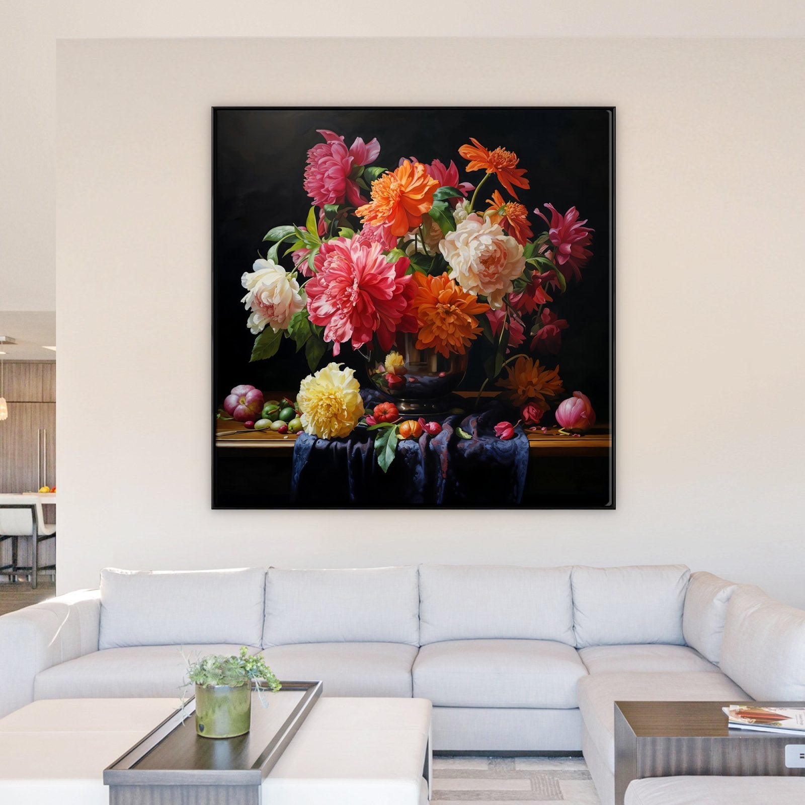 ¡Estas flores nunca se marchitan! Esta hermosa obra de arte muestra flores vívidas en un impresionante estilo realista. Debido al fondo negro, los colores vibrantes resaltan aún más, ¡lo que lo convierte en un atractivo para cualquier espacio!
