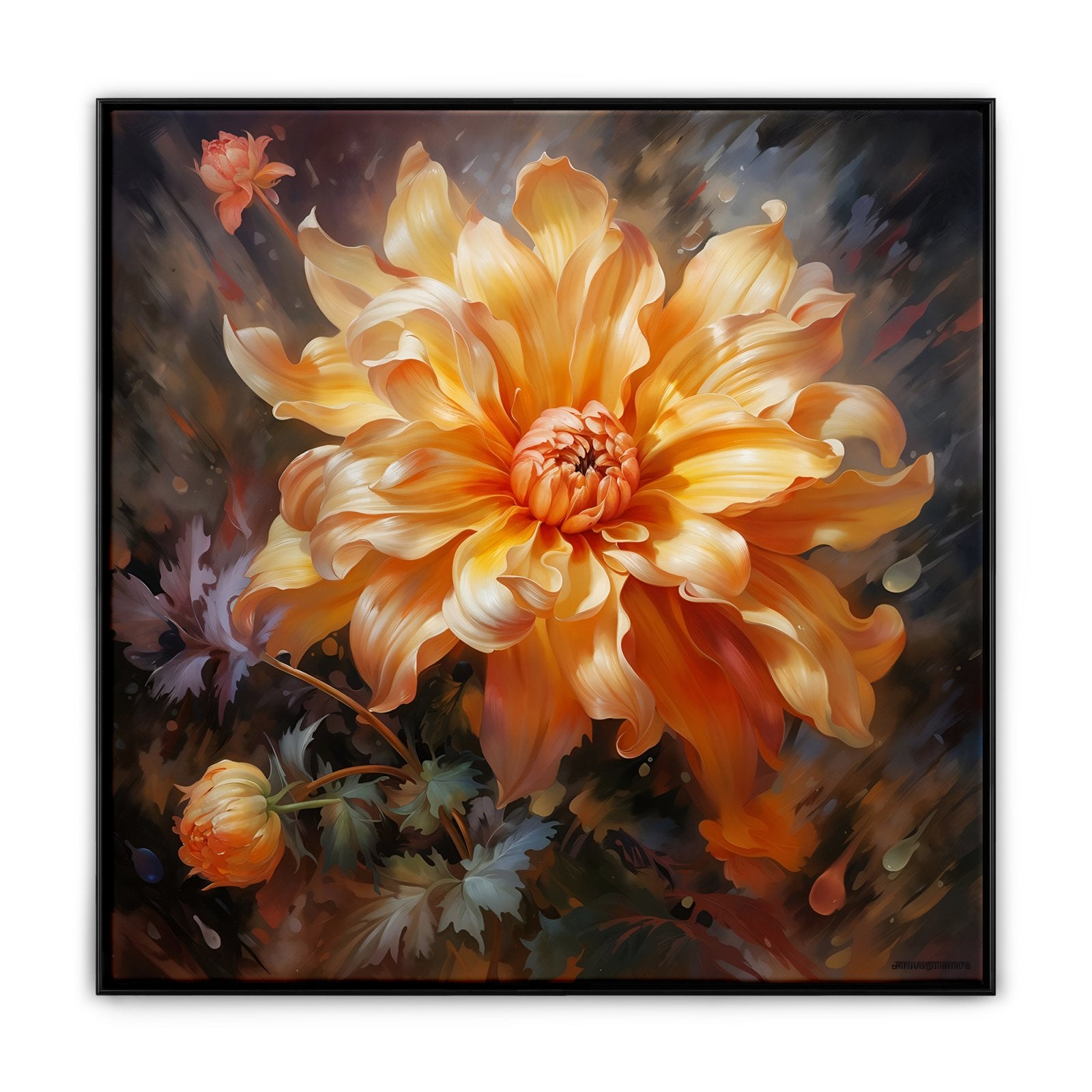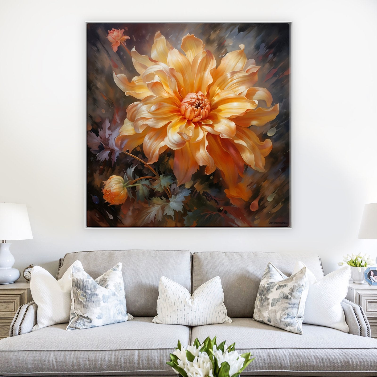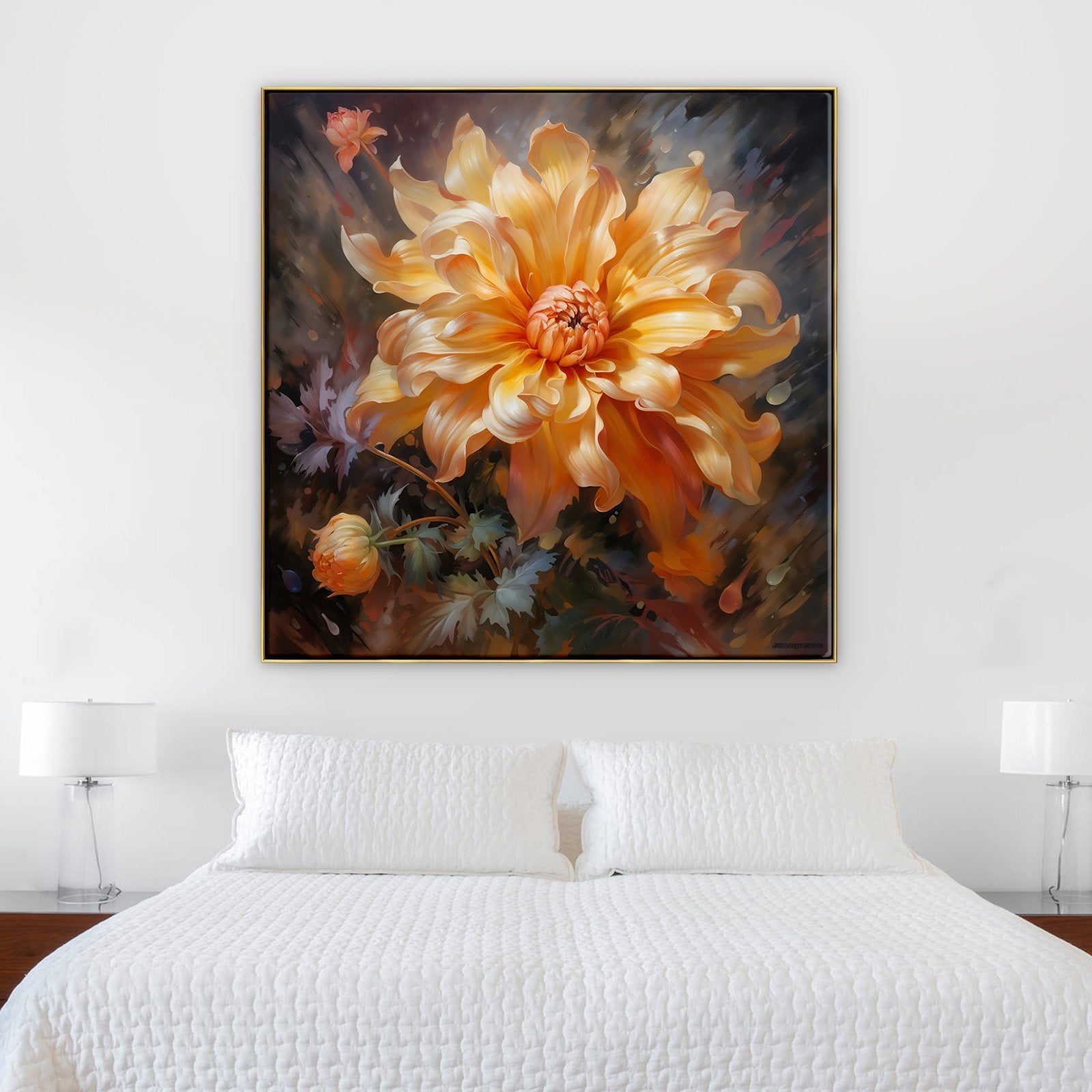 En "Versilla", una radiante flor naranja cobra protagonismo, bañada por el sol. El exquisito realismo y la calidez radiante de esta obra la convierten en un vibrante complemento para cualquier espacio o habitación.