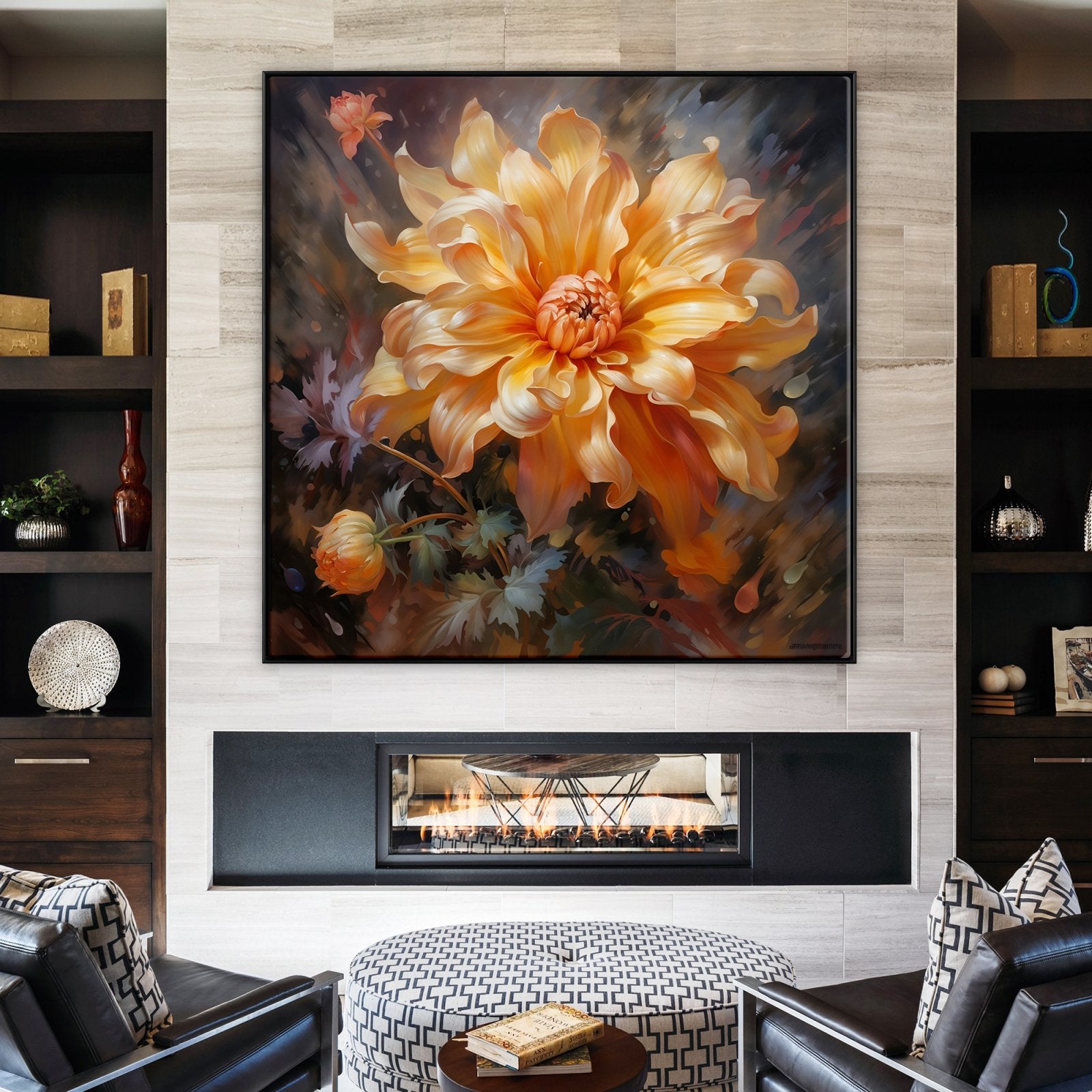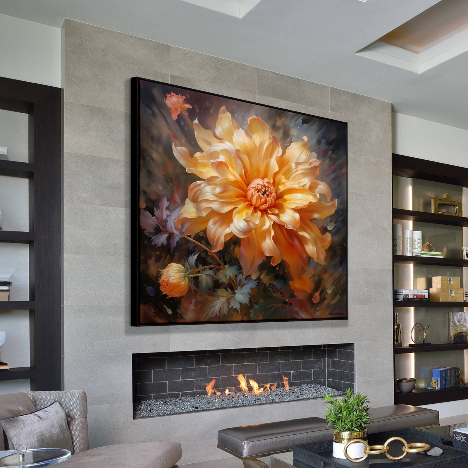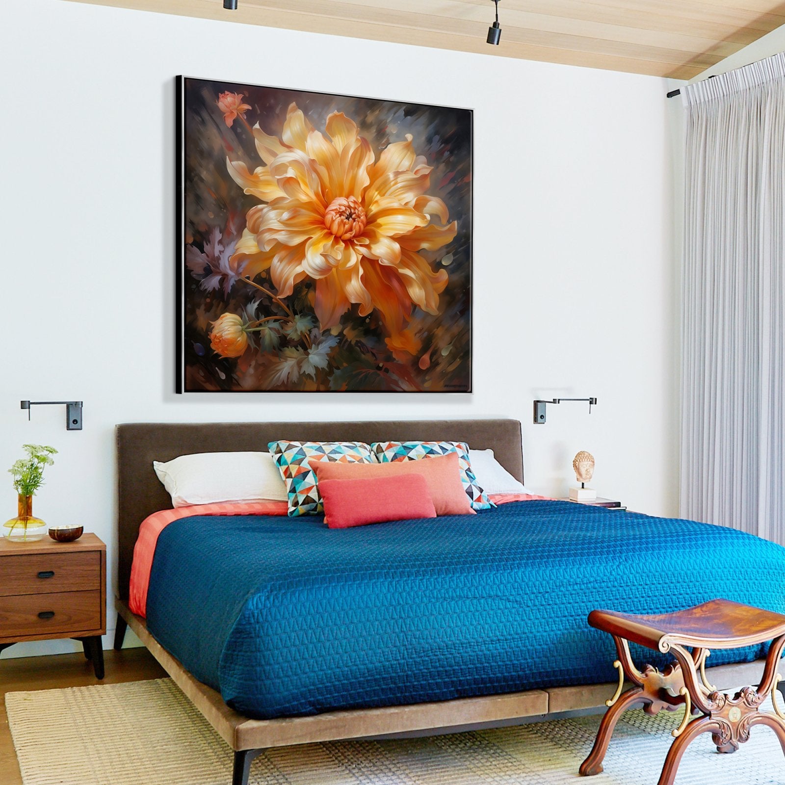 En "Versilla", una radiante flor naranja cobra protagonismo, bañada por el sol. El exquisito realismo y la calidez radiante de esta obra la convierten en un vibrante complemento para cualquier espacio o habitación.