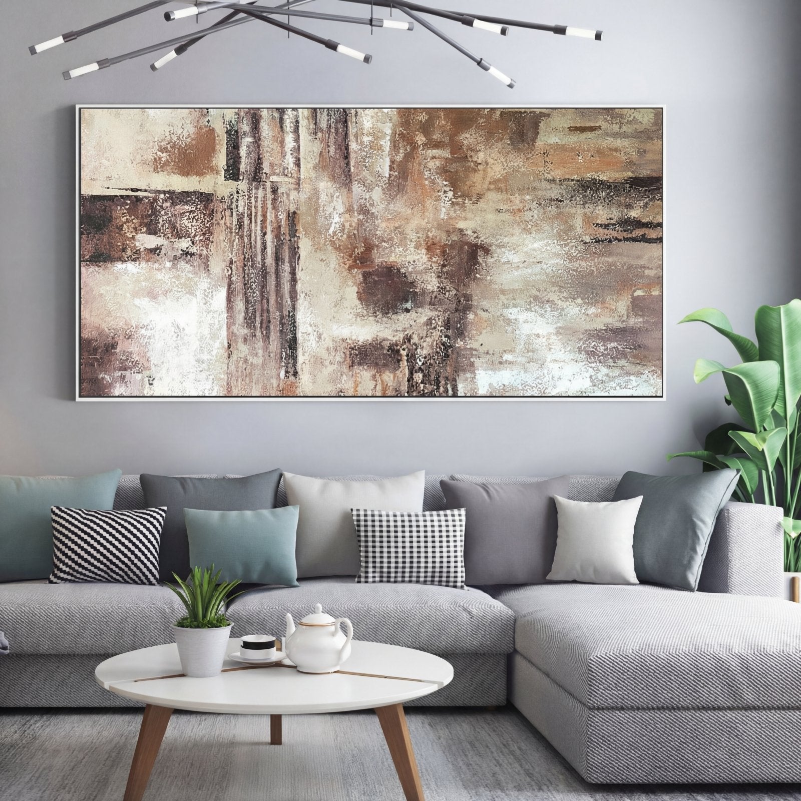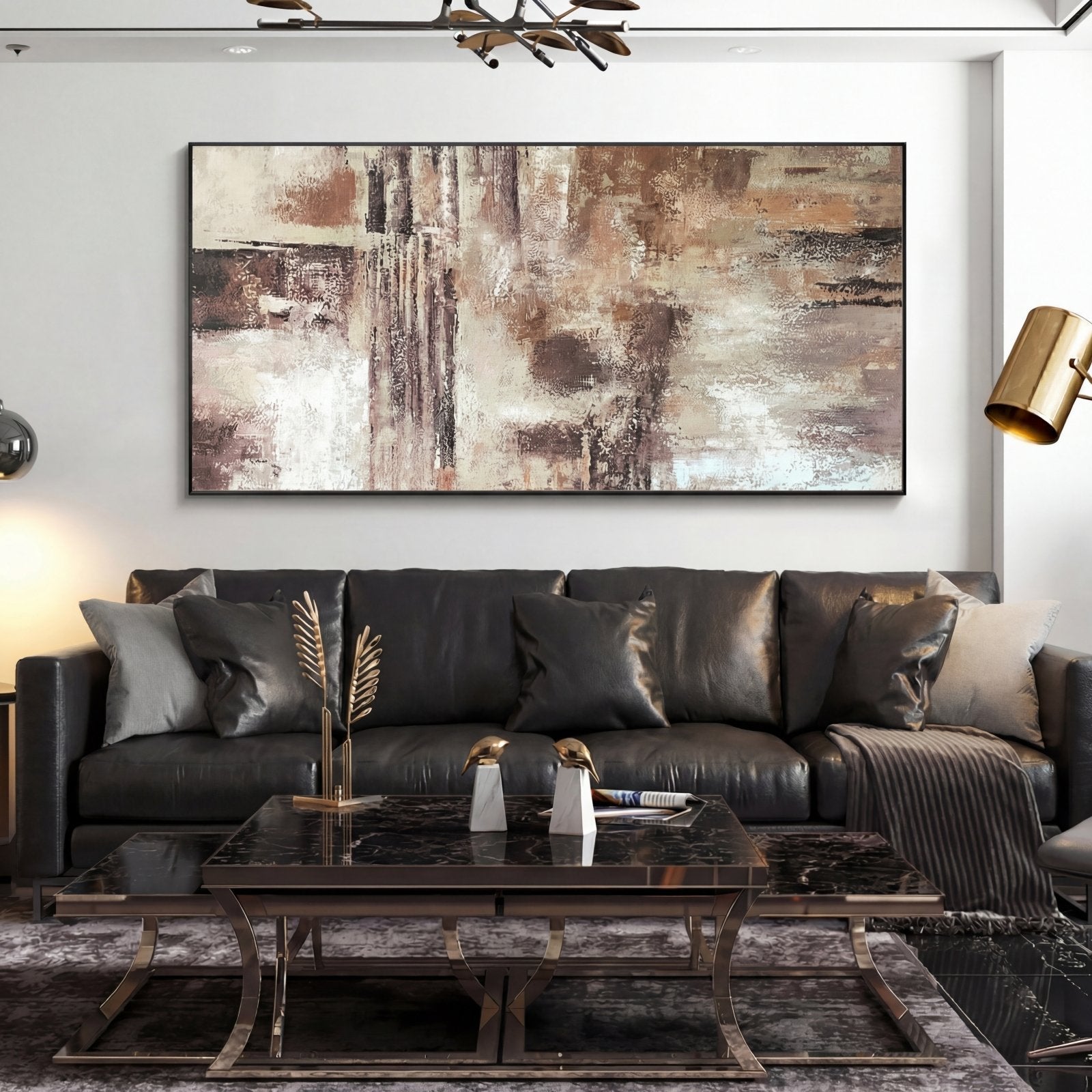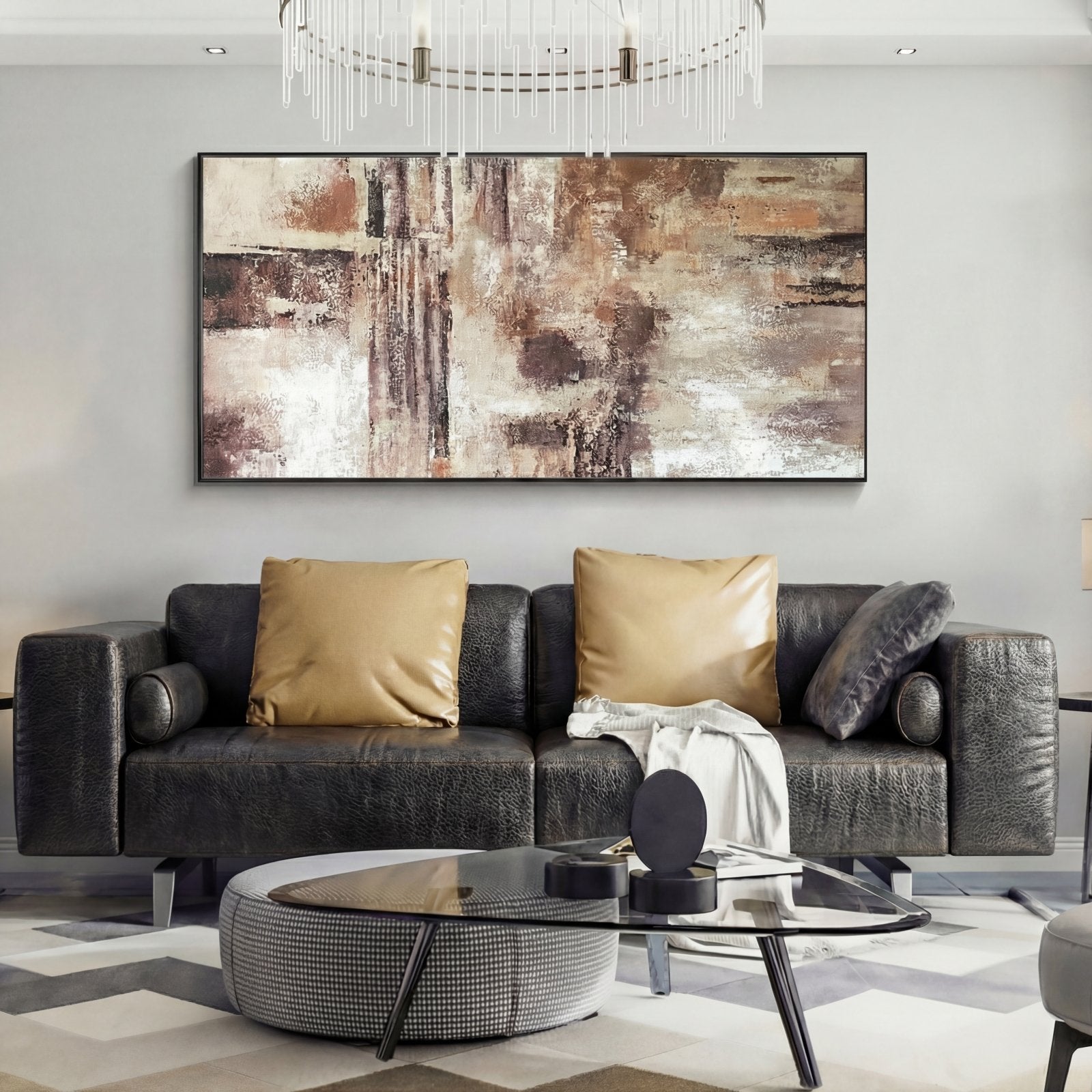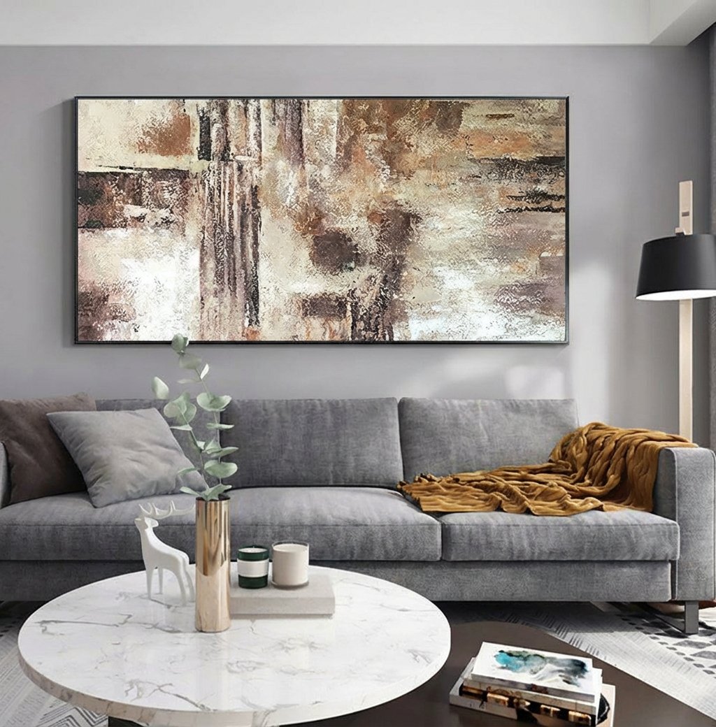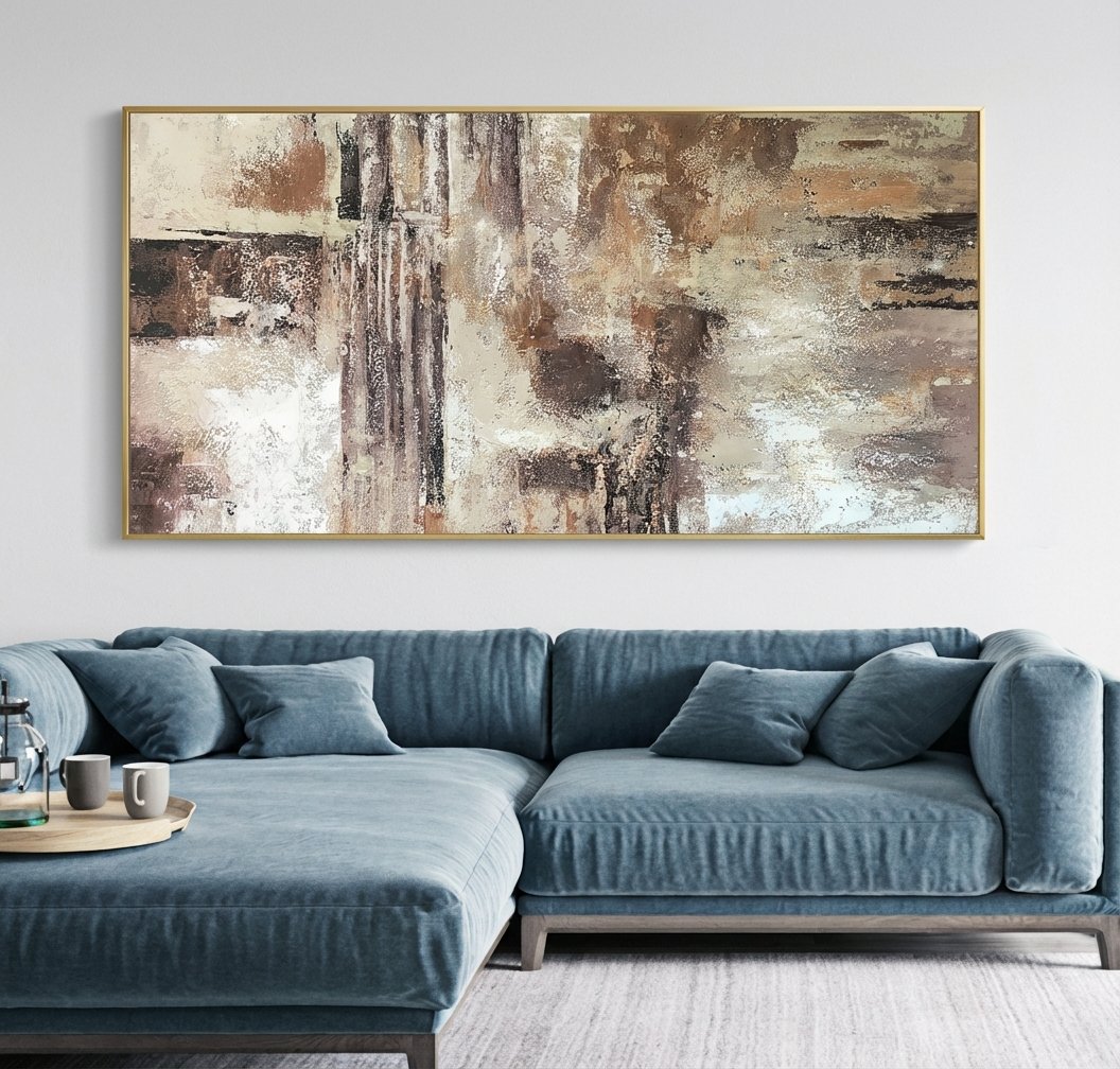 With the clever usage of various shades of brown and beige, a realistic desert-like atmosphere is created. This soft, yet robust colour scheme makes this handmade art piece complement any room!