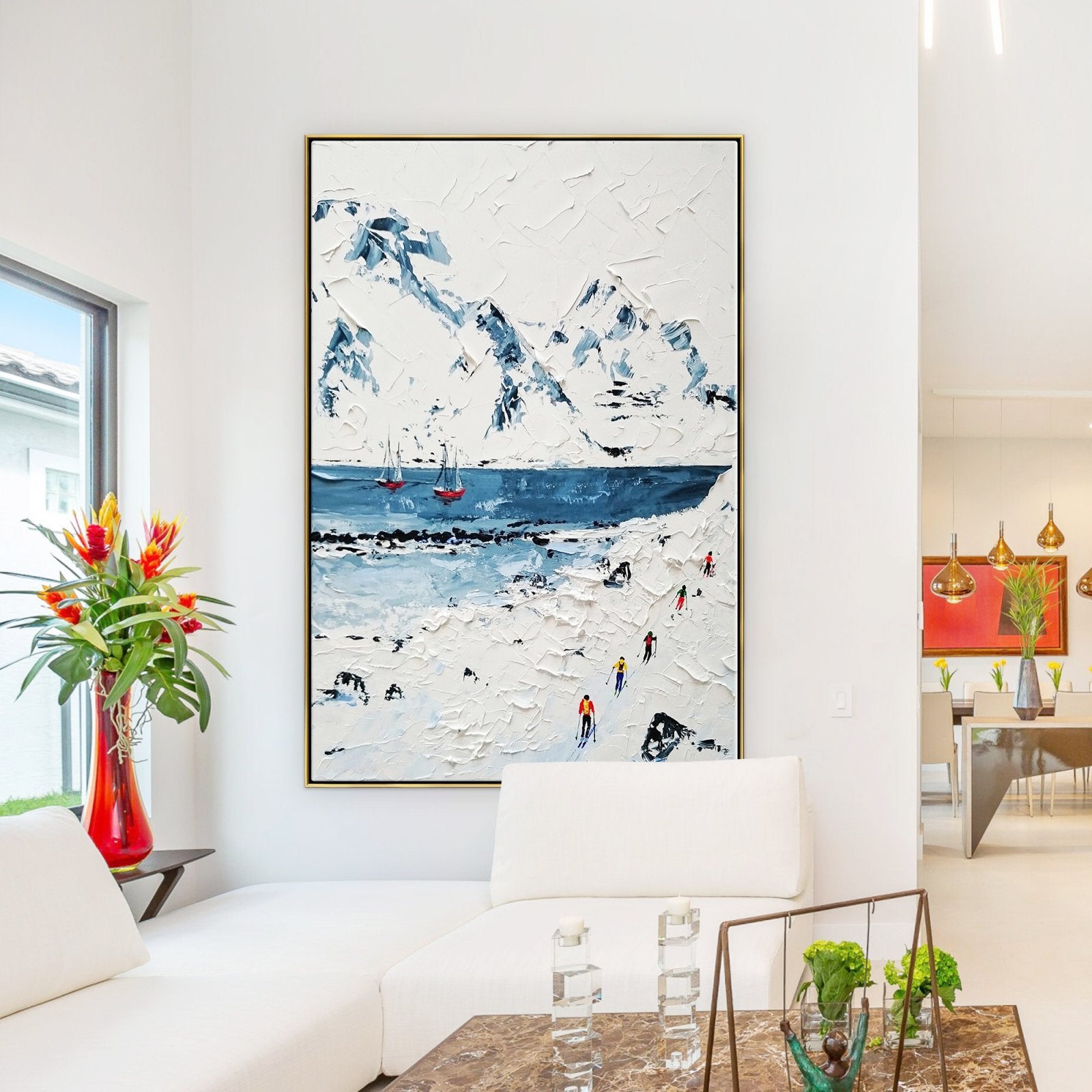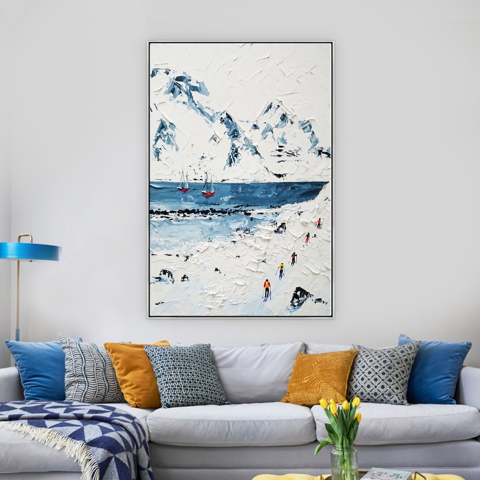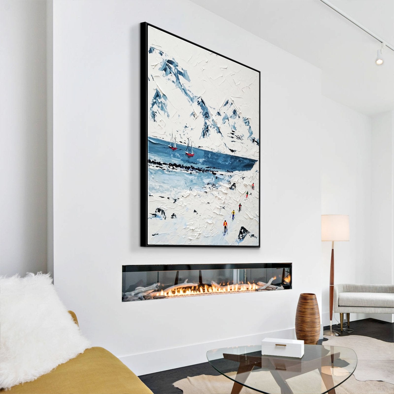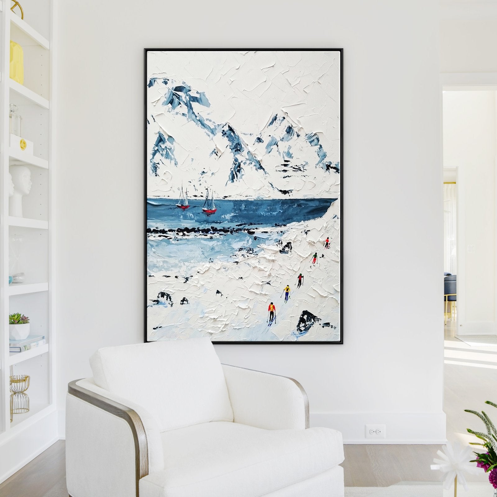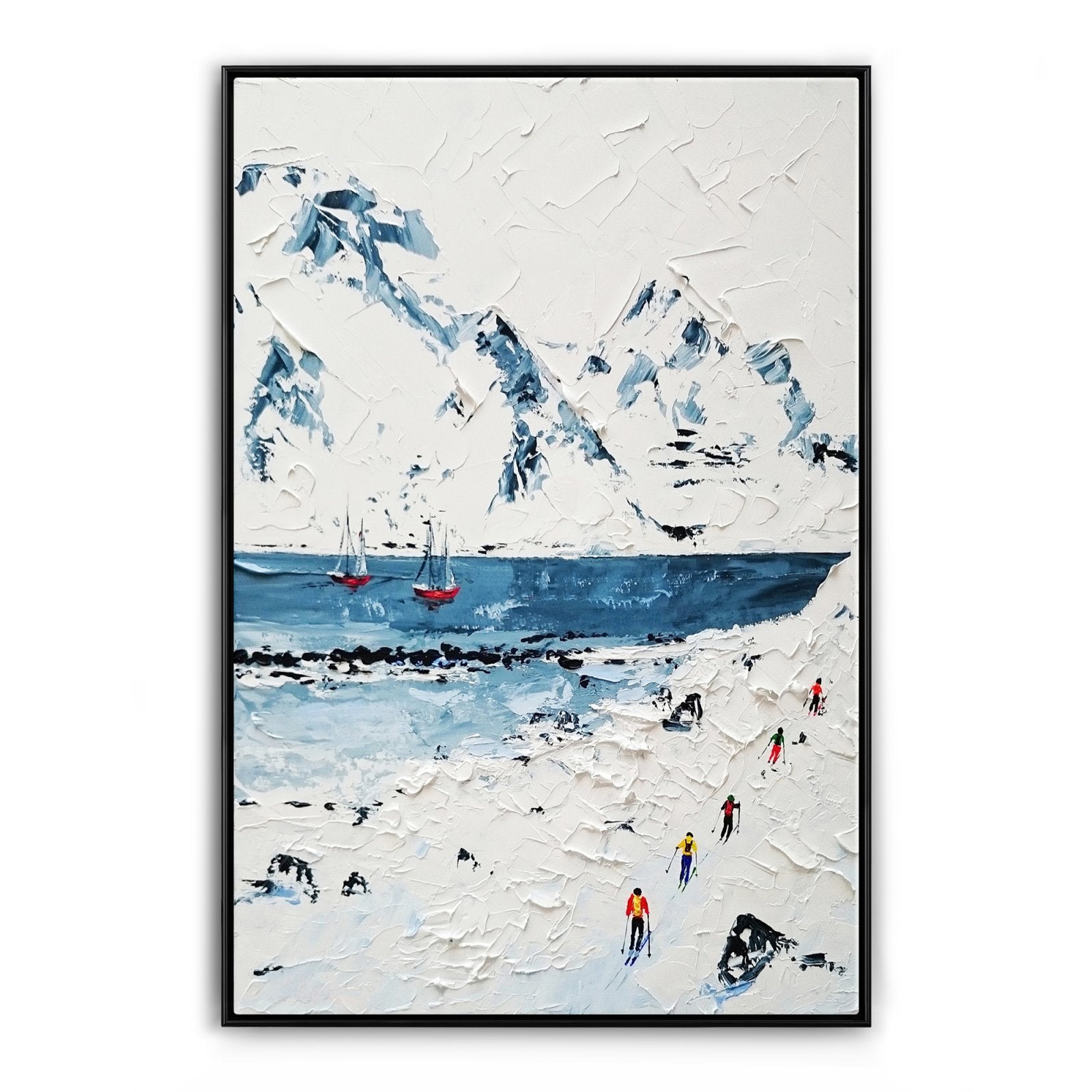 Sumérgete en la tranquilidad con esta increíble escena invernal. Un barco se desliza sobre aguas heladas entre montañas cubiertas de nieve donde los esquiadores dejan su huella. Explora la encantadora belleza de la poesía invernal de la naturaleza en esta obra de arte casualmente cautivadora.