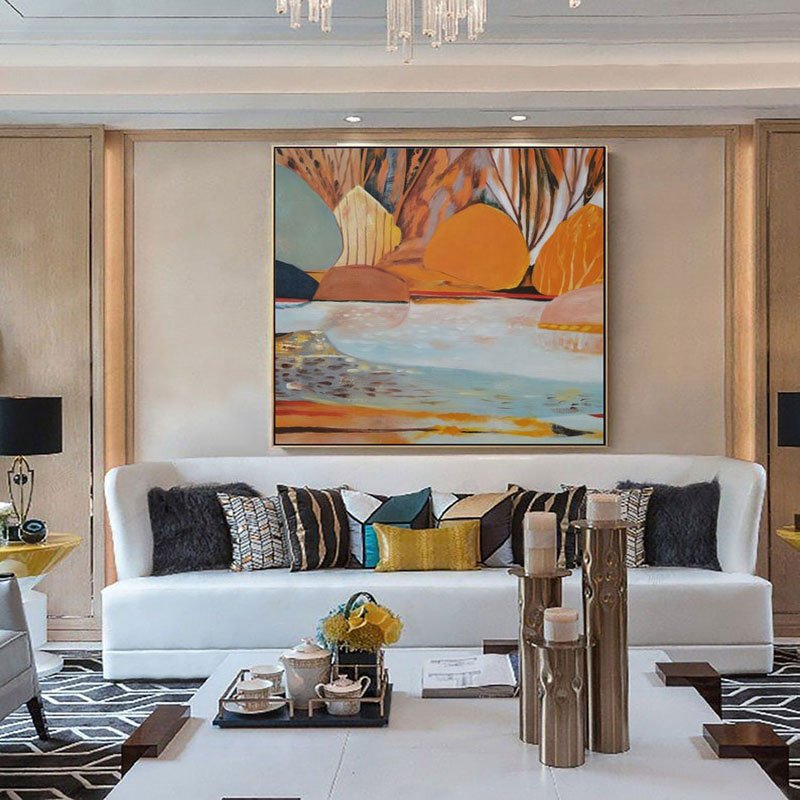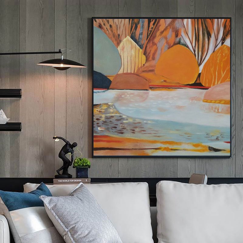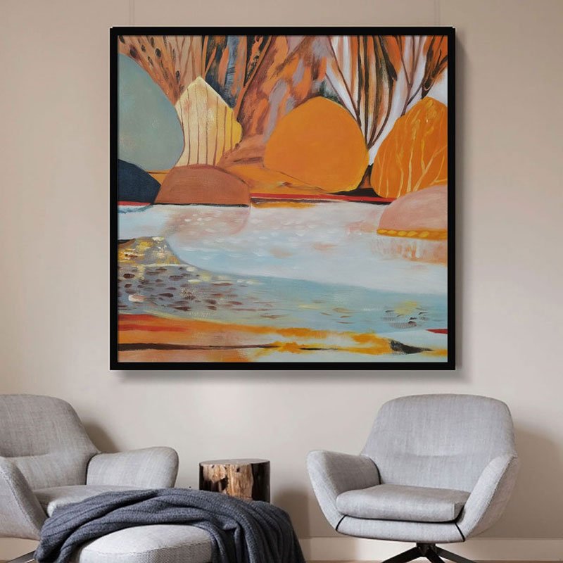 Bayou feels like a quiet place where water moves slowly and time almost stops. Warm earth tones mix with soft blue colors and calm reflections. The shapes feel natural and relaxed, letting this painting bring a peaceful, grounded feeling into your home!
