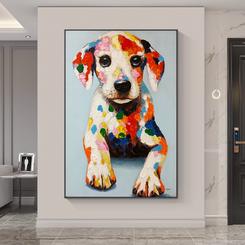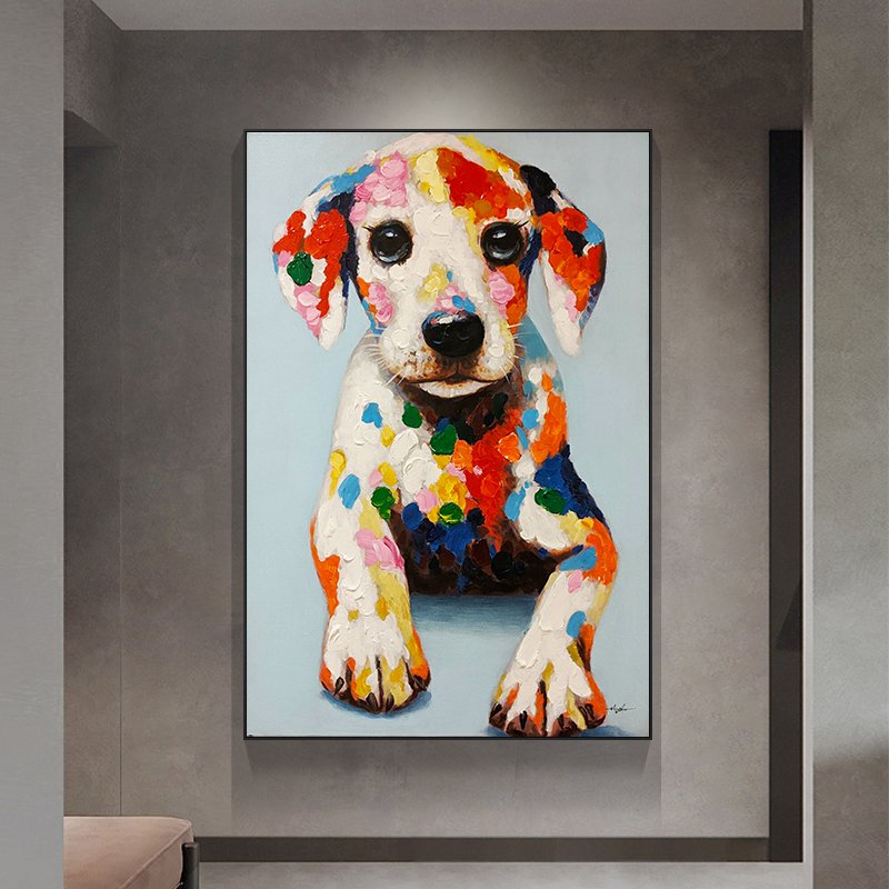 We'd like you to meet the newest member of our art family, Bobby! This cheerful pup sits proudly with bright colors dancing across his fur. The thick paint and vibrant colors gives him texture and life. Bobby is very friendly and loyal, bringing joy, warmth, and a smile into any room!