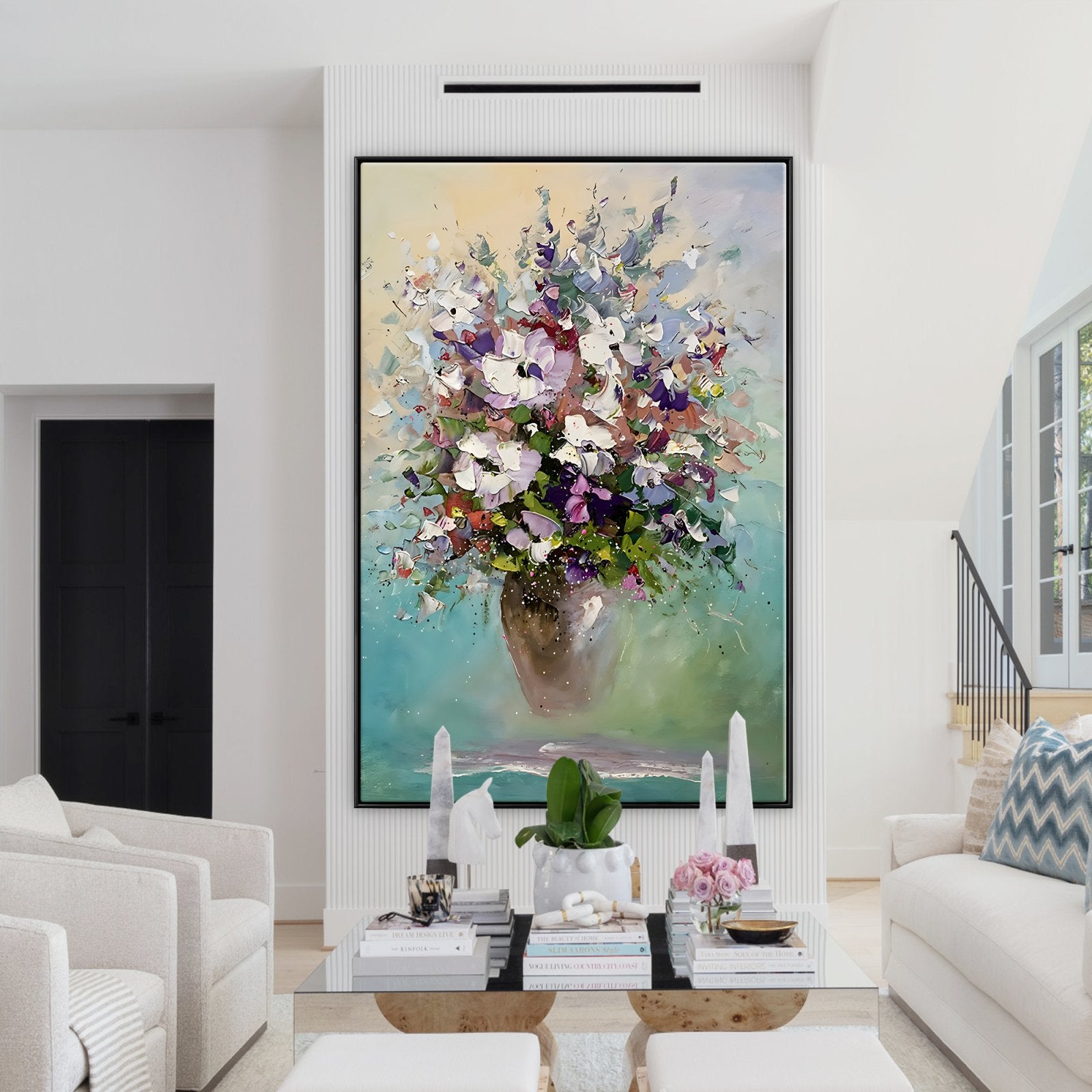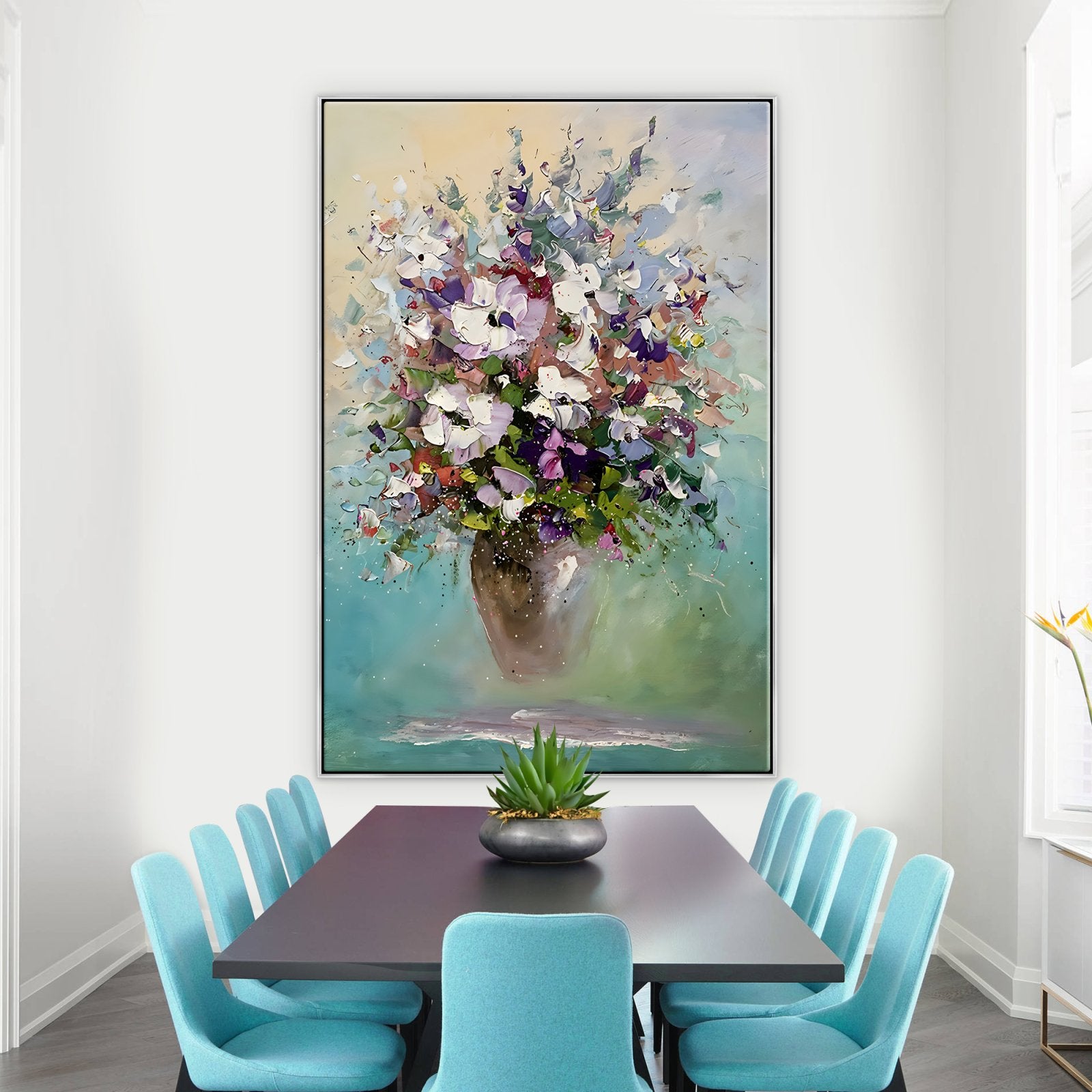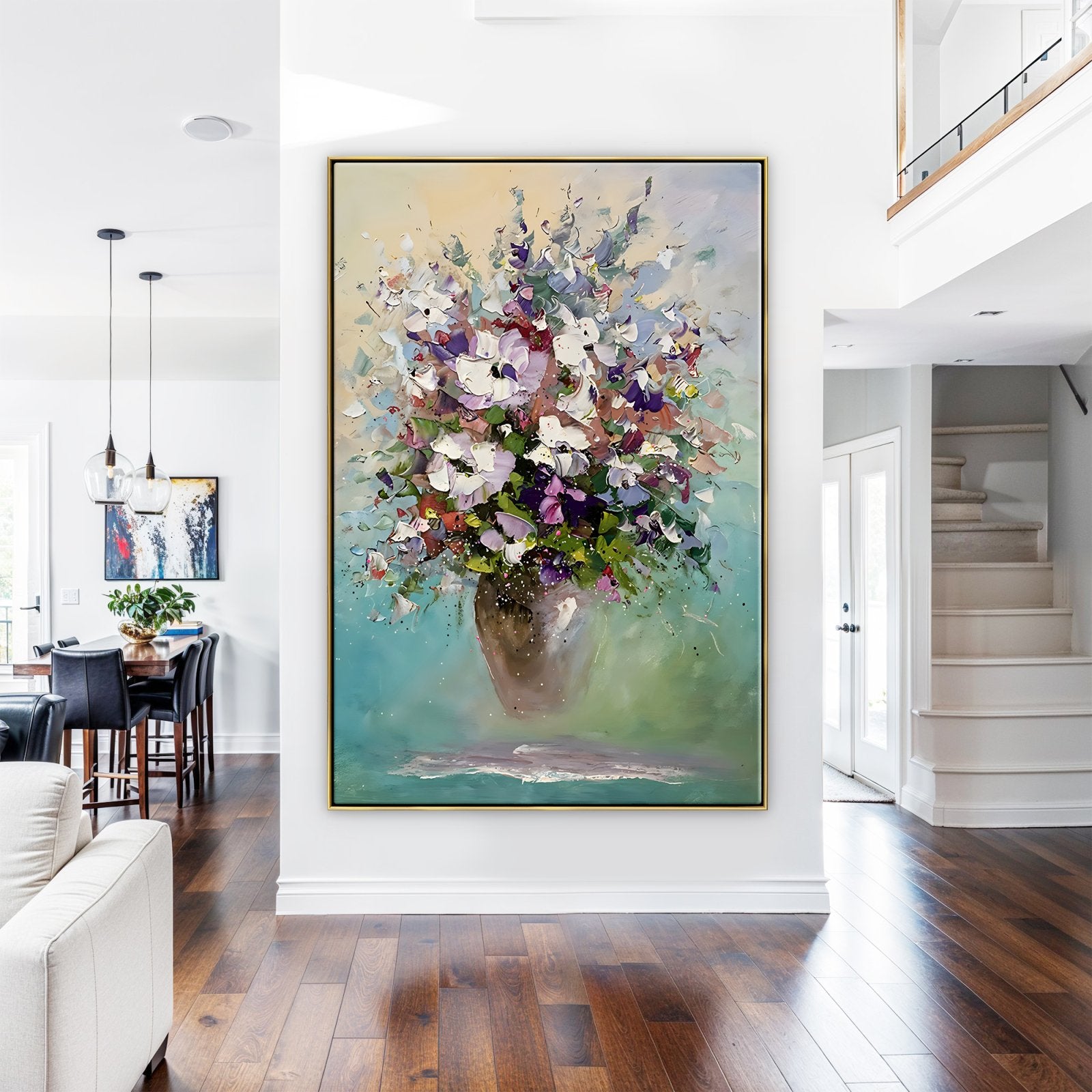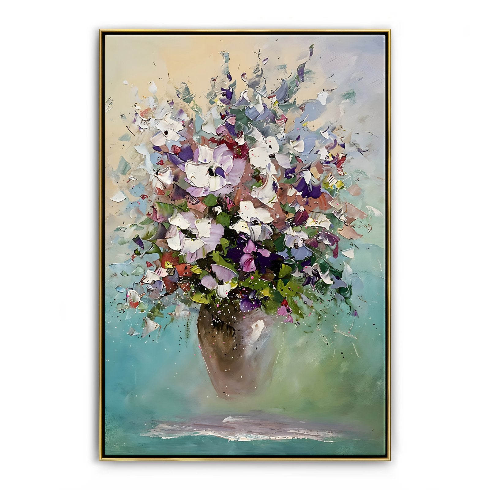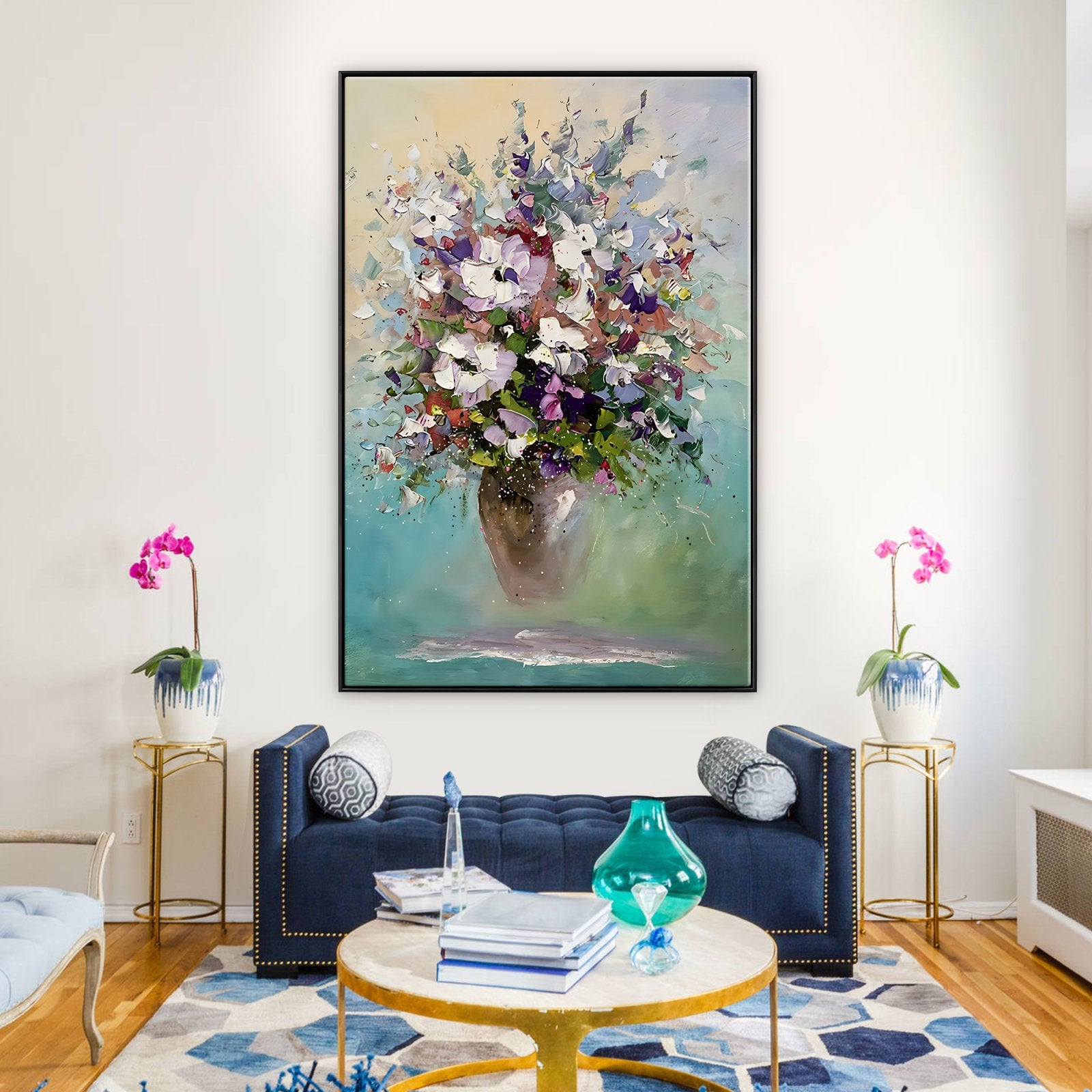 Add a touch of nature's elegance to your home with this beautiful floral painting. The rich color palette and delicate blossoms make it a perfect addition to brighten up any home interior.