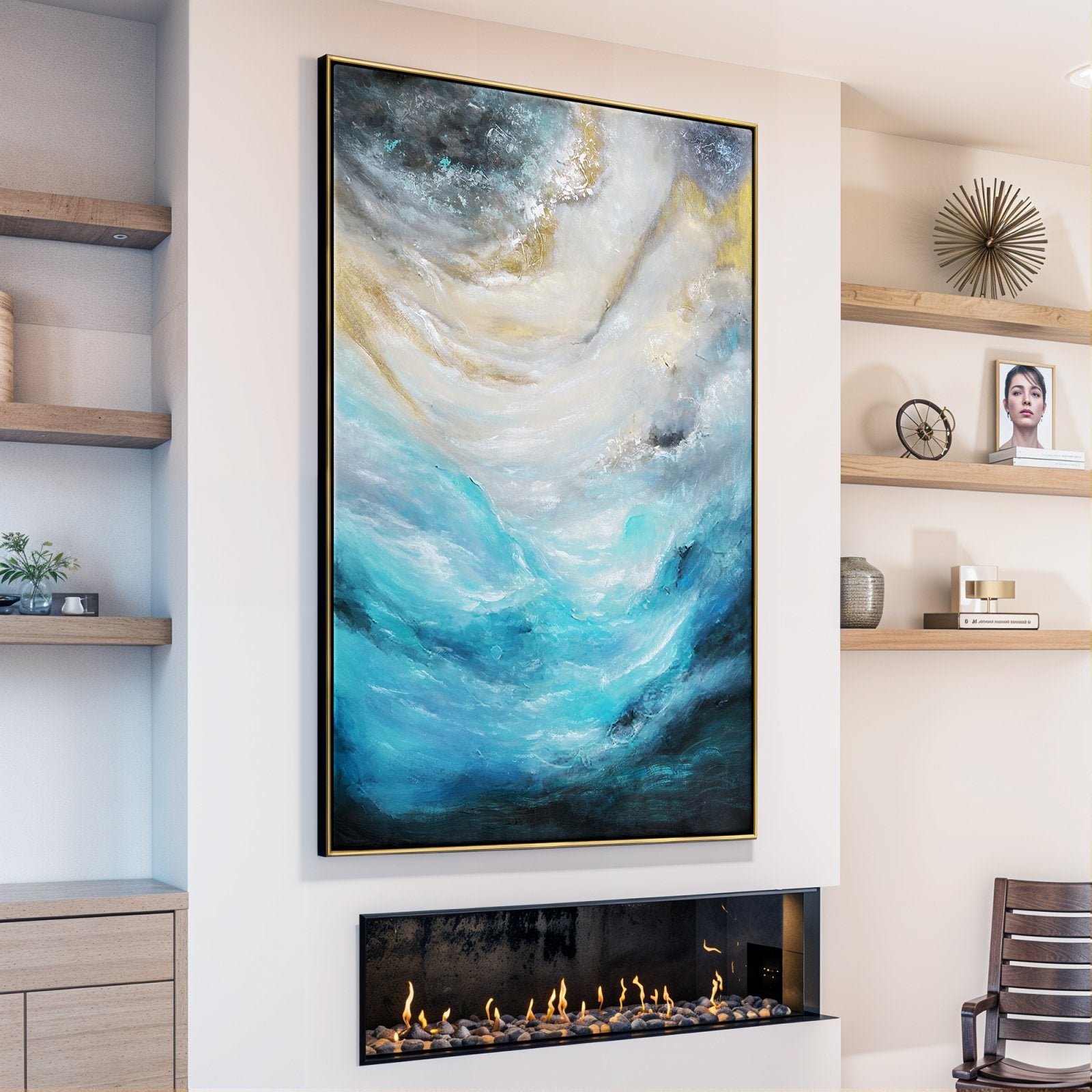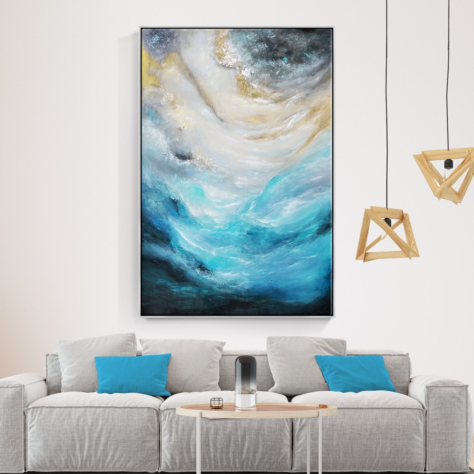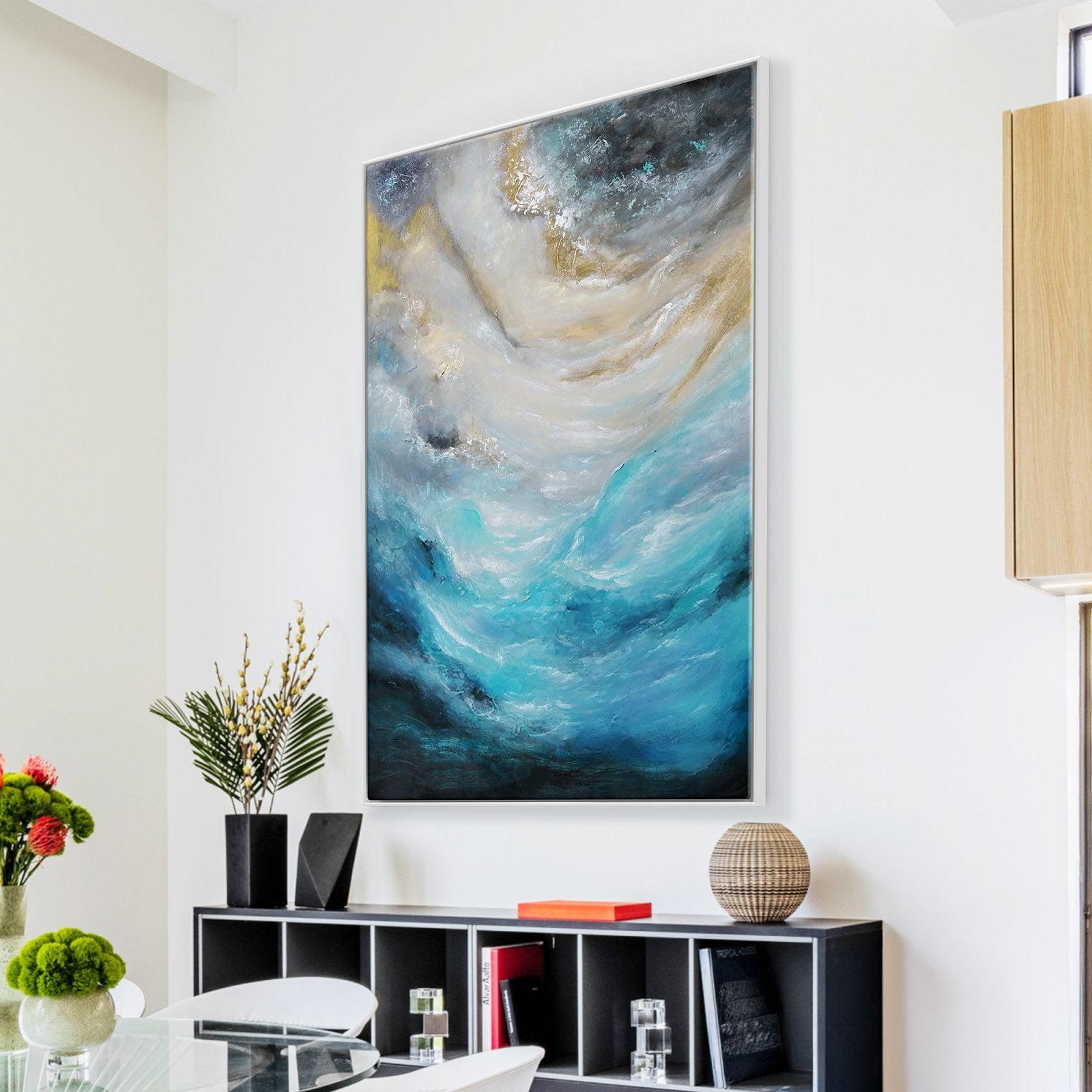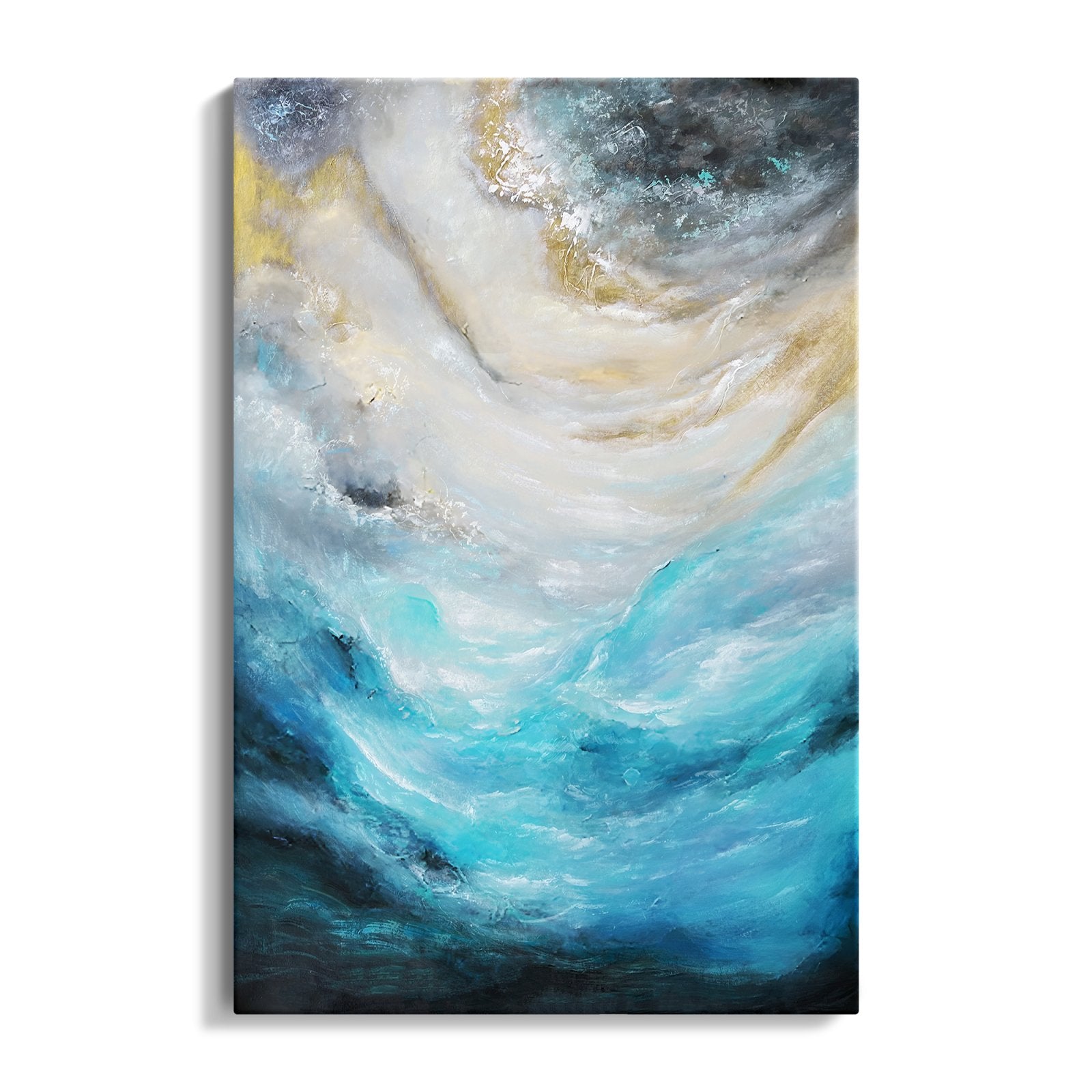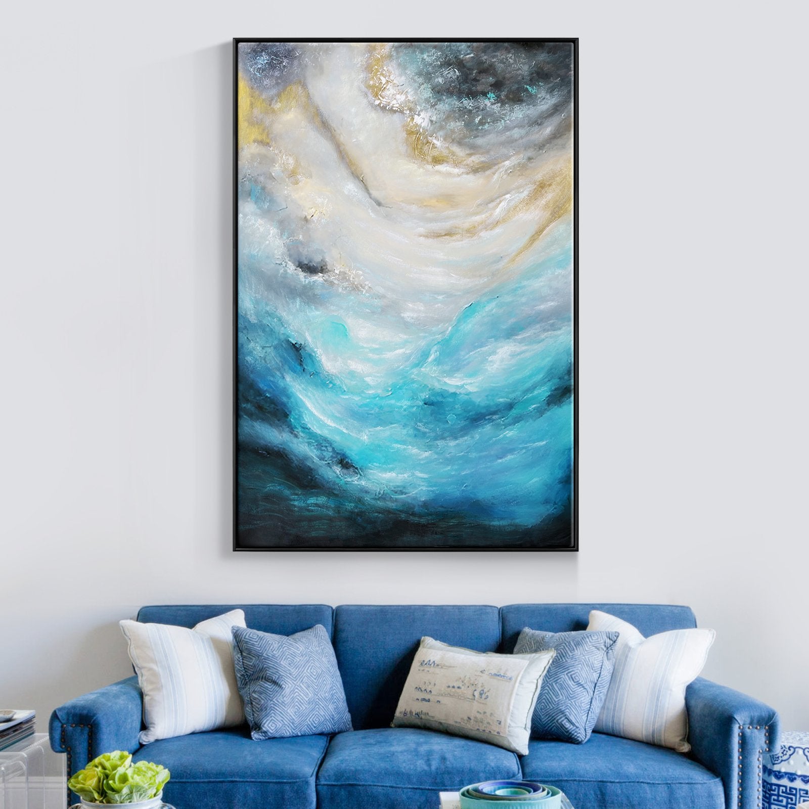 The vivid blue colours spark energy and beautifully blend towards more mysterious-looking, darker colours, resembling a powerful 'breeze' at a stormy sea. Waves crashing violently under a dark sky, what a sight to behold. This painting really comes alive.