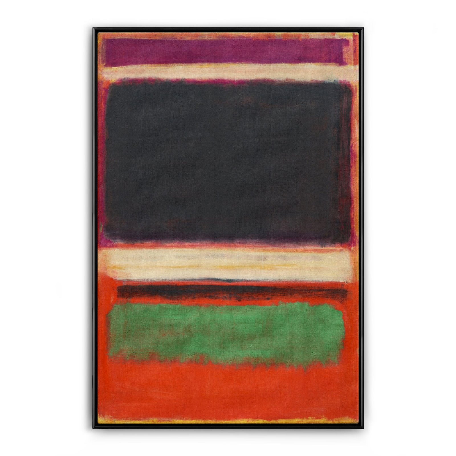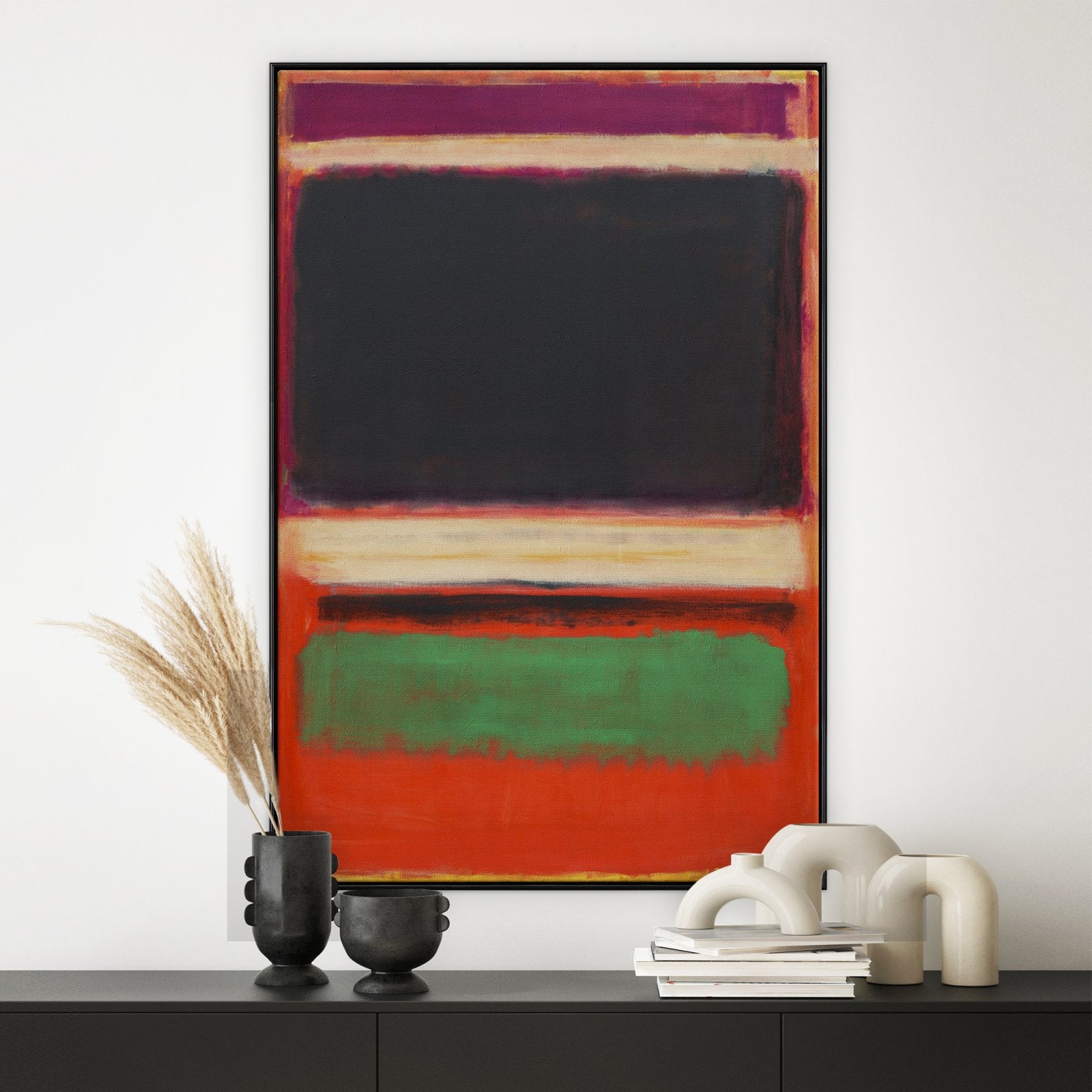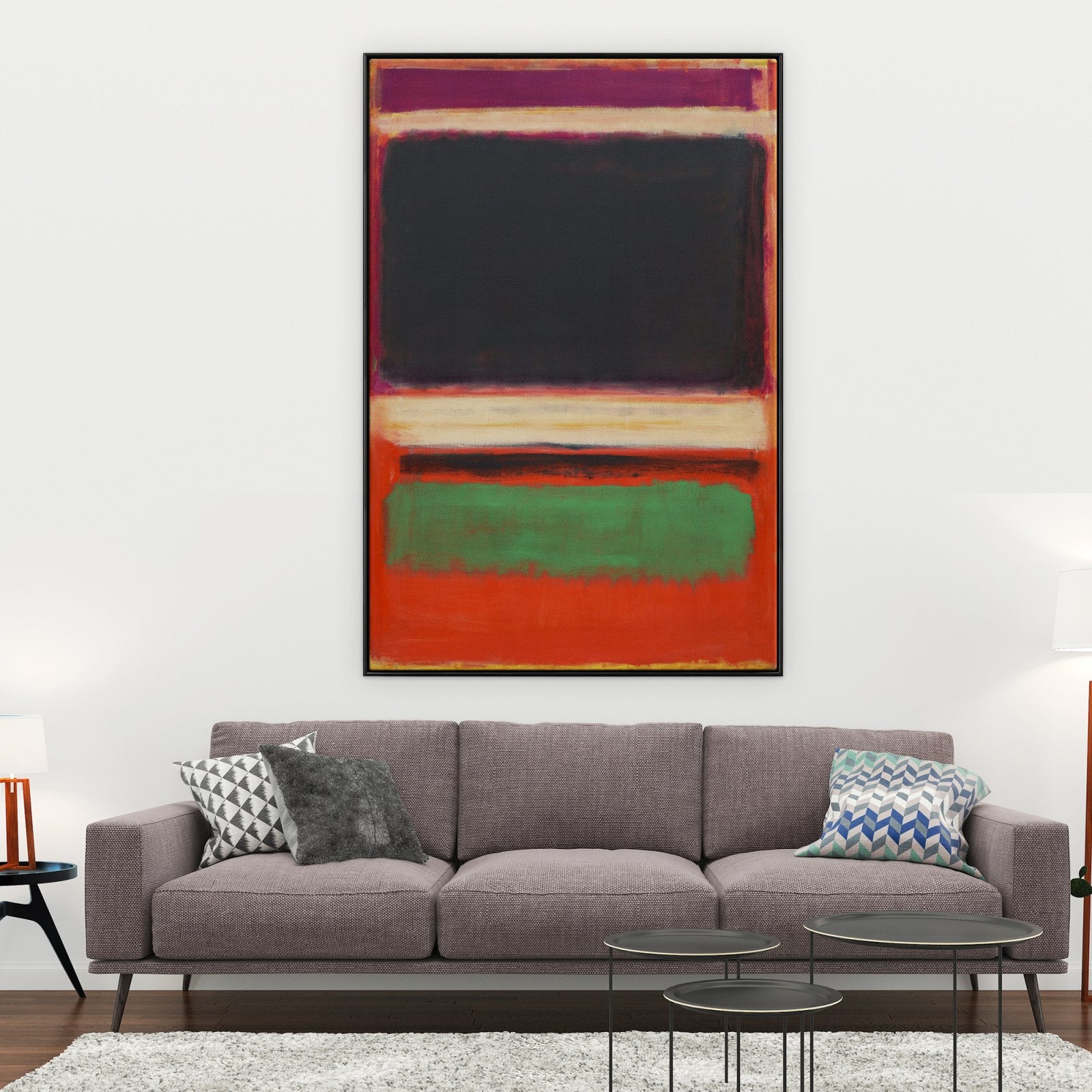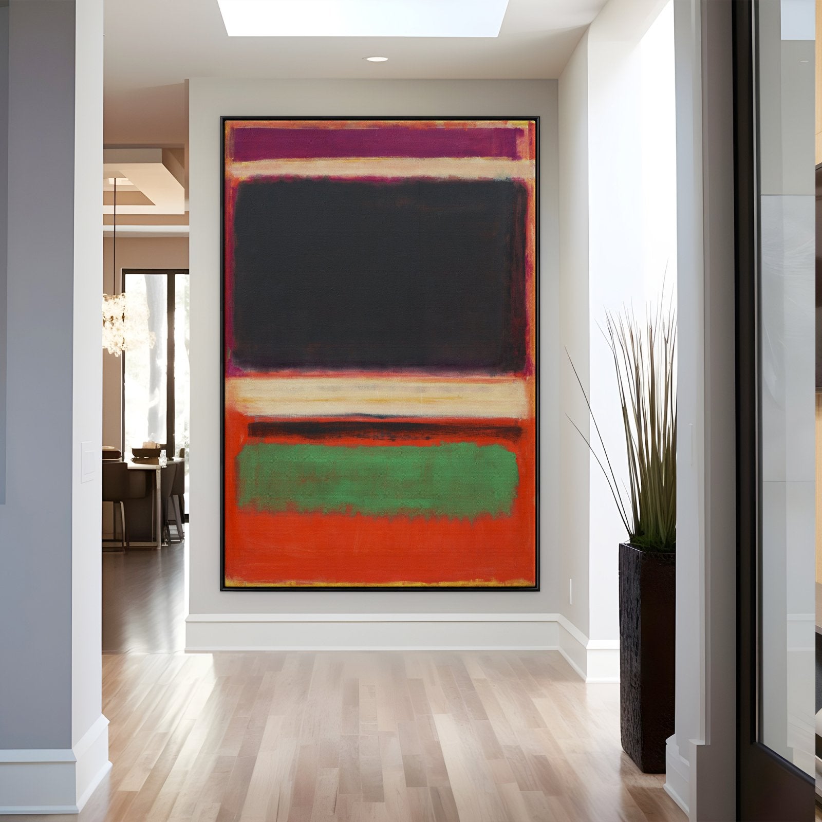 Seeing all the unusual colors blending together beautifully, it feels comforting and cozy. This modern art piece displays a minimal composition with a maximal result. The purple and green work stunningly with the orange background.