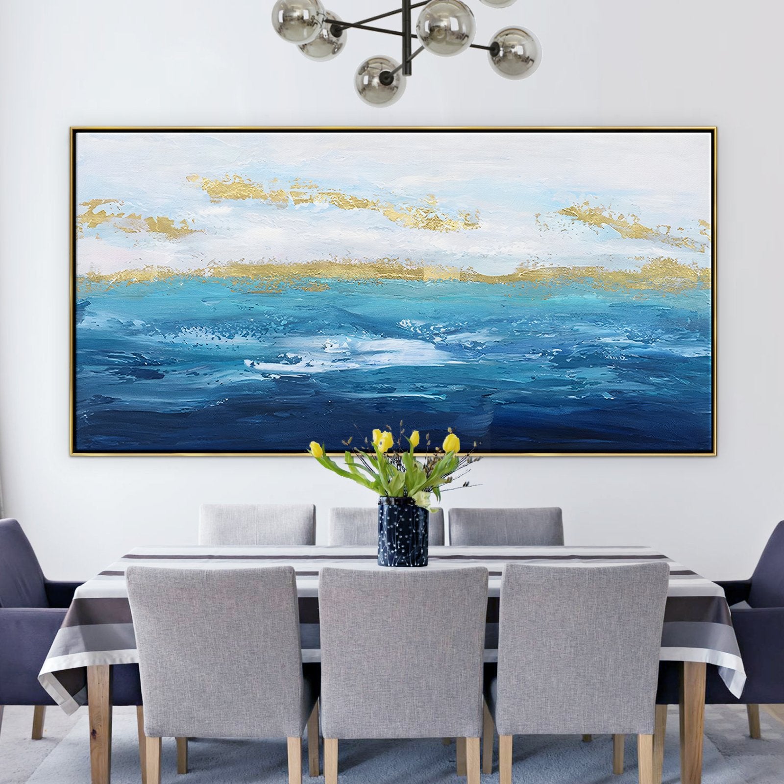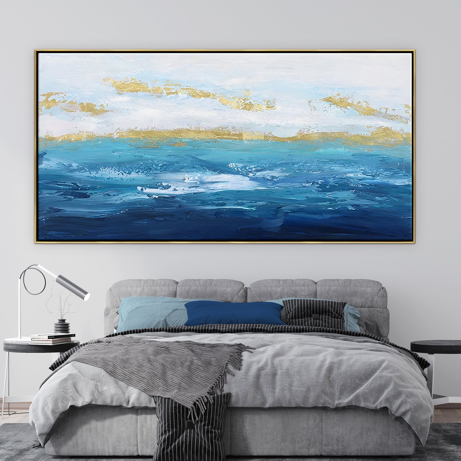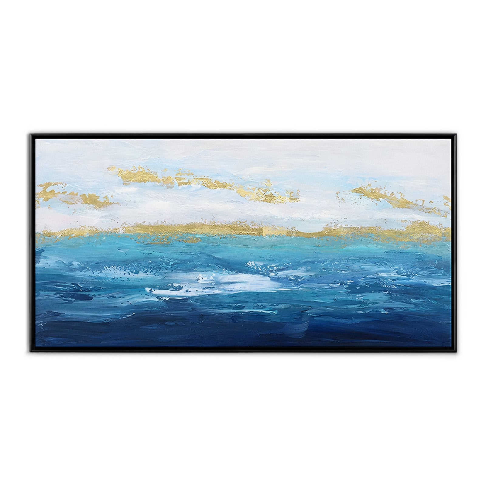 Deep Waters invites you to dive into its serene beauty. The rich blues and shimmering golds create a tranquil ocean scene, perfect for adding a touch of calm elegance to any room.