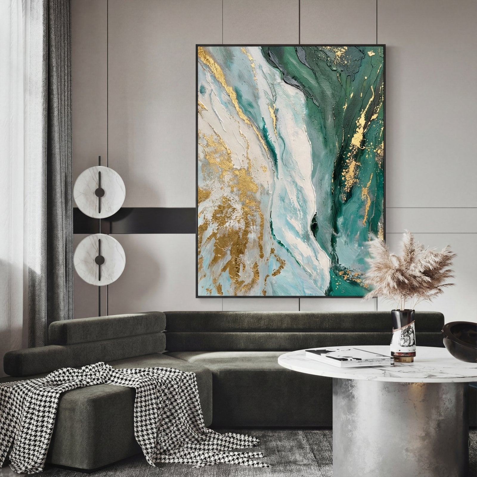 This amazing, abstract art piece portrays tremendous turquoise waves blending effortlessly with graceful, golden shores. ⁠
