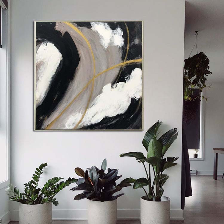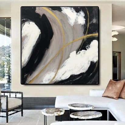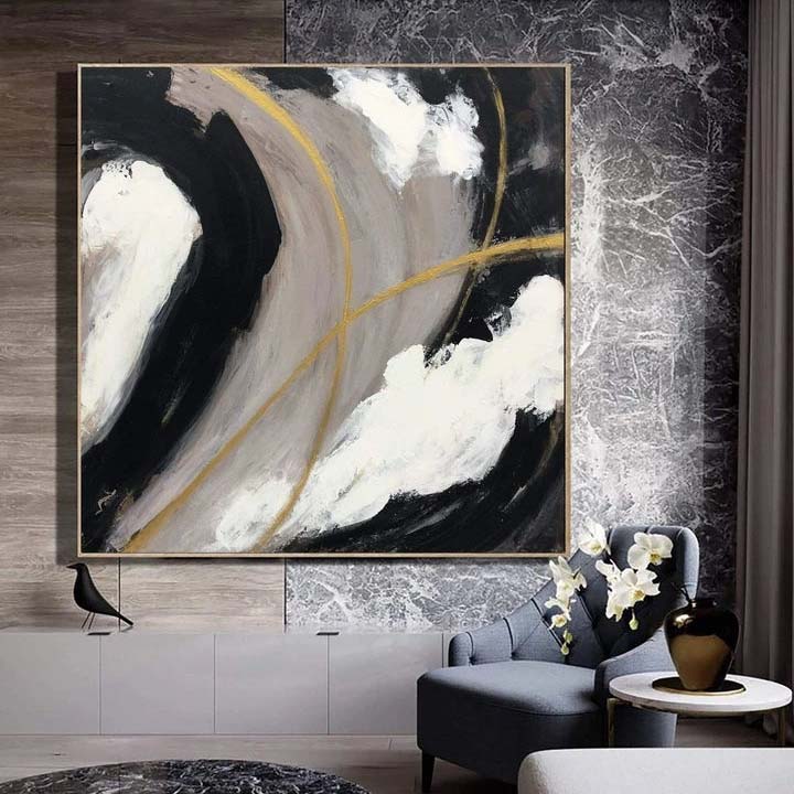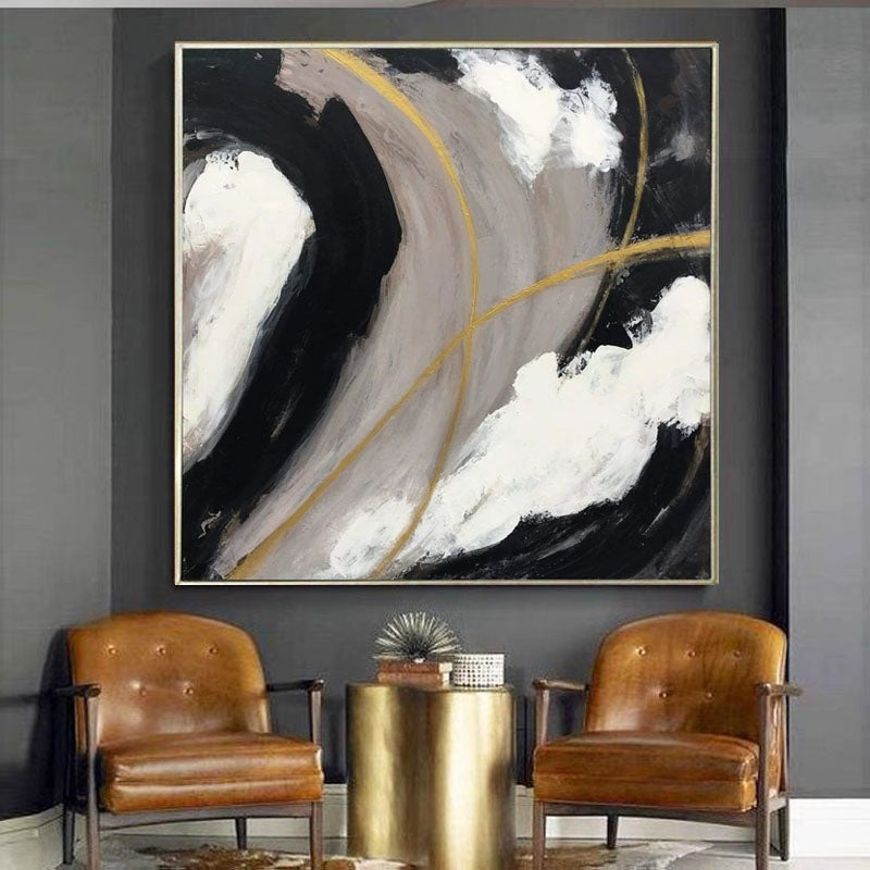 A beautiful sense of movement is created, giving this abstract painting a dynamic feel. The powerful contrasts and the touch of gold make this painting a stylish addition to any home interior!