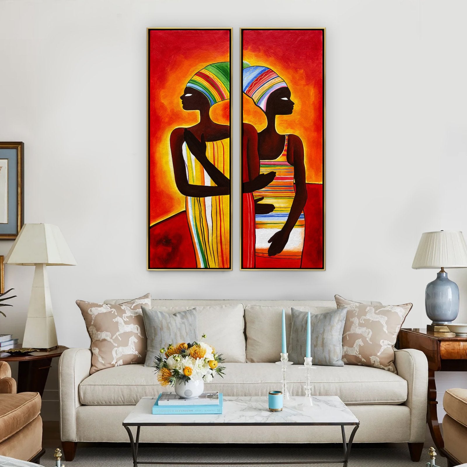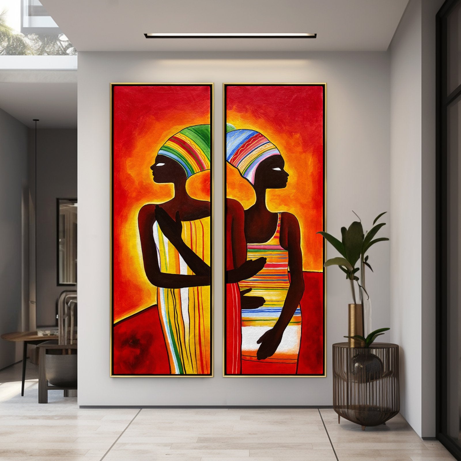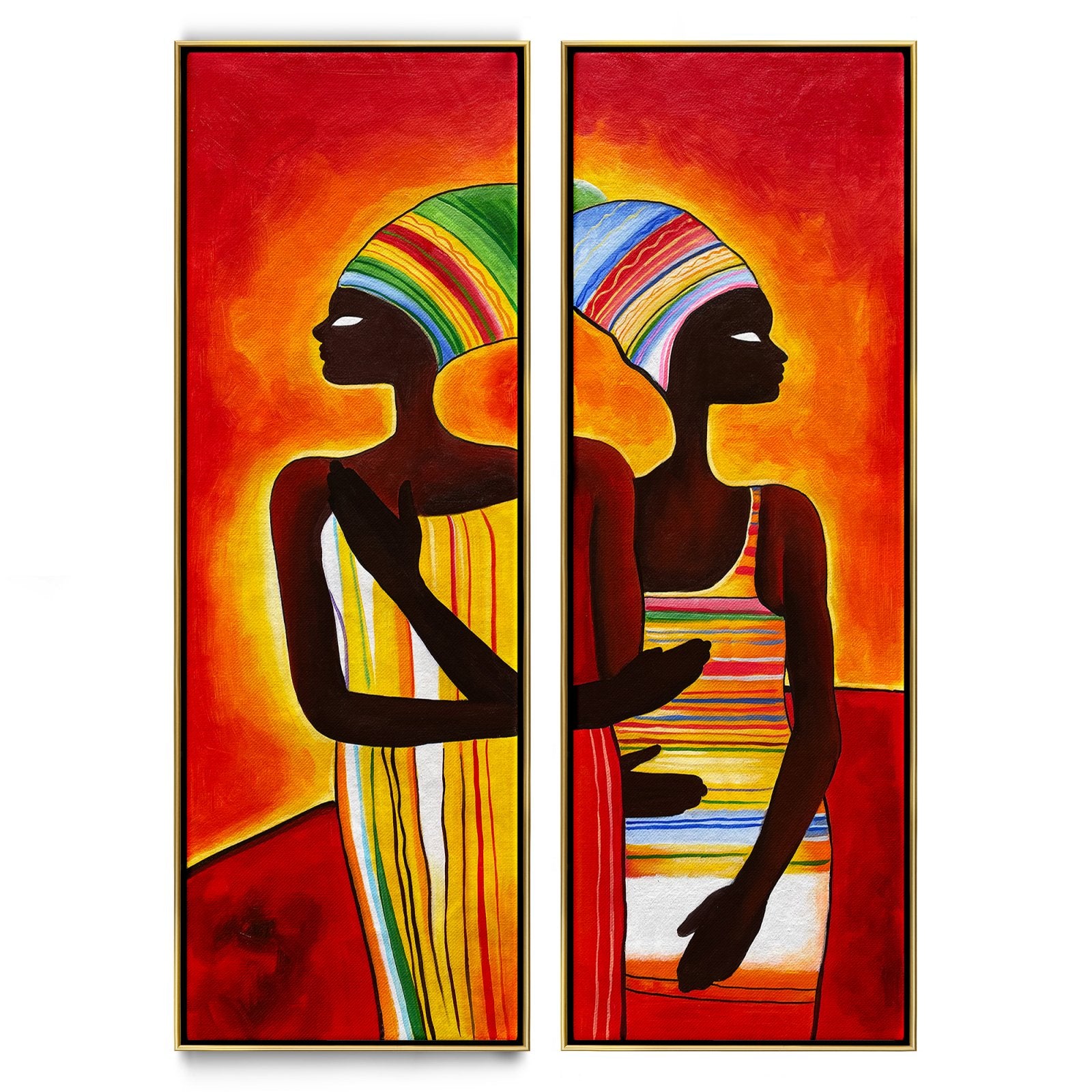 This double painting named "Hope's Sunset" features two African woman looking proud and strong. They look at the rising sun, dressed in beautiful colored clothes. The paintings depict hope and strength in the face of difficult times, a sunset signifying a new beginning.